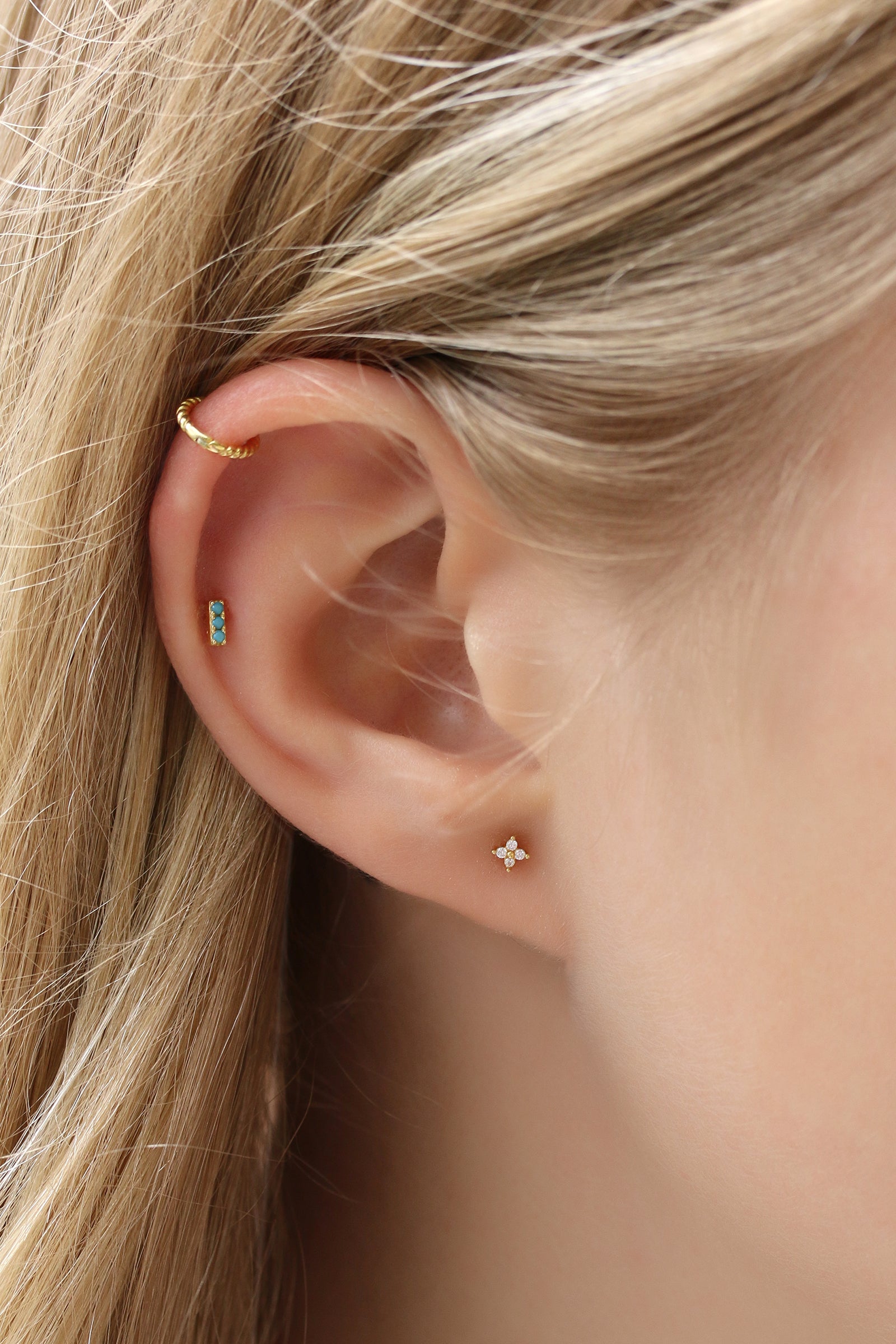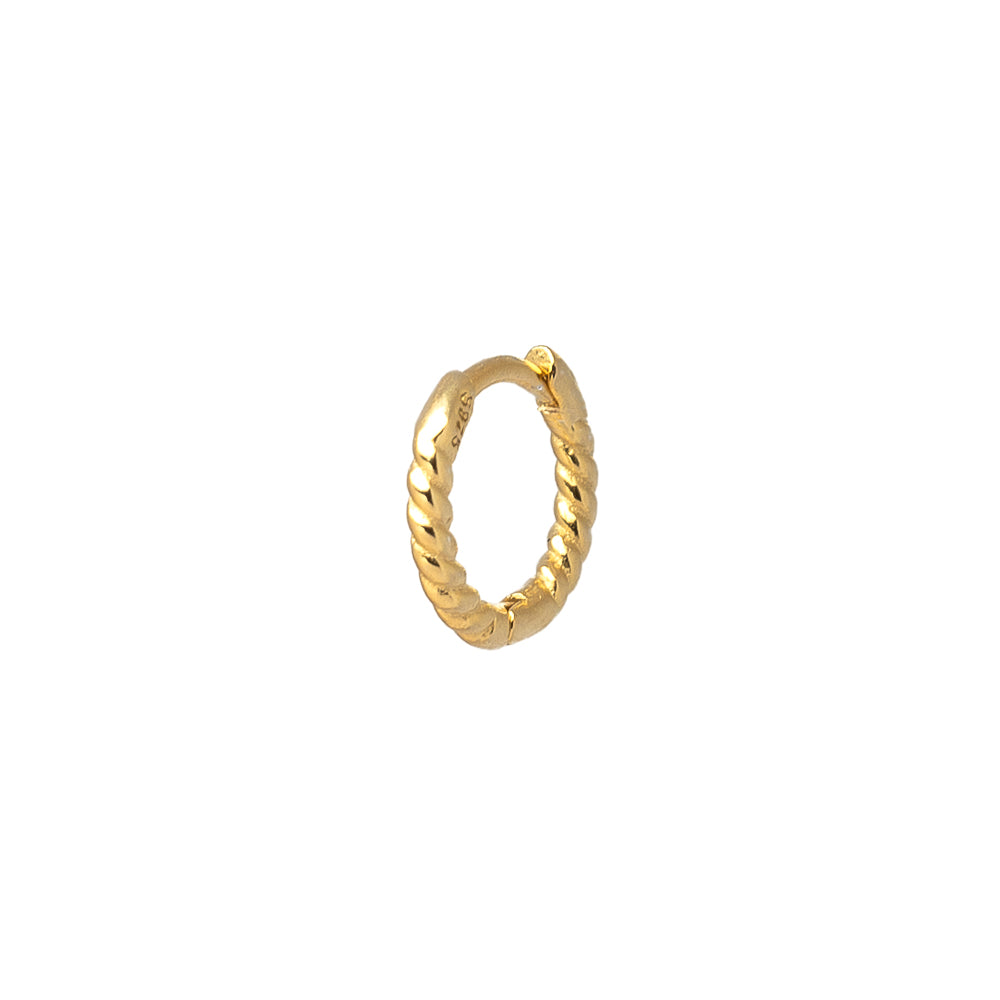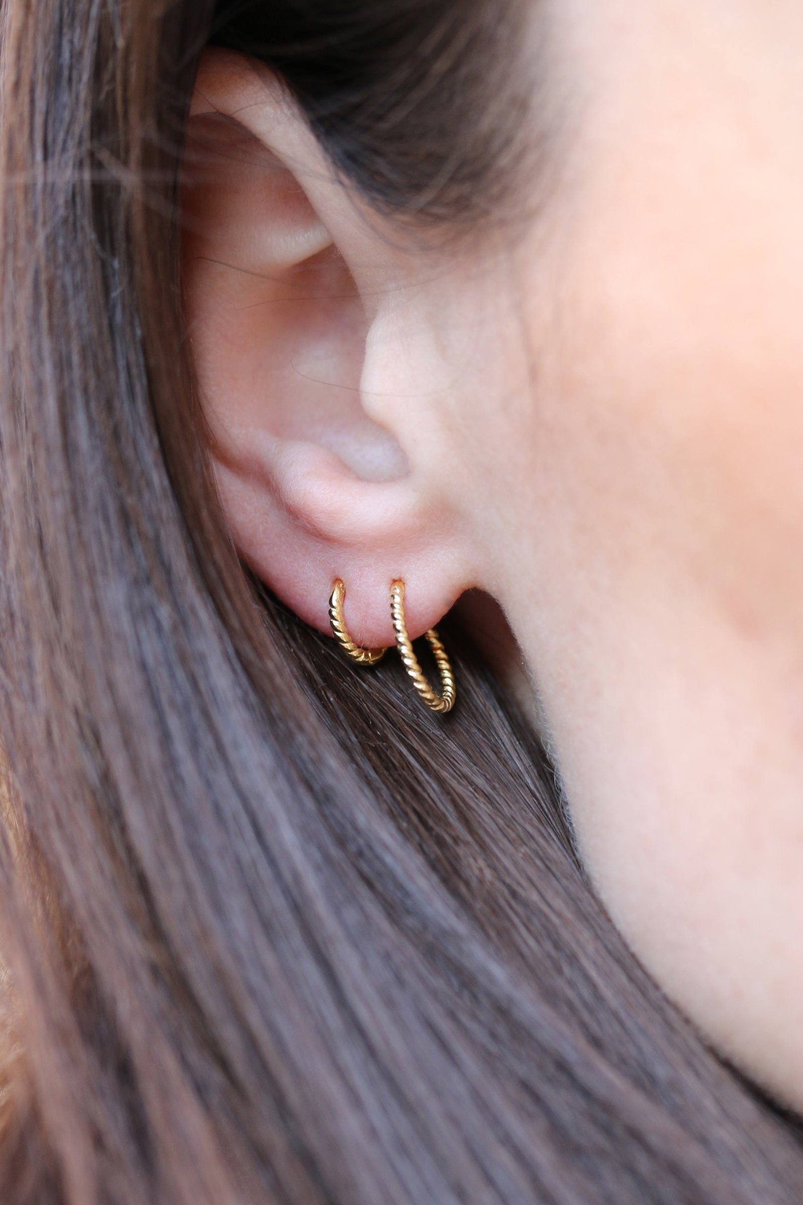 Die kleine Huggie Creole Twist aus vergoldetem 925 Silber ist ein Everyday Piece und eignet sich perfekt für dein zweites oder drittes Ohrloch. Sie ist erhältlich in 6 und 8 mm. Der Gelenkverschluss macht sie einfach in der Handhabung. Unser dunkelhaariges Model trägt die 6 mm Creole links und die 11 mm Creole Twist rechts am Ohr.