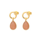Im Mittelpunkt steht ein tropfenförmiger Peach Moonstone, der mit seiner sanften, warmen Farbgebung alle Blicke auf sich zieht.