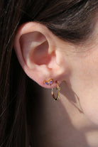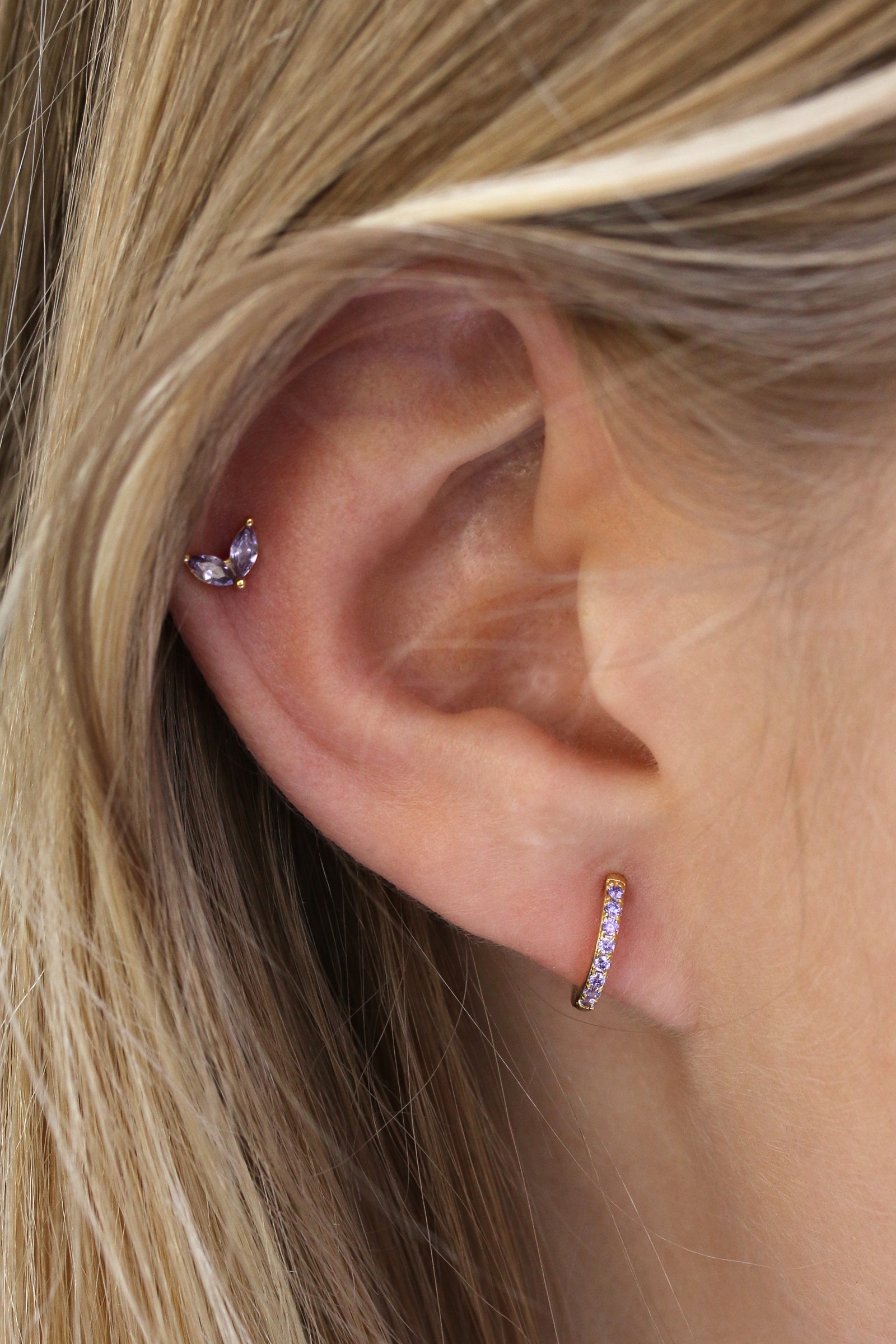 Der zweiblättrige goldene Ohrstecker funkelt Fliederfarben am Ohr. Die Olive-Serie ist inspiriert von Olivenblättern in vielen schönen Farb-Nuancen.