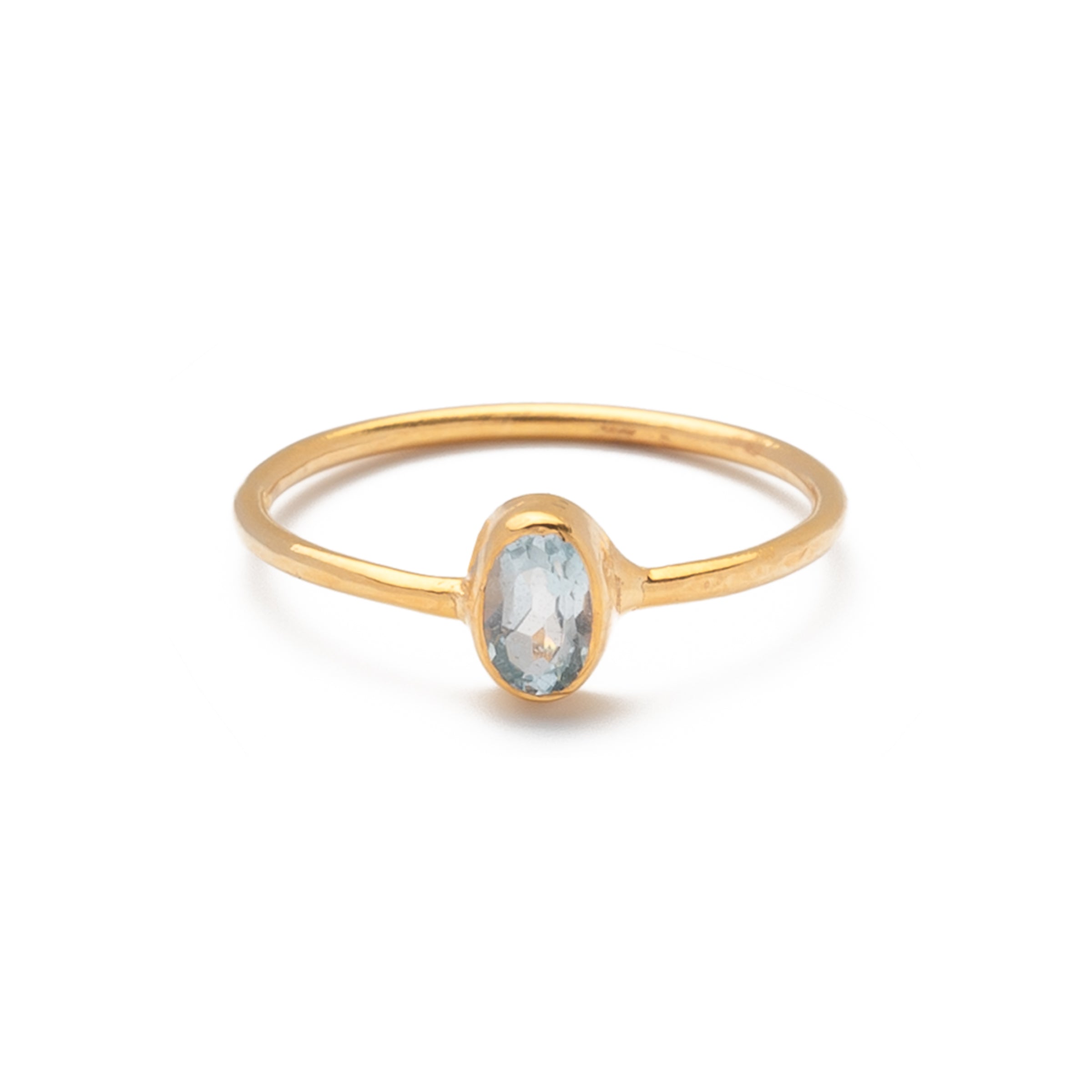 Ein zarte Versuchung ist der Ring mit Blauem Topas aus unserer Gemstone-Serie. An der dünnen Ringschiene aus vergoldetem 925 Sterling Silber wird der ovale Edelstein mit seiner blassblauen Farbe zum funkelnden Mittelpunkt. Der Stein ist transparent und lichtdurchlässig. Die passenden Ohrstecker mit Blauem Topas findest du hier.