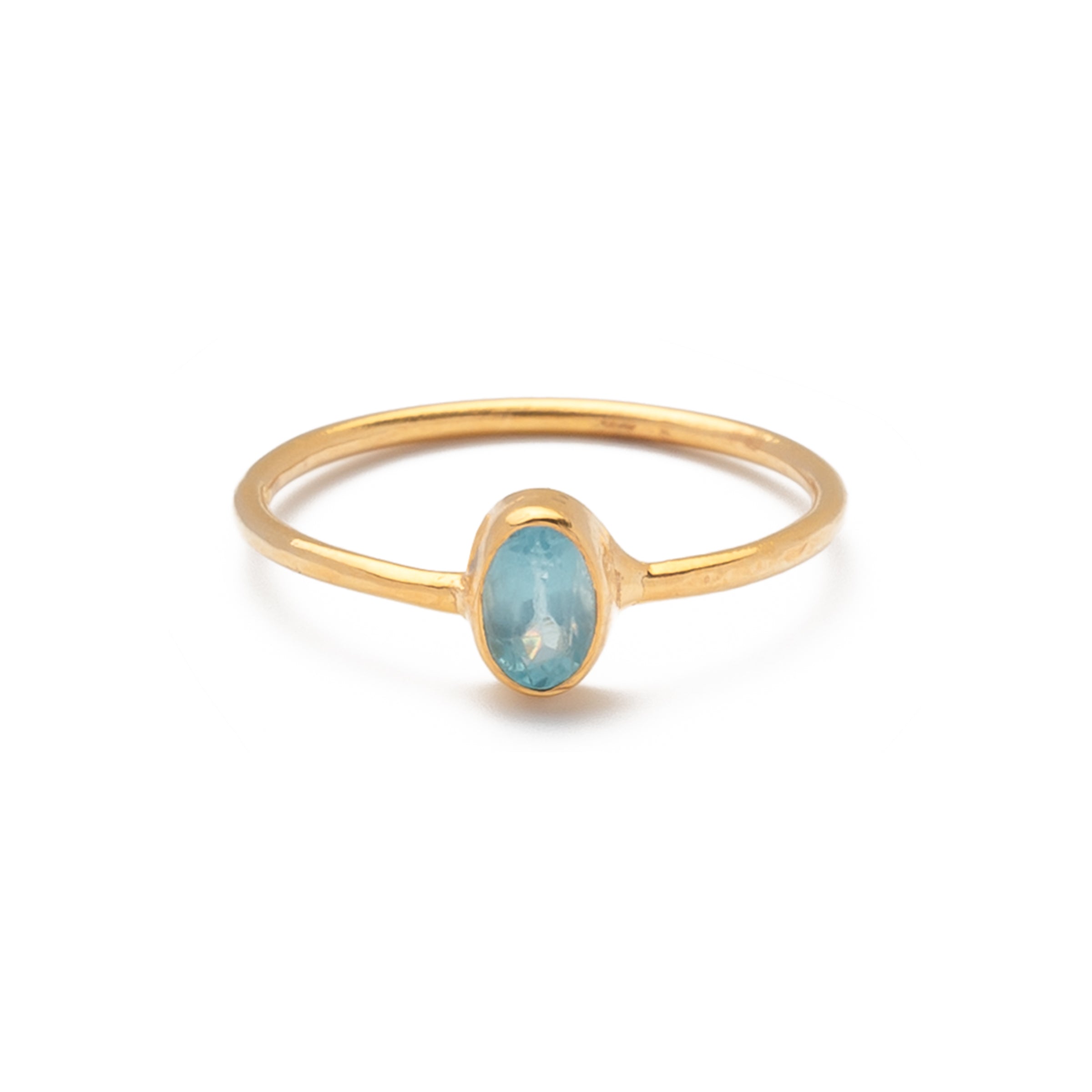 Ein zarte Versuchung ist der Ring mit einem Apatitstein aus unserer Gemstone-Serie. An der dünnen Ringschiene aus vergoldetem 925 Sterling Silber wird der ovale Edelstein mit seiner türkisblauen Farbe zum strahlenden Mittelpunkt. Der Stein ist milchig trüb und lichtdurchlässig.