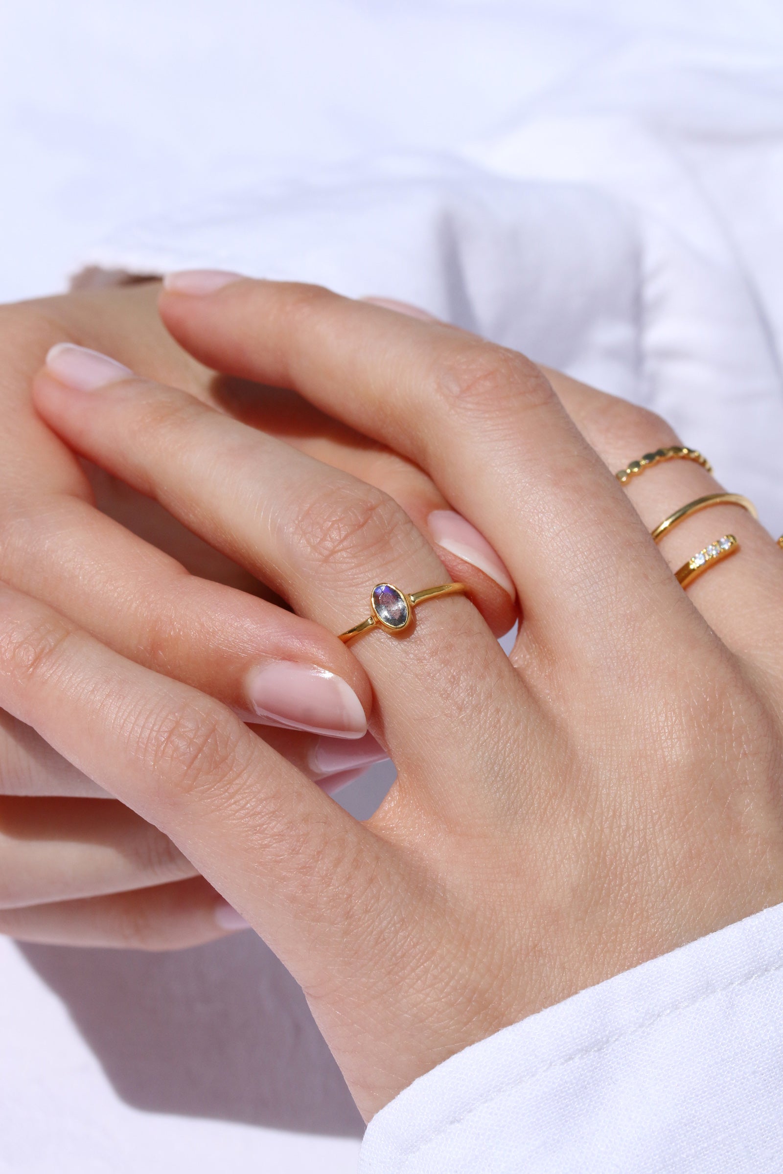 Der Ring ist aus 925 Silber und mit einer 18k Goldschicht veredelt. Das Ringband misst ca. 1 mm. Der ovale Halbedelstein misst 4 x 2,5 mm. Es handelt sich um Natursteine, die sich in Firm und Farbe unterscheiden und daher vom Bild abweichen können. Das Modell gibt es auch mit Blauem Topaz, Grüner Jade und Rosenquarz in unserer Sweet-Gem-Serie.