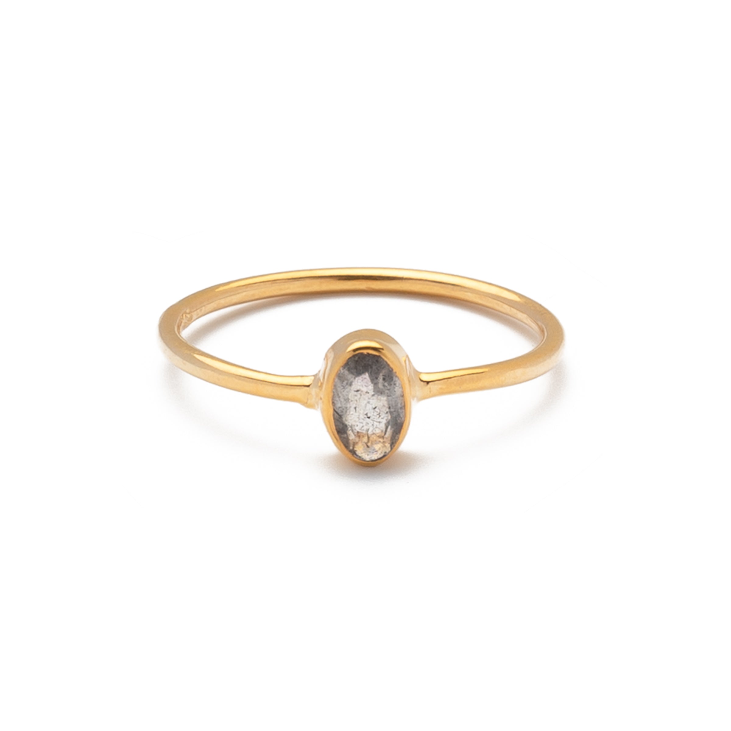 Ein zarte Versuchung ist der Ring mit einem Stein aus Labradorit aus unserer Gemstone-Serie. An der dünnen Ringschiene aus vergoldetem 925 Sterling Silber wird der ovale Edelstein mit seiner hellgrauen Farbe zum strahlenden Mittelpunkt. Der Stein ist trüb bis lichtdurchlässig.