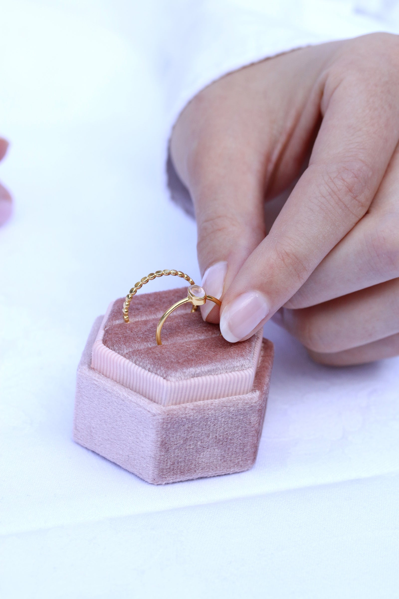 Der Ring ist aus 925 Silber und mit einer 18k Goldschicht veredelt. Das Ringband misst ca. 1 mm. Der ovale Halbedelstein misst 4 x 2,5 mm. Es handelt sich um Natursteine, die sich in Firm und Farbe unterscheiden und daher vom Bild abweichen können. Das Modell gibt es auch mit Blauem Topaz, Grüner Jade und grauem Labradorit in unserer Sweet-Gem-Serie.