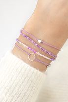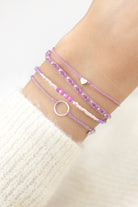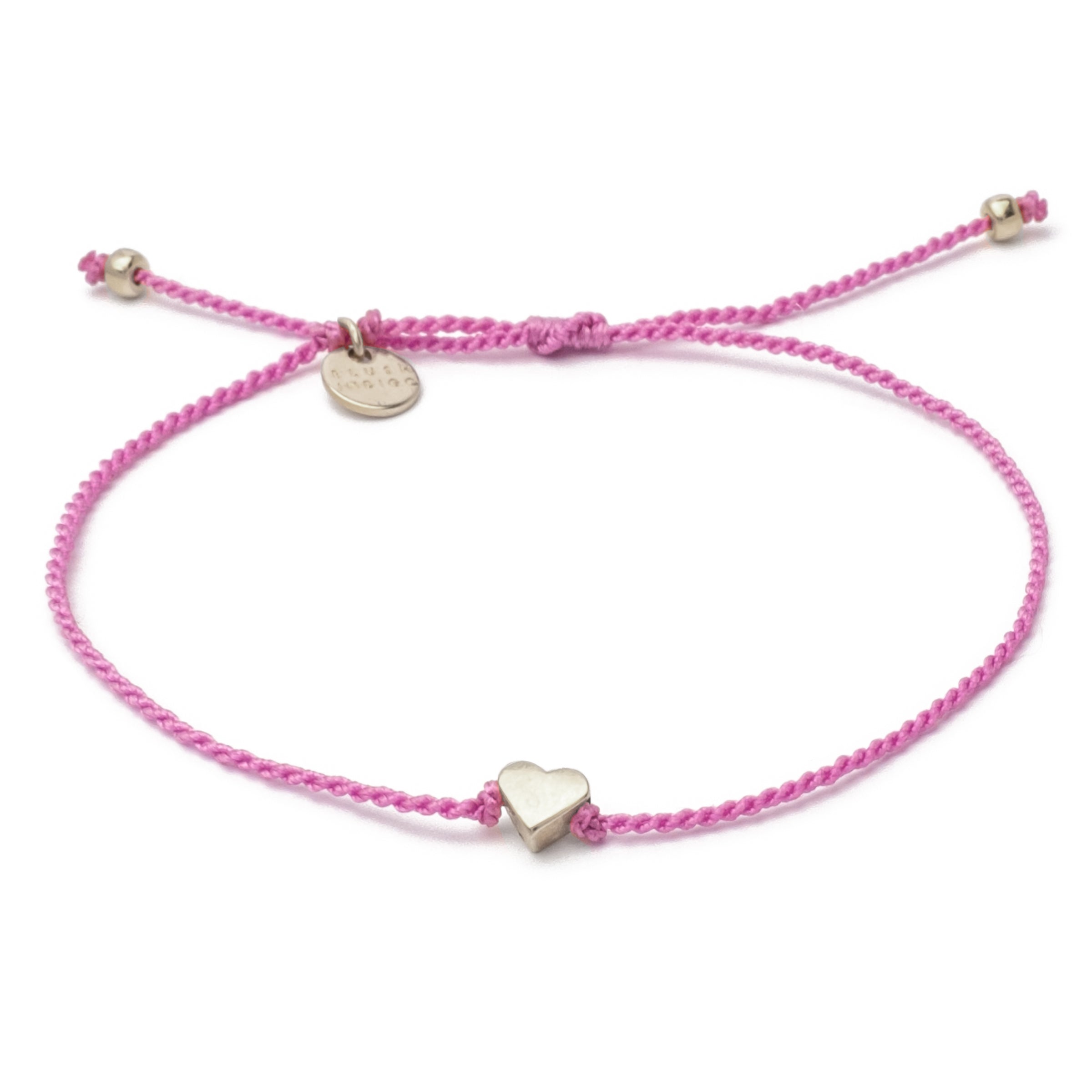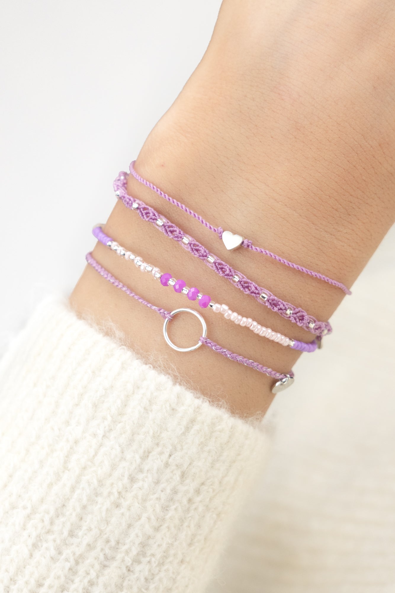 Das Modell in einem strahlenden Violett hat einen verstellbaren Knotenverschluss und mit Perlen verzierte Endstücke. Das Armband ist in vielen weiteren Farben und auch mit einem goldenen Herzen erhältlich.