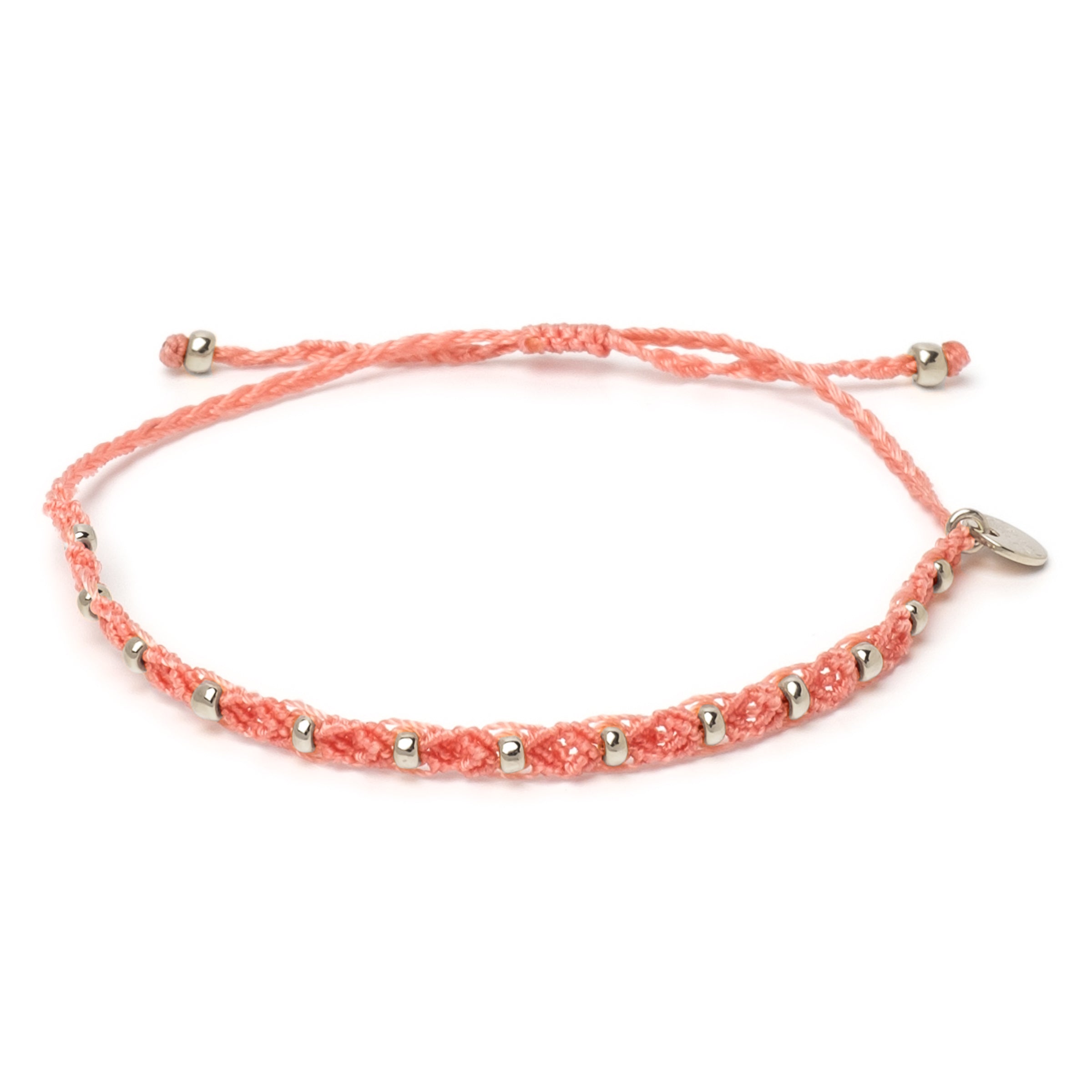 Makramé bezeichnet eine aus dem Orient stammende Knüpftechnik zur Herstellung von Ornamenten, Textilien oder Schmuck. Alle Armbändchen werden in Bali und Java handgeknüpft und mit Liebe zum Detail mit silbernen Glasperlen bestickt.