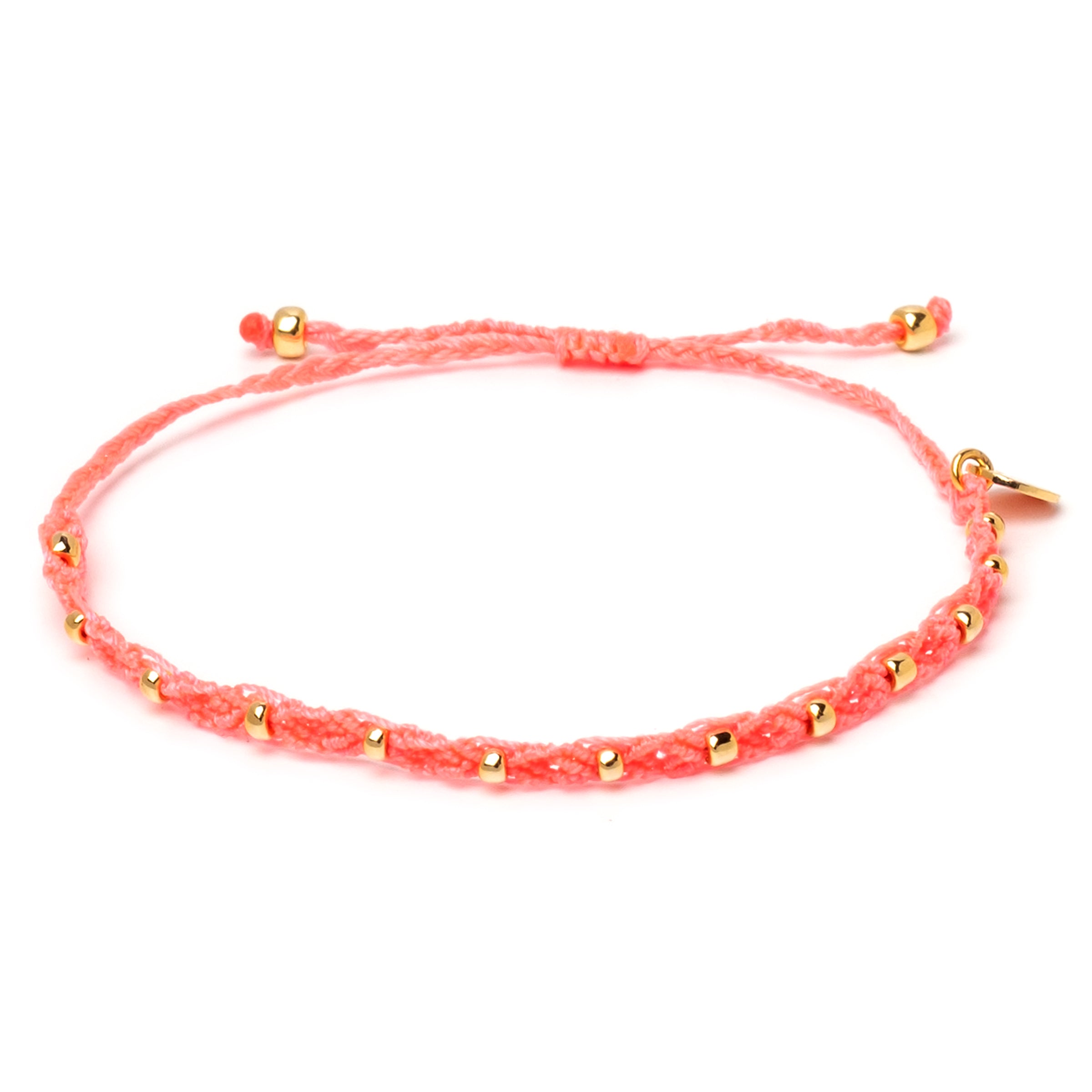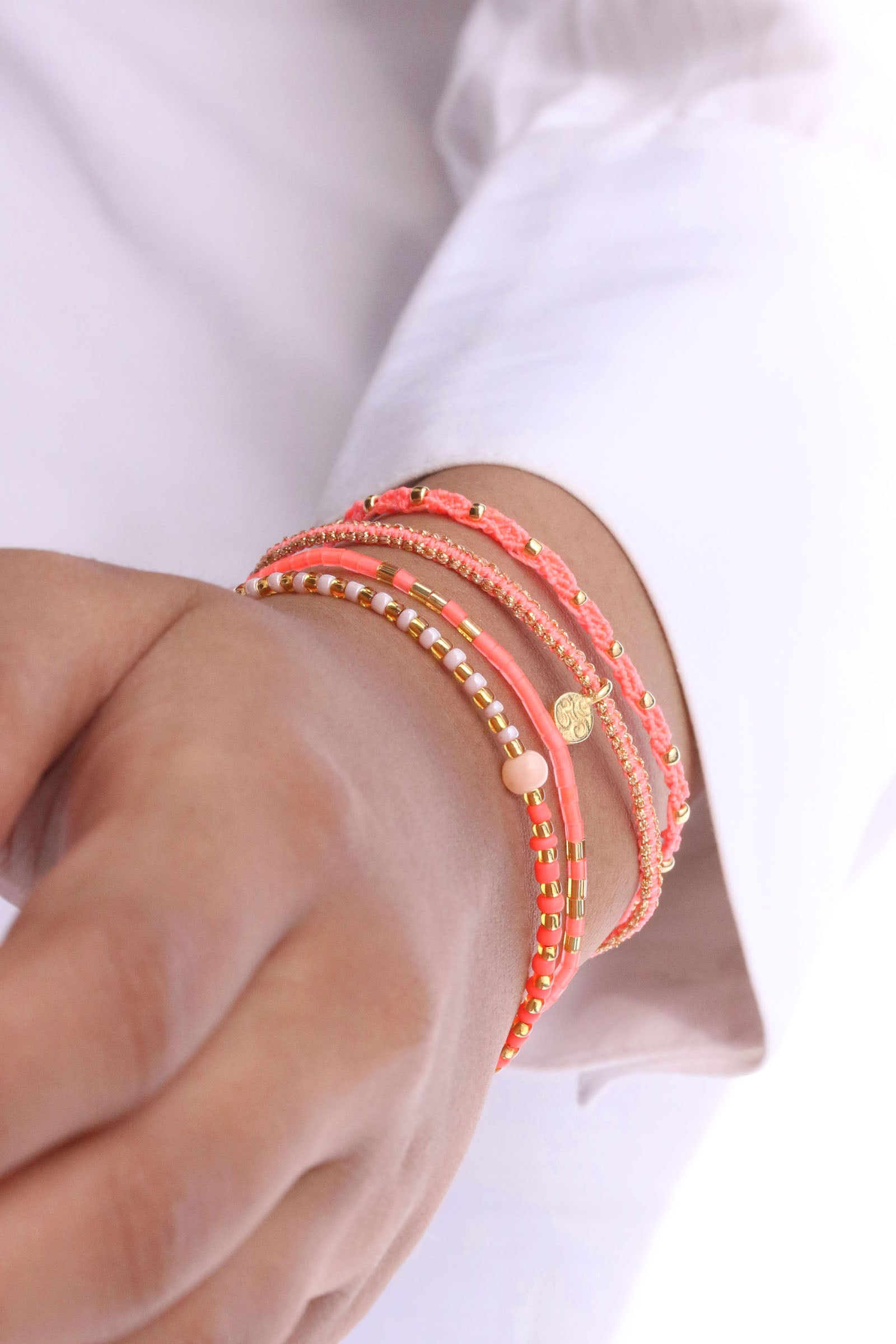 Unser einfarbiges Makramé-Armband Cleo kommt in allen Farben des Regenbogens daher. Das Modell in einem strahlenden Neon Coral hat einen verstellbaren Knotenverschluss und mit Perlen verzierte Endstücke.