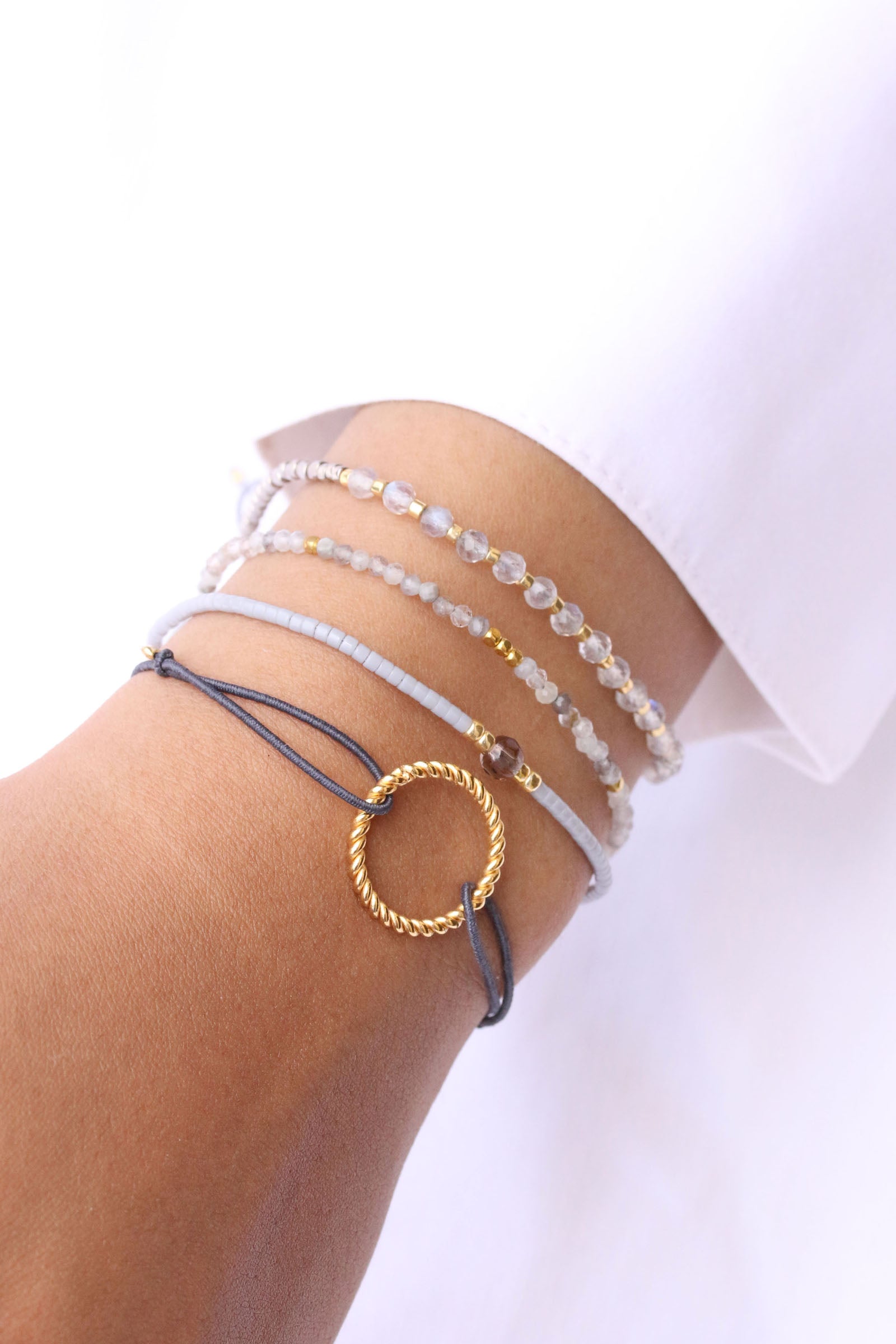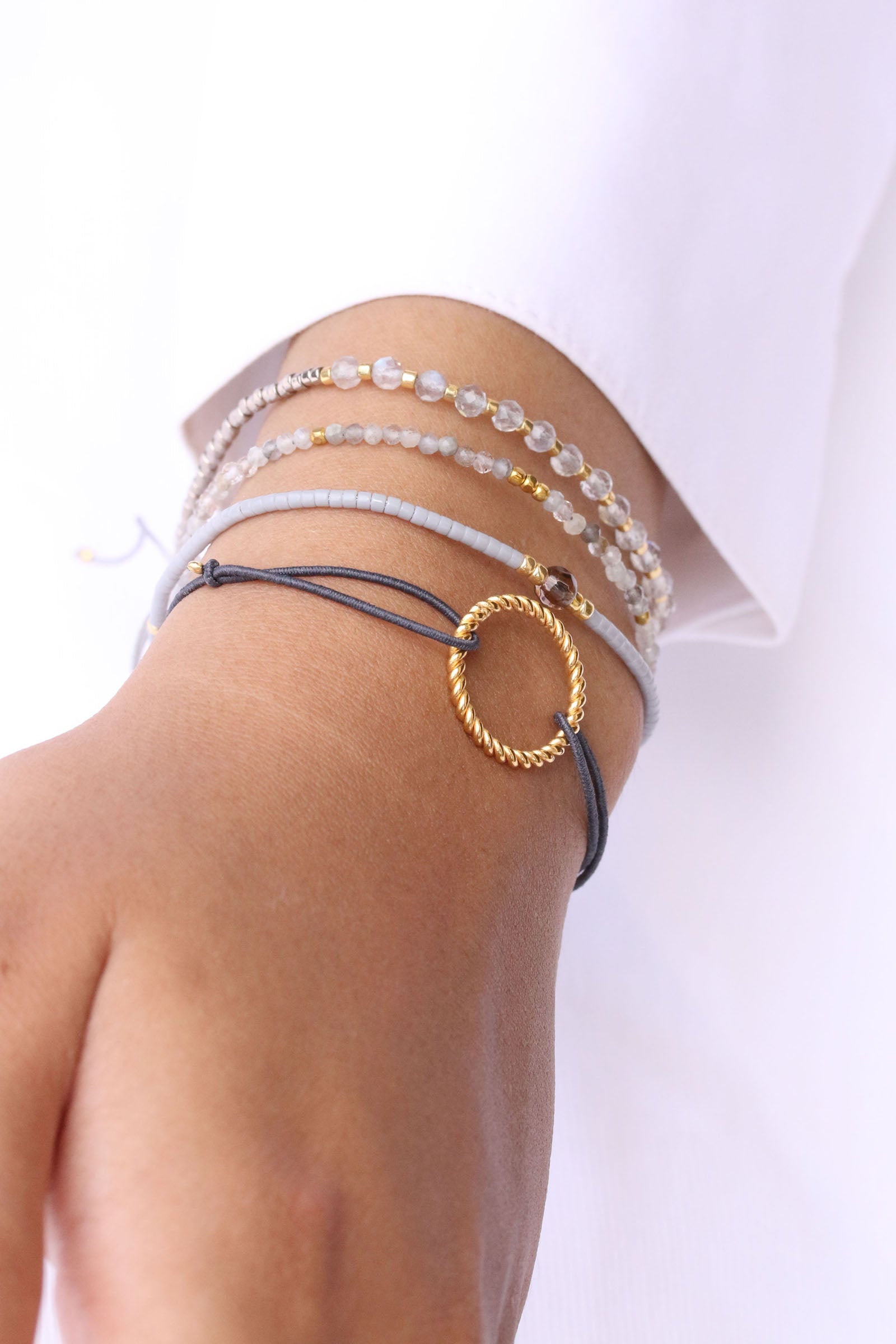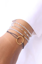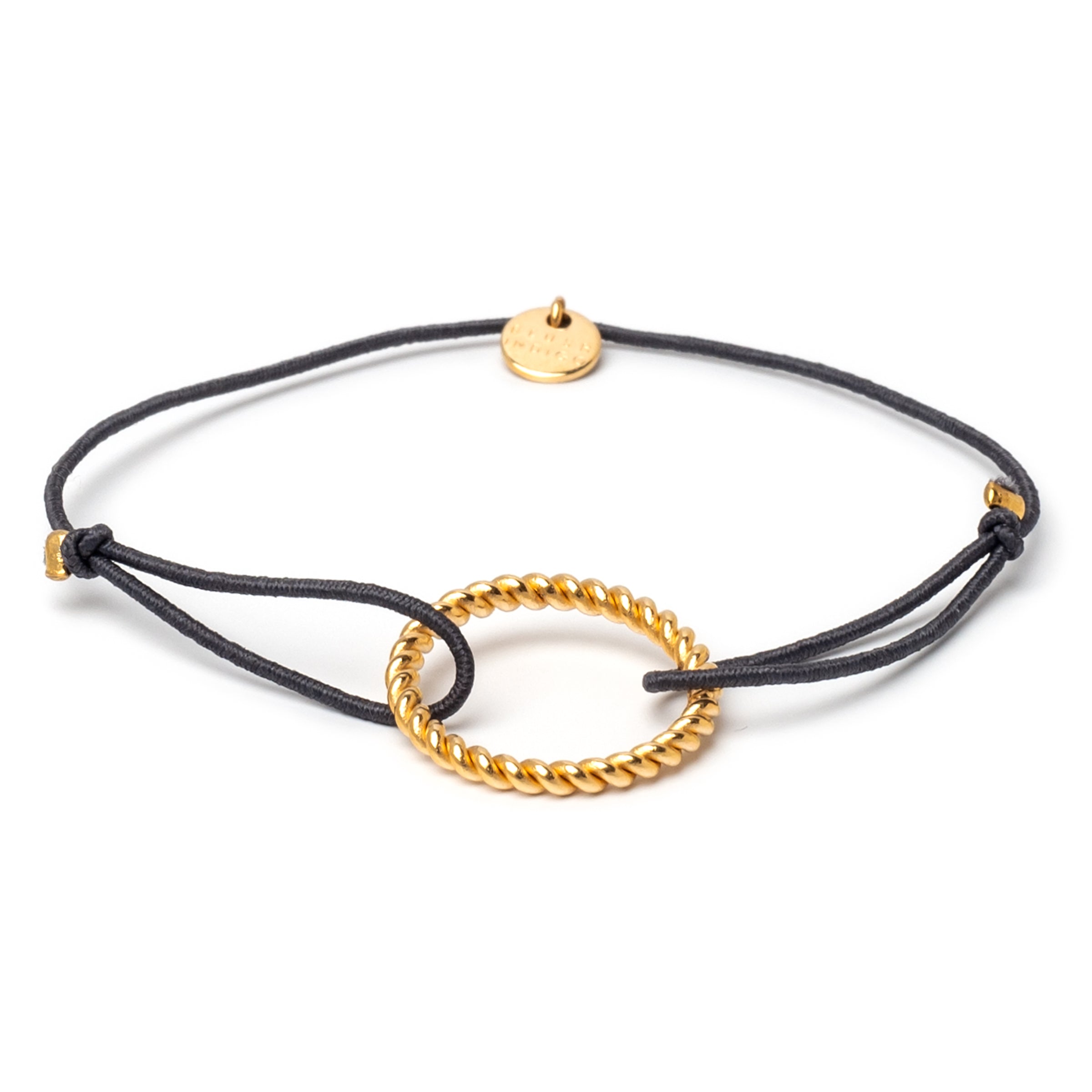 Das Armband Darling Circle hat das Zeug zum Lieblingsstück in deinem Schmuckkästchen. Das elastische Nylon-Band in Dunkelgrau schmiegt sich elegant an dein Handgelenk. Strahlender Mittelpunkt ist der gedrehte kreisförmige Circle-Anhänger aus 24k vergoldetem Edelstahl.