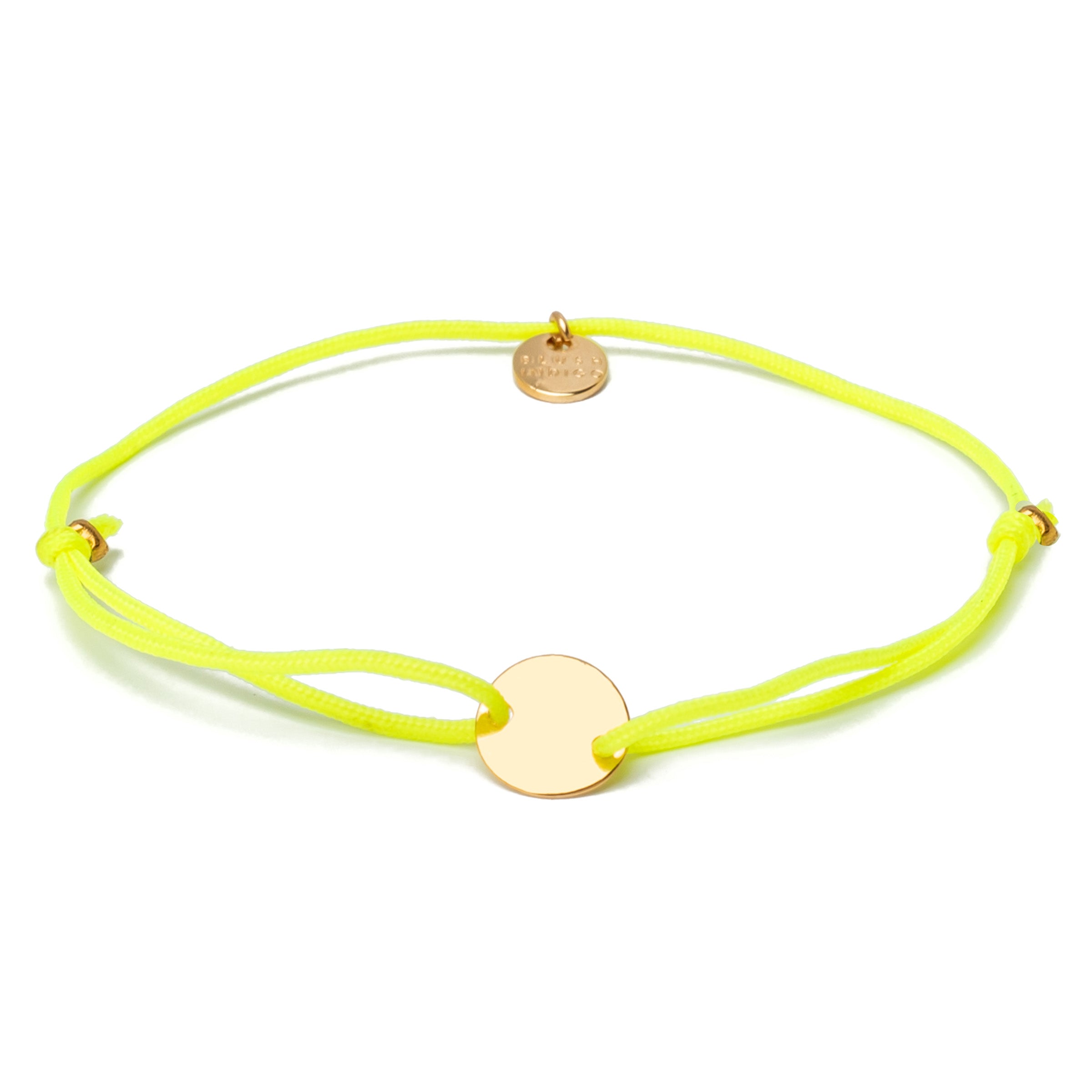 An dem verstellbaren Nylonbändchen in Neongelb kann das kreisrunde goldene Plättchen richtig glänzen. Der Anhänger ist mittig fixiert, so dass er nicht verrutschen kann.
