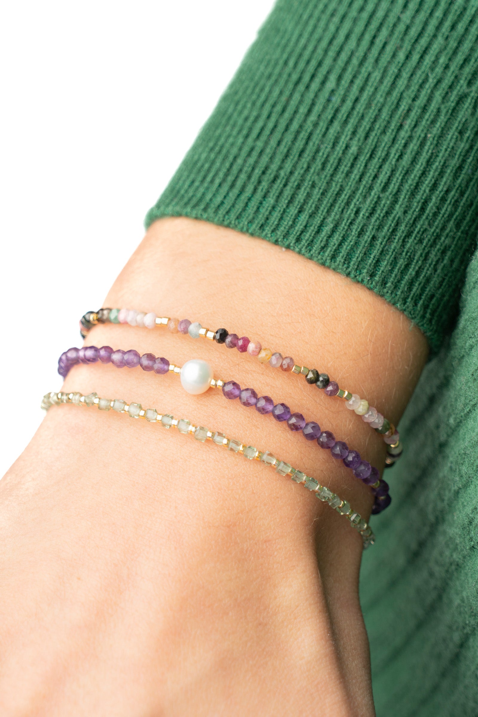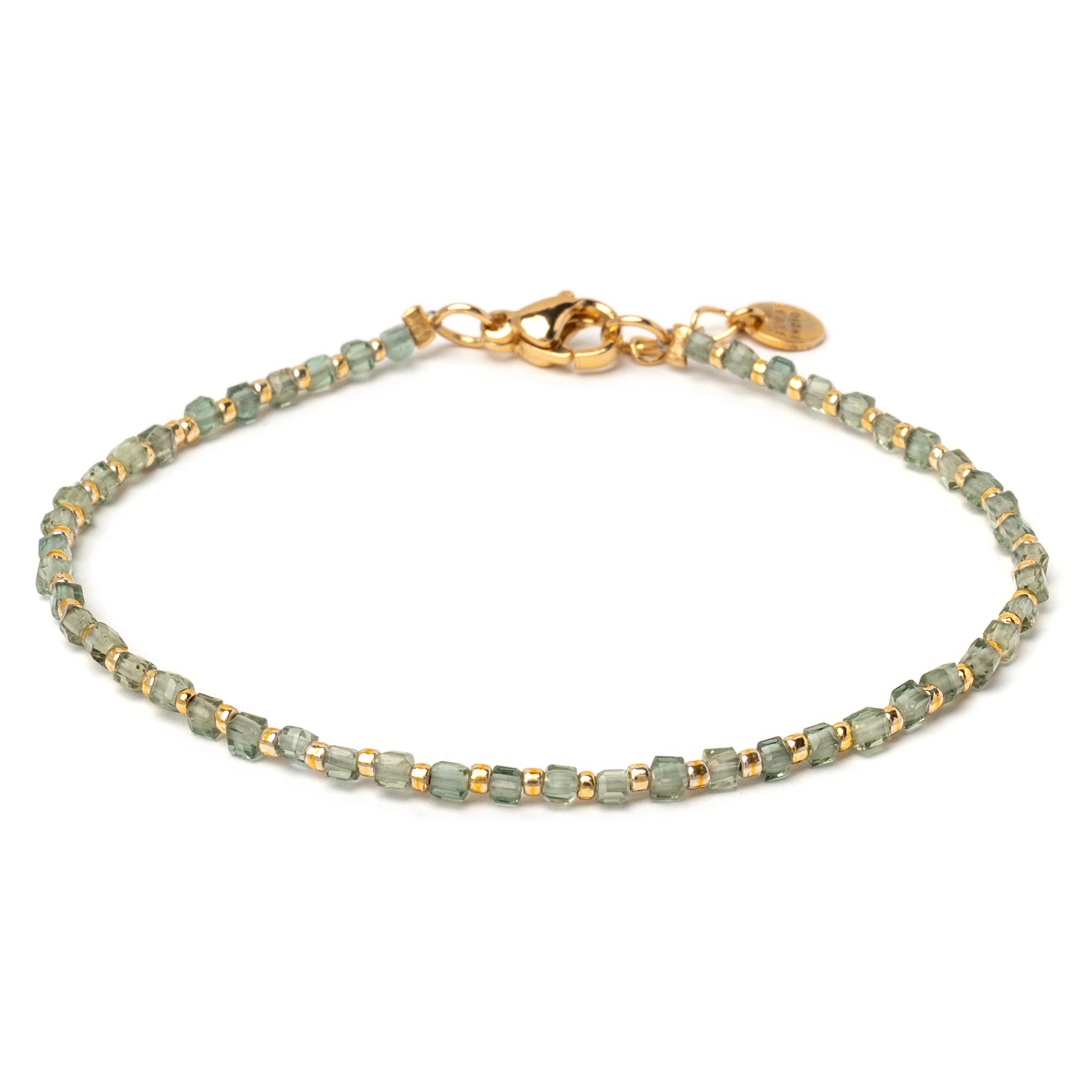 Unser Gemma-Armband mit würfelförmigen grünen Apatitsteinen funkelt in einem zarten Grünton. Vereinzelte goldene Perlen setzen elegante Akzente.
