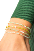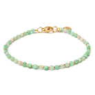 Unser Gemma-Armband mit würfelförmigen Chrysoprasen schimmert in Farbnuancen von Mintgrün bis Türkisblau. Vereinzelte goldene Perlen setzen elegante Akzente.