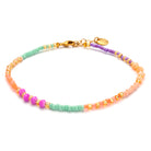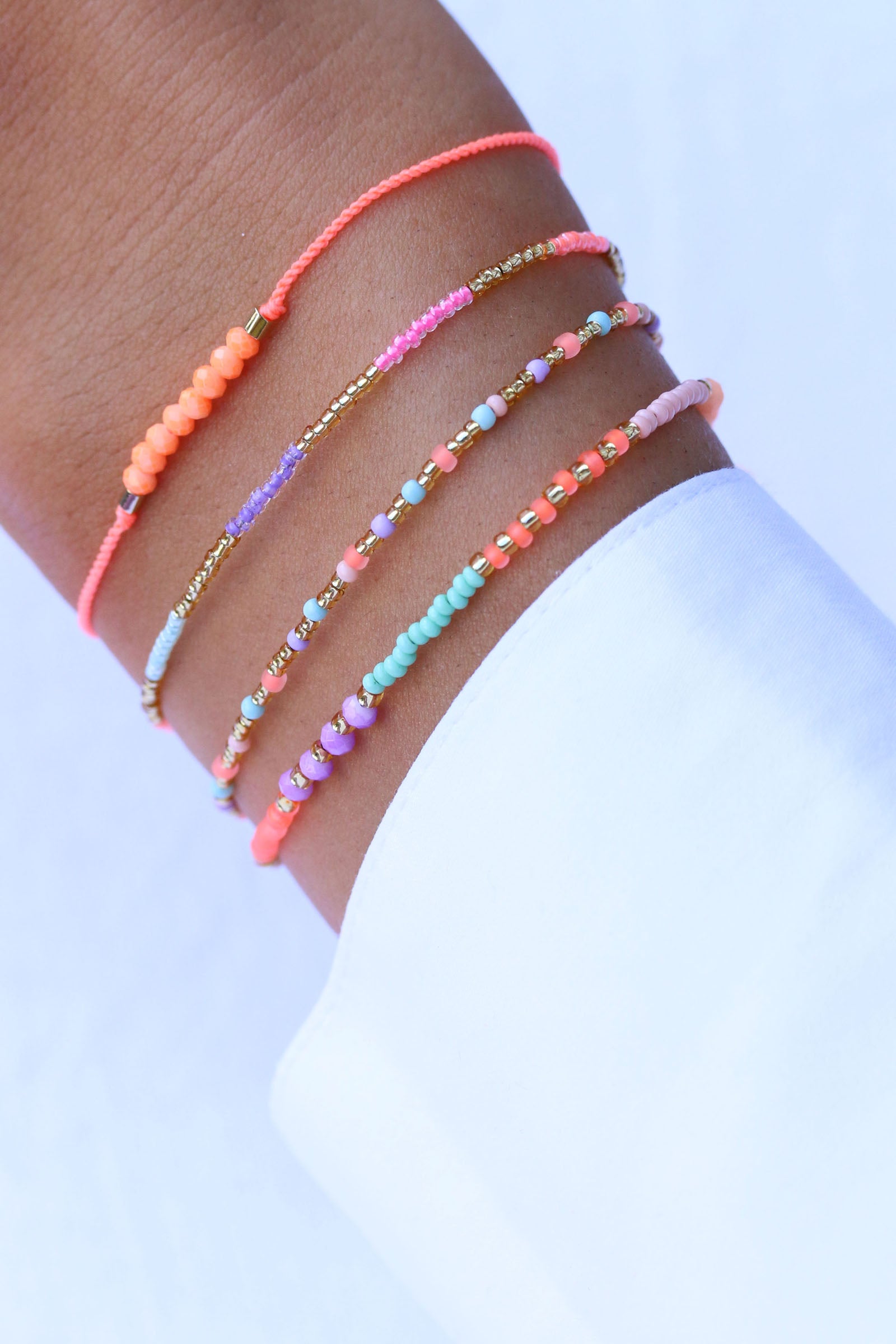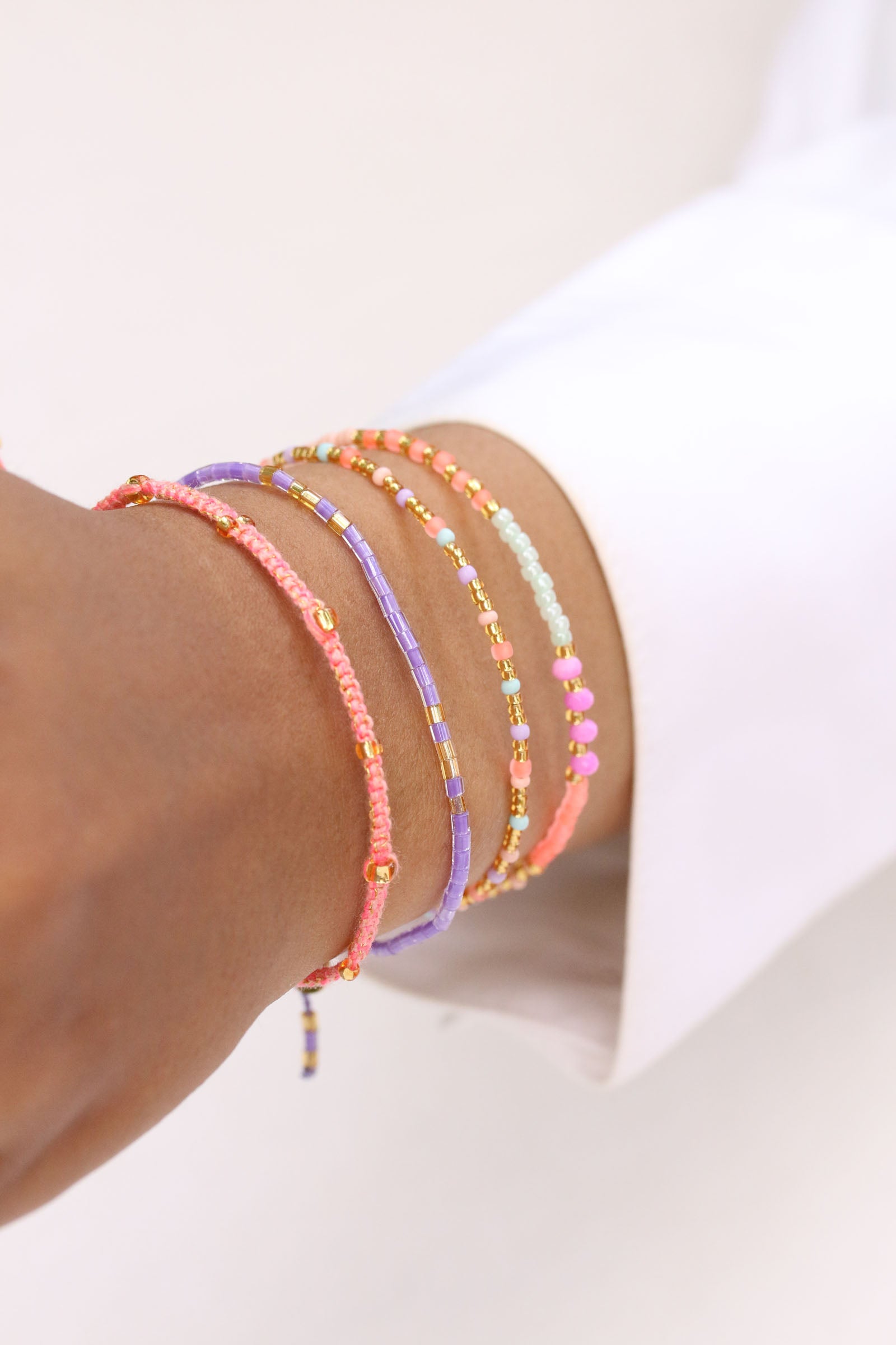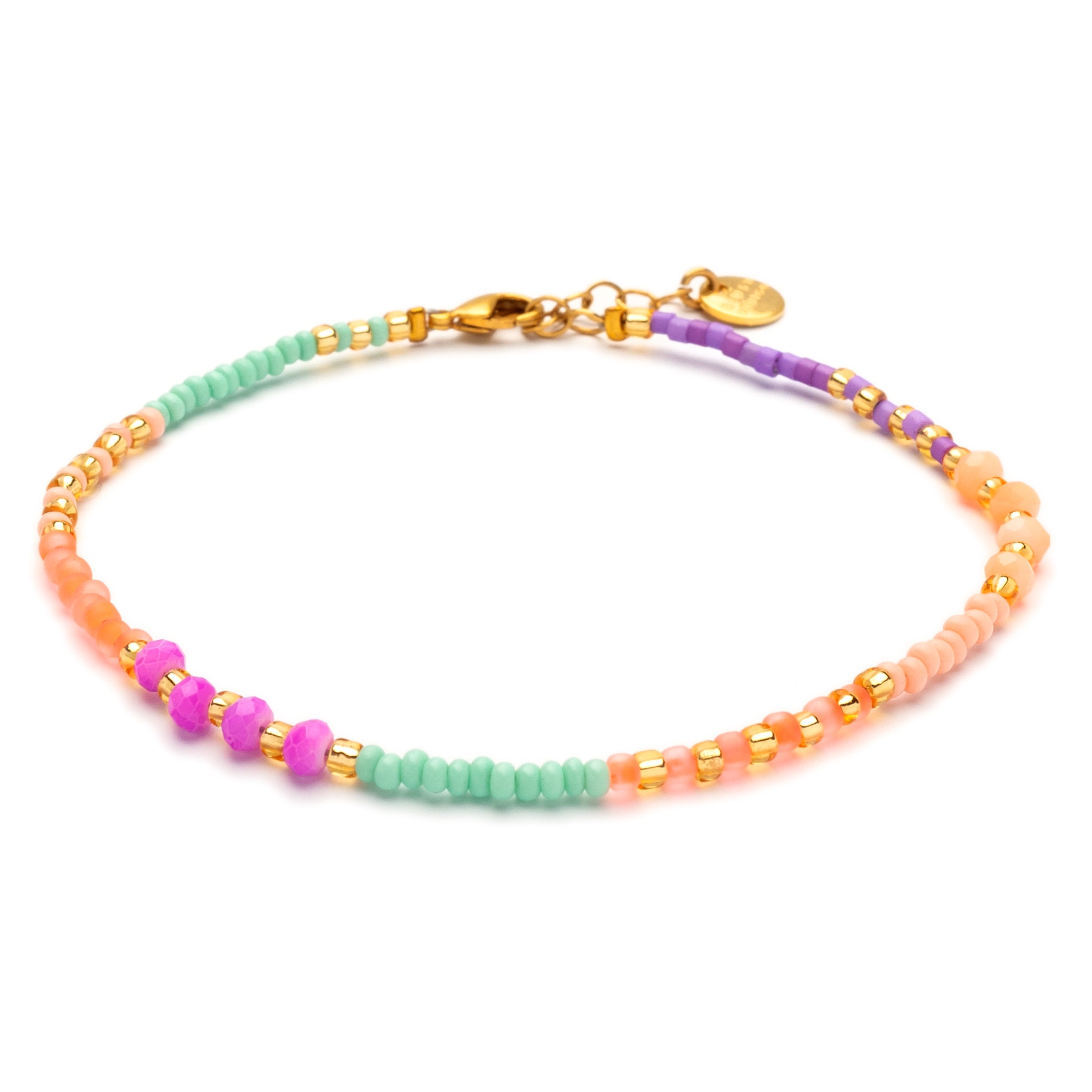 Die Farben unseres Bändchens Rhodos strahlen in soften Neon-Tönen um die Wette. Neben Coral, Mintgrün und Flieder setzen matte Glaskristalle in Lila und Neon-Coral elegante Akzente. Die Rhodos-Serie umfasst weitere Armbändchen, Fußkettchen und eine Halskette.