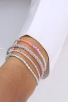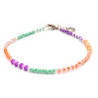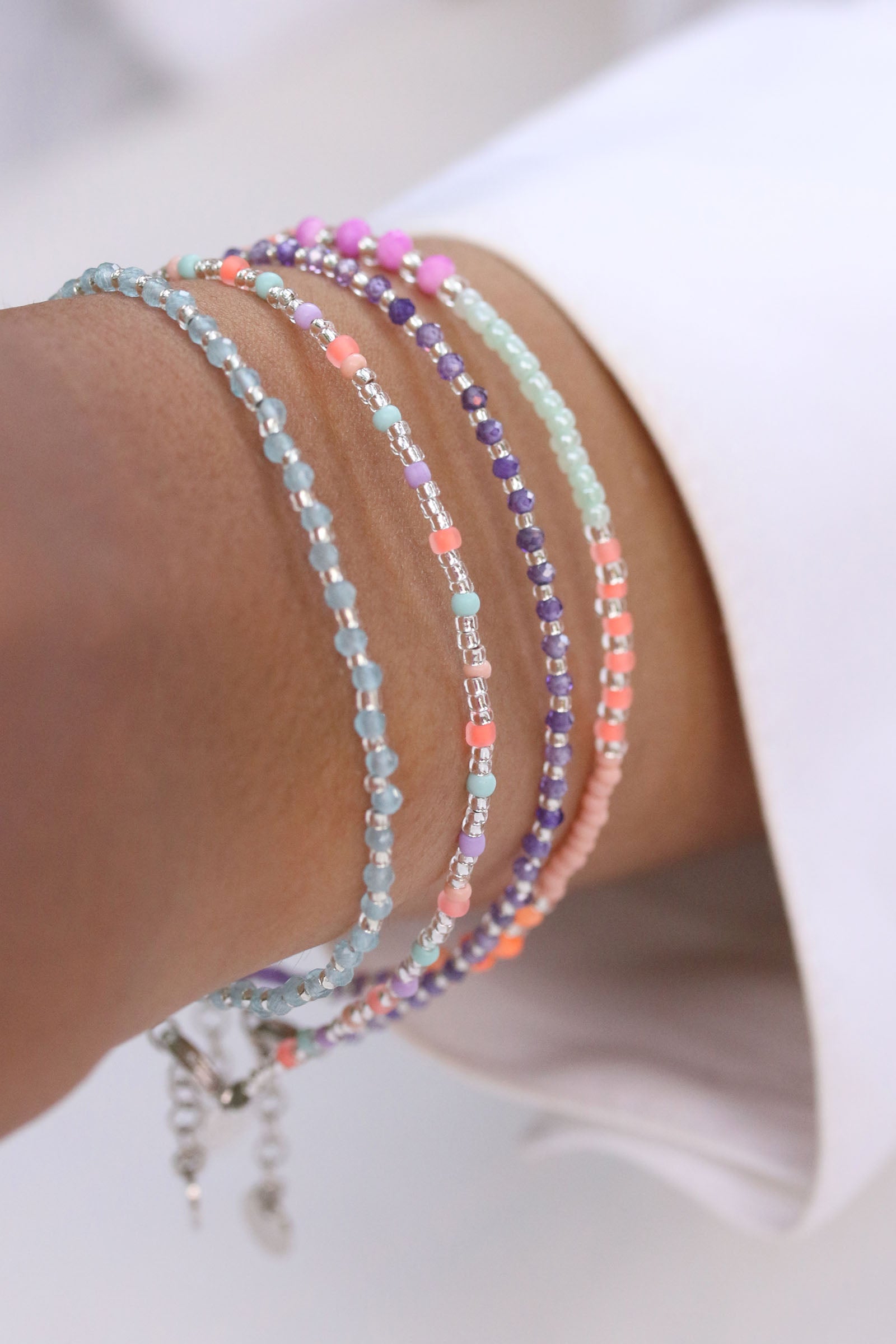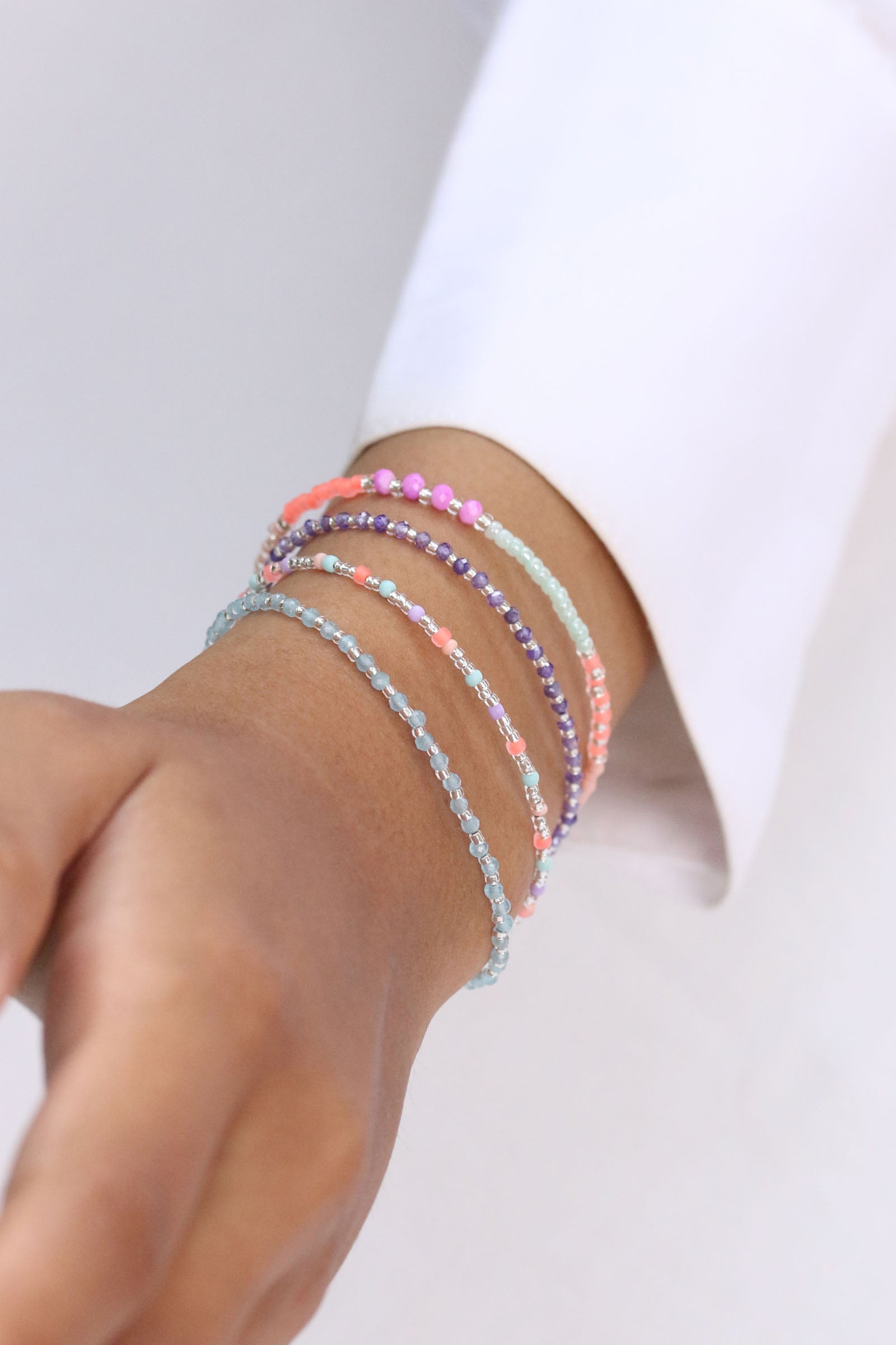 Die Farben unseres silbernen Bändchens Rhodos strahlen in soften Neon-Tönen um die Wette. Neben Coral, Mintgrün und Flieder setzen matte Glaskristalle in Lila und Neon-Coral elegante Akzente. Die Rhodos-Serie umfasst weitere Armbändchen, Fußkettchen und eine Halskette.