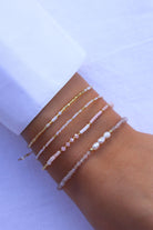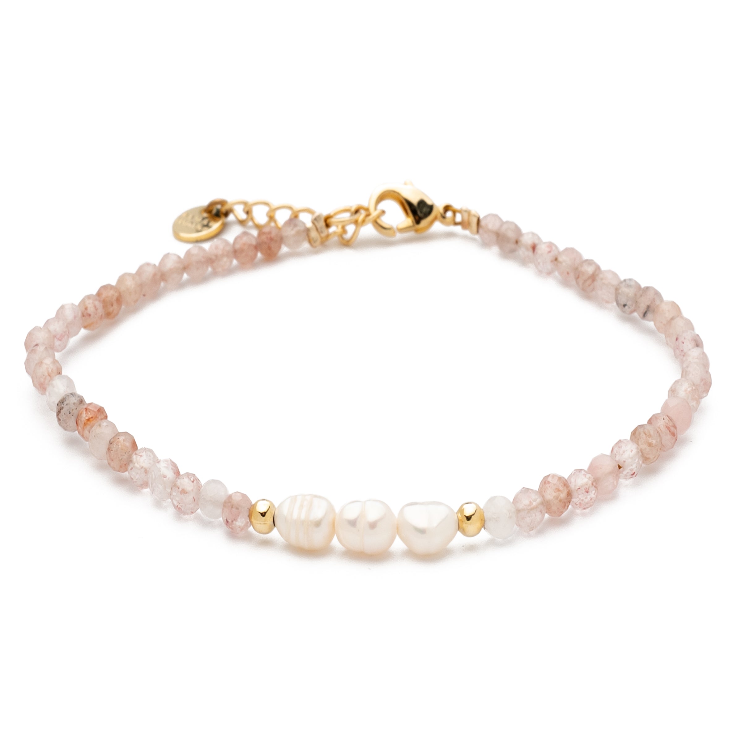 Unser Isola Armband mit Rosenquarzsteinen schimmert in betörenden Rosa-Nuancen am Handgelenk. Drei Süßwasserperlen bilden den eleganten Mittelpunkt.