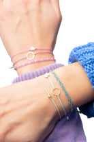 Unser geflochtenes Karma-Armband mit Kreis-Anhänger und eingewebten Goldfäden bringt eine Extraportion Glanz an dein Handgelenk.