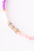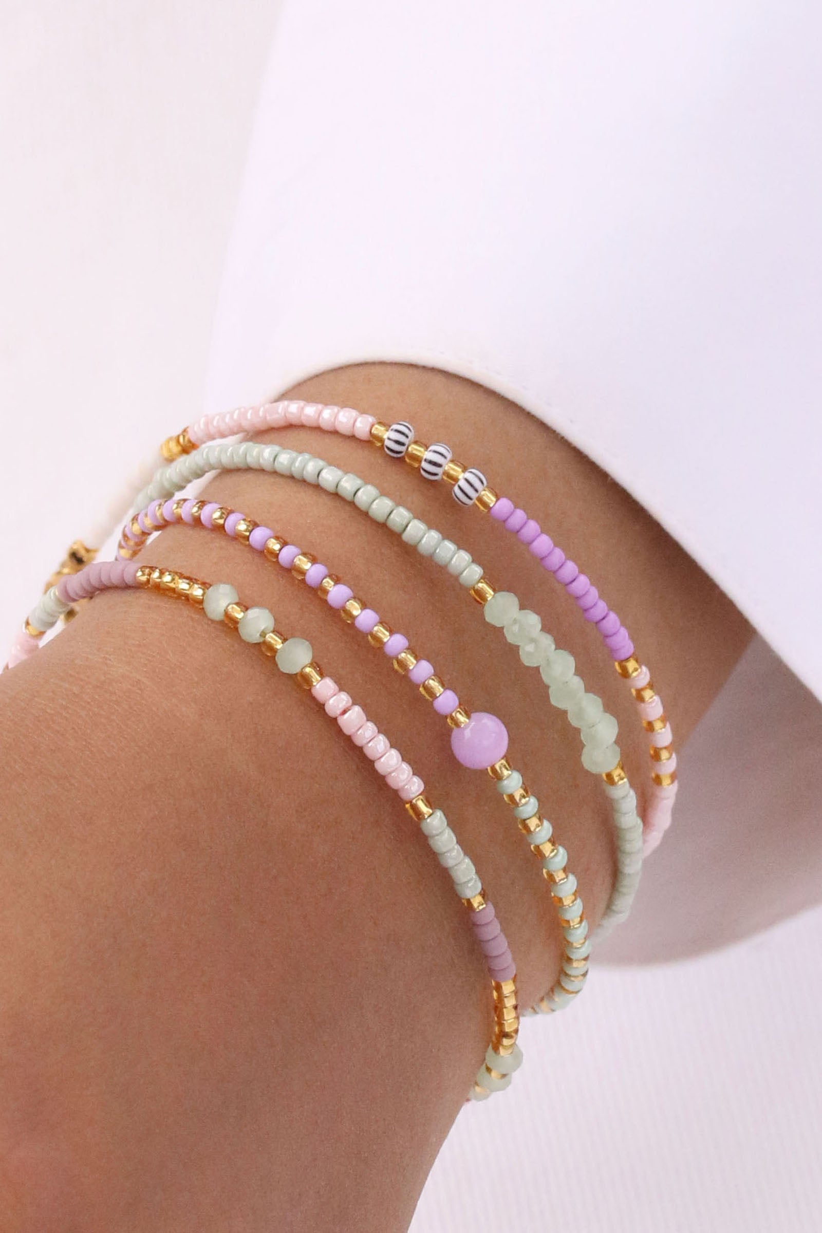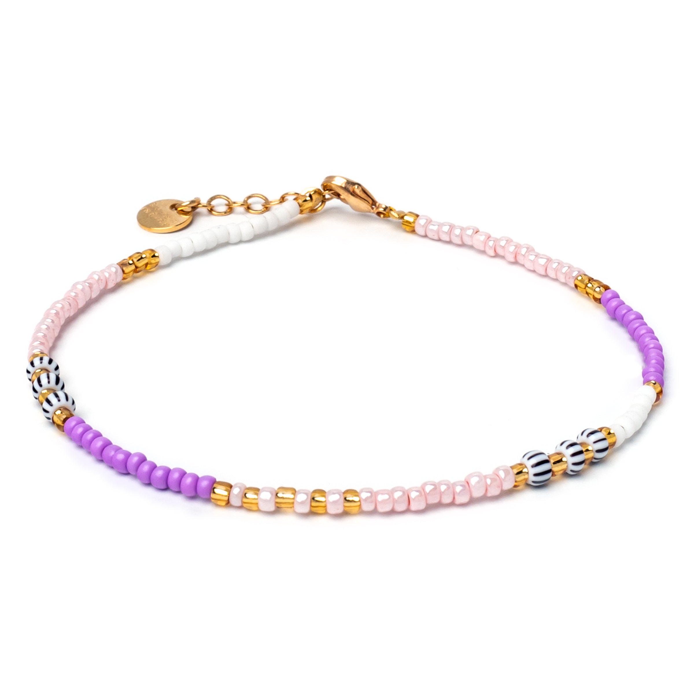 Unser Armband Marbella ist eine betörende Melange aus Flieder, Glossy Blush und Ivory. Sechs schwarz gestreifte Keramikperlen und vereinzelte goldene Perlen setzen elegante Highlights.