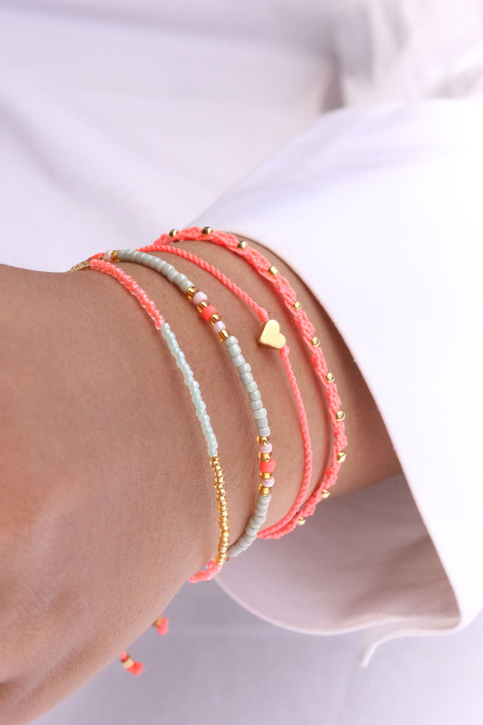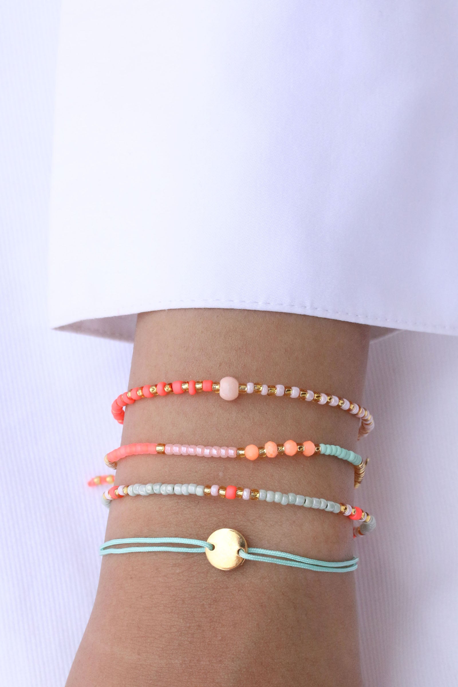 Auf nach San Remo! Glänzende Perlen in Mintgrün geben den Ton an in dem Armband-Mix aus unserer Mare-Serie. Vereinzelte Perlen in Glossy Blush, Matt Neon Coral und Gold setzen zusätzliche Farbtupfer.