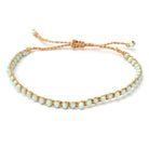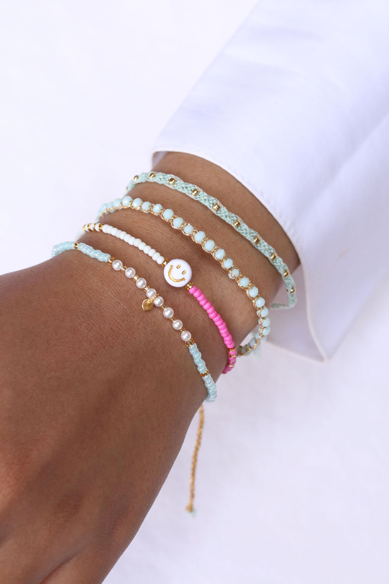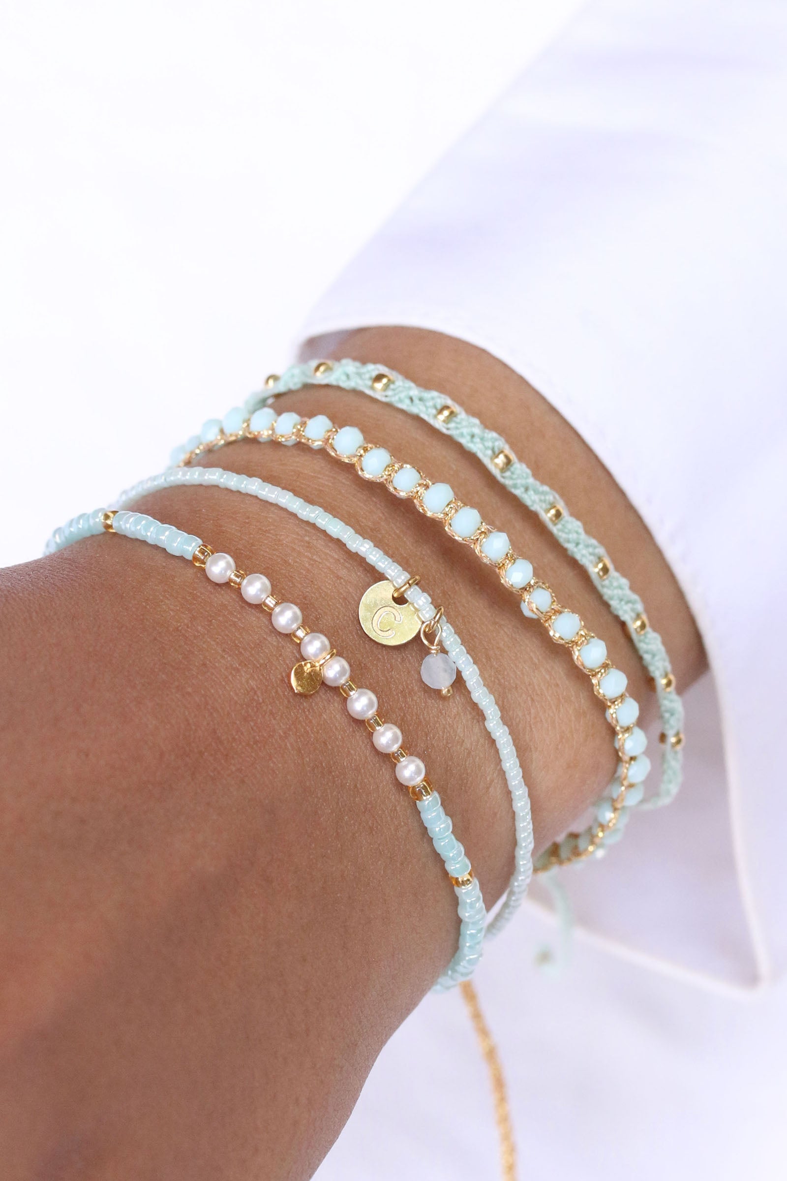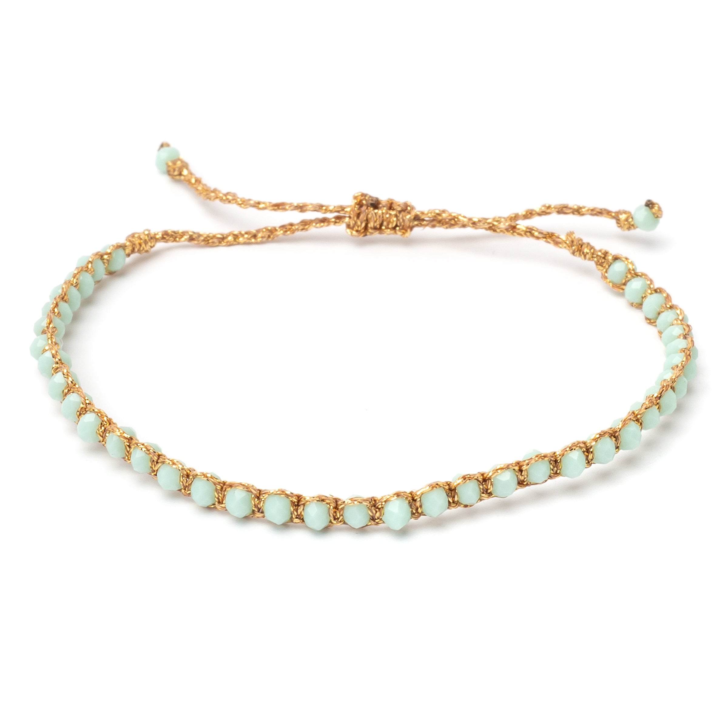 Your time to shine! Unser Armband Mino verbindet softe Farbakzente mit einem unwiderstehlichem Glow. Die hellblauen opaken Glaskristalle sind reihum mit goldfarbenen Textil zu einem eleganten Armband geknüpft.