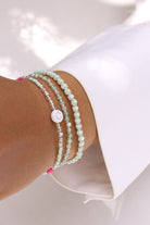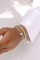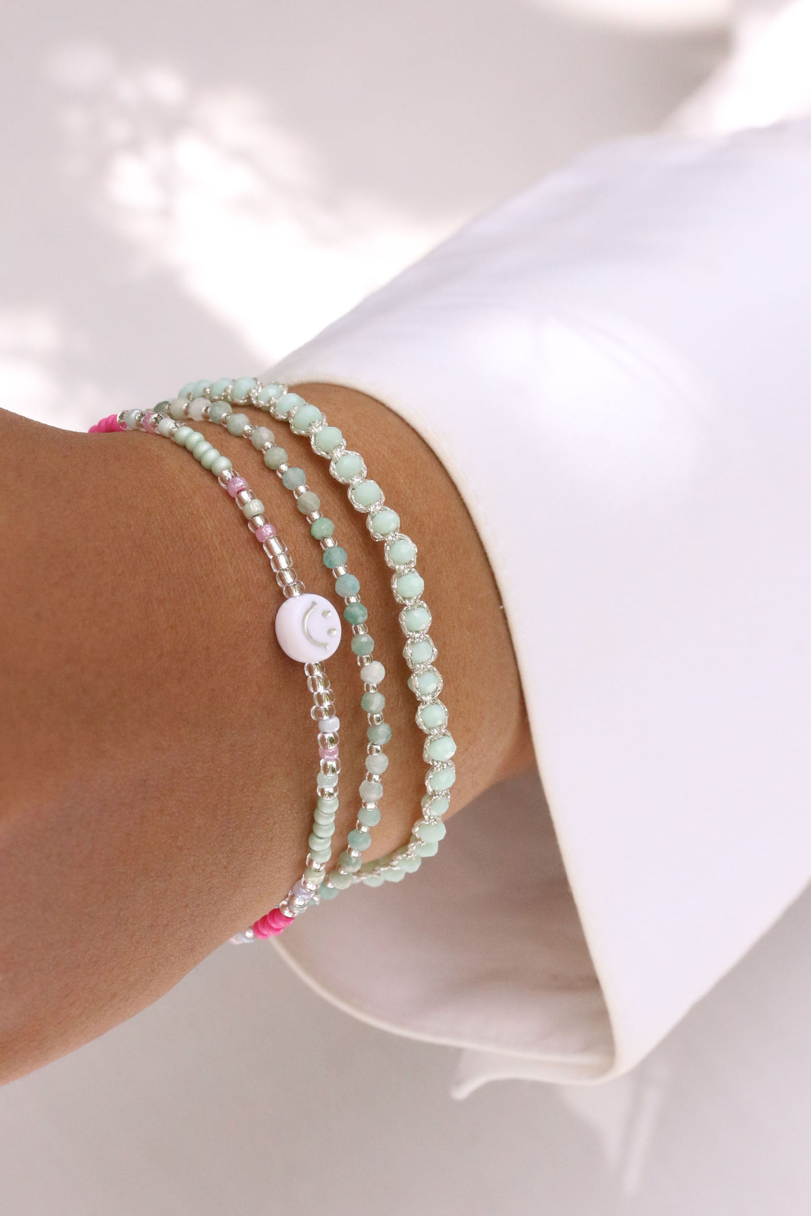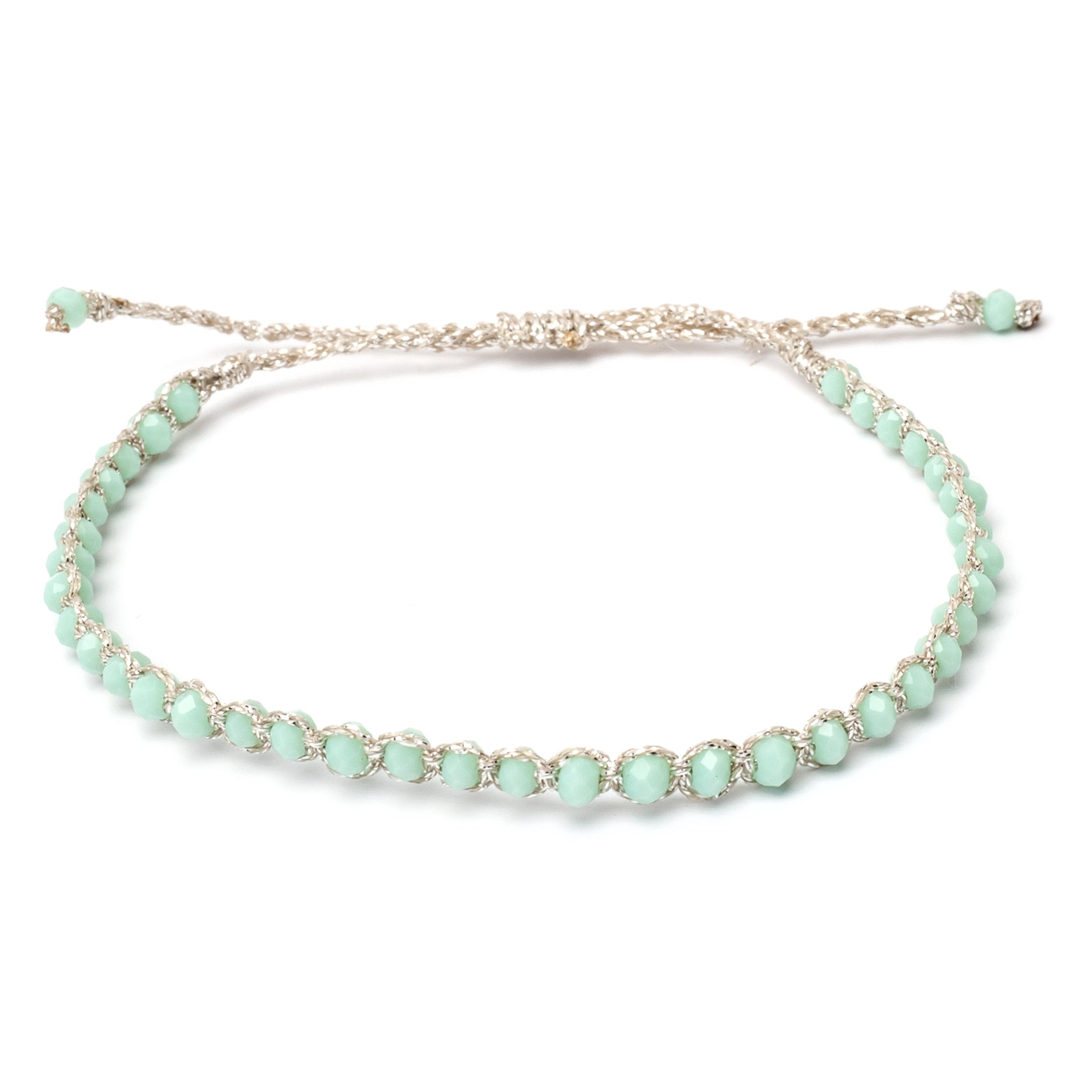 Your time to shine! Unser Armband Mino verbindet softe Farbakzente mit einem unwiderstehlichem Glow. Die hellblauen opaken Glaskristalle sind reihum mit silberfarbenen Textil zu einem eleganten Armband geknüpft.