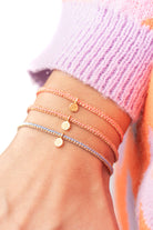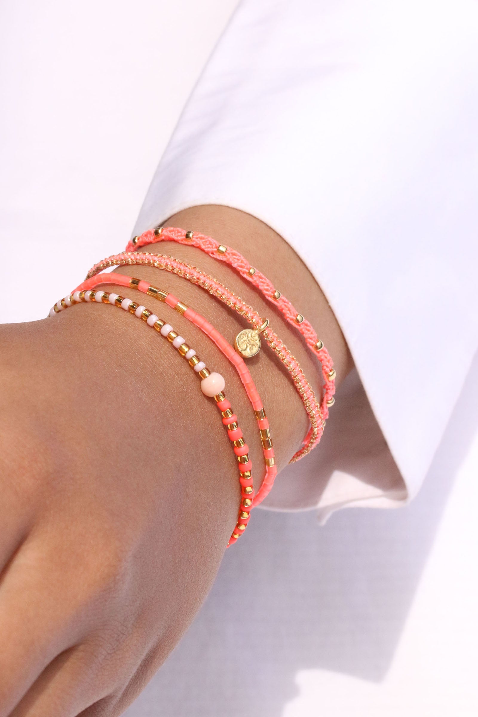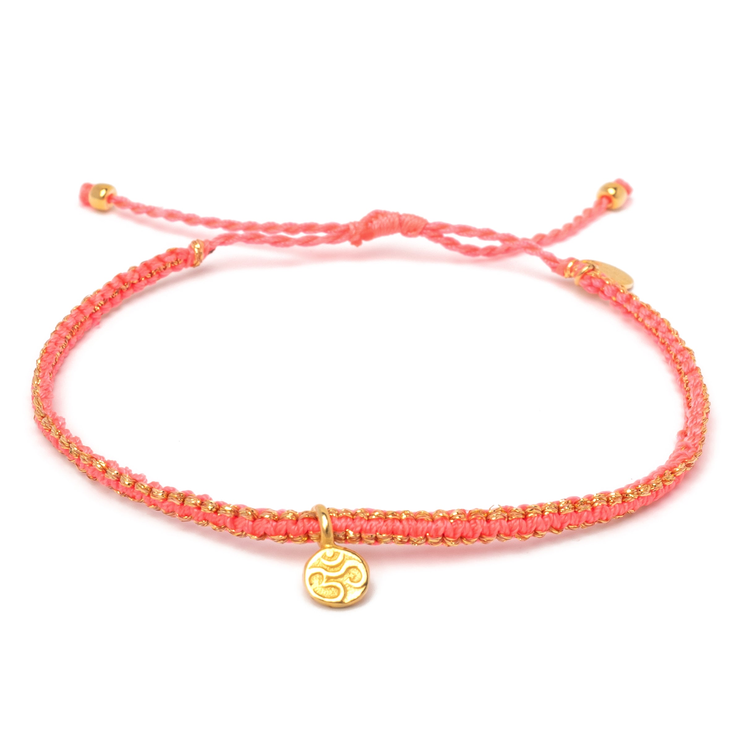 Unser Armband Om in Neon Coral bringt mit seinen eingewebten Goldfäden und dem Om-Plättchen eine Extraportion Glanz an dein Handgelenk.