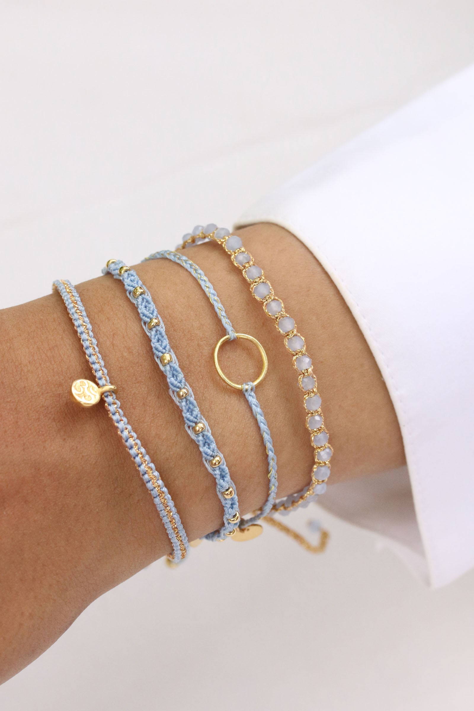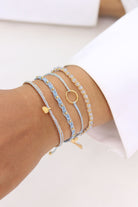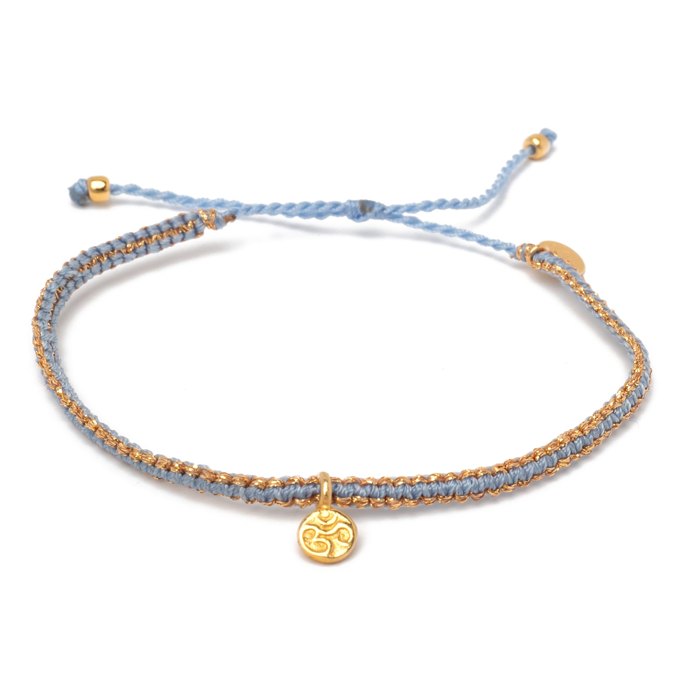 Unser Armband Om in Himmelblau bringt mit seinen eingewebten Goldfäden und dem Om-Plättchen eine Extraportion Glanz an dein Handgelenk.