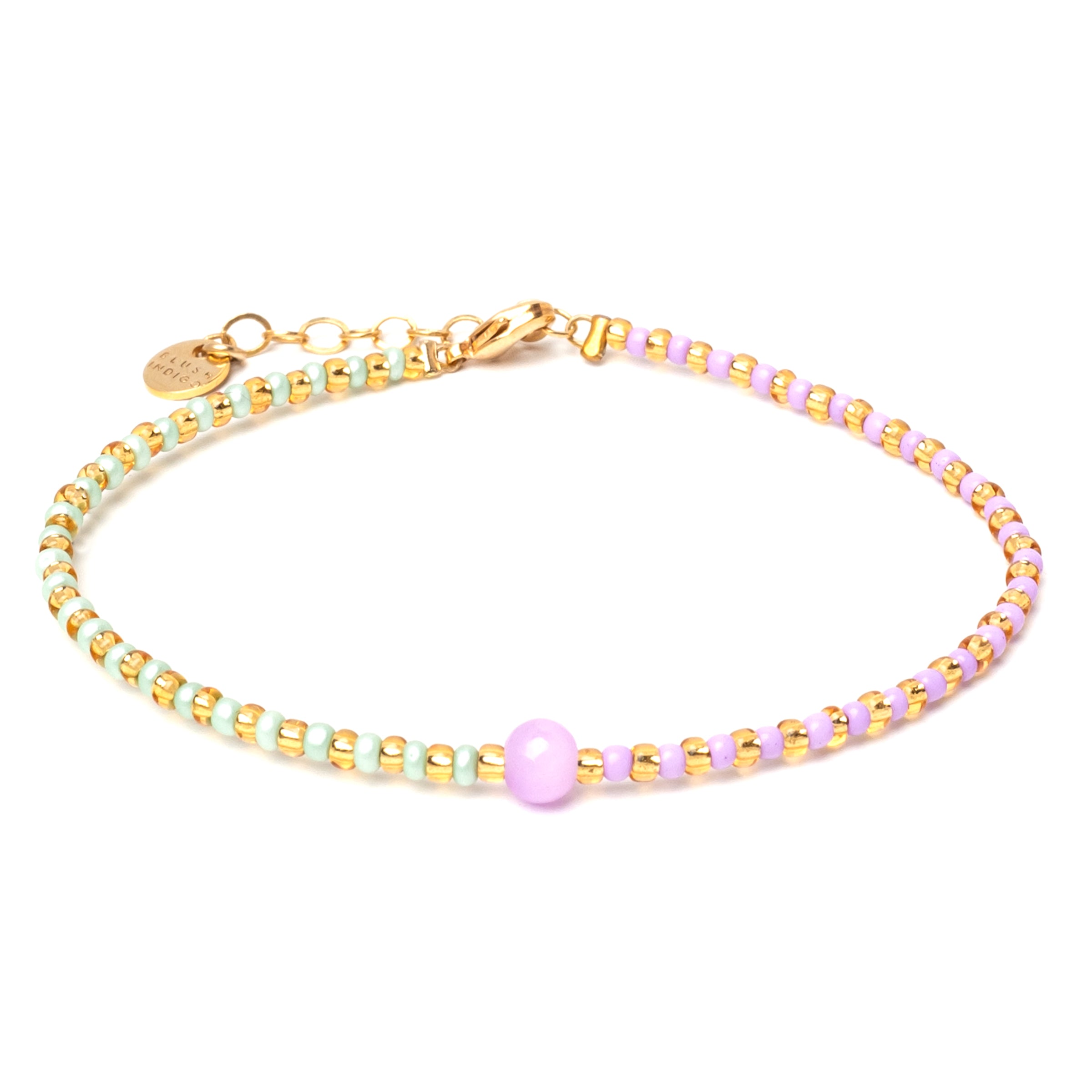 Unsere Lieblingsfarben geben den Ton an bei unserem Armband-Mix Chianti: Violett und Mint Green. Mittelpunkt der Piazza-Serie ist eine fliederfarbene 4 mm Glaskugel. Abwechselnd gesetzte Goldperlen sorgen für ein elegantes Finish.