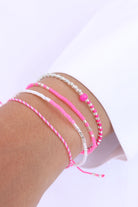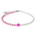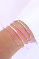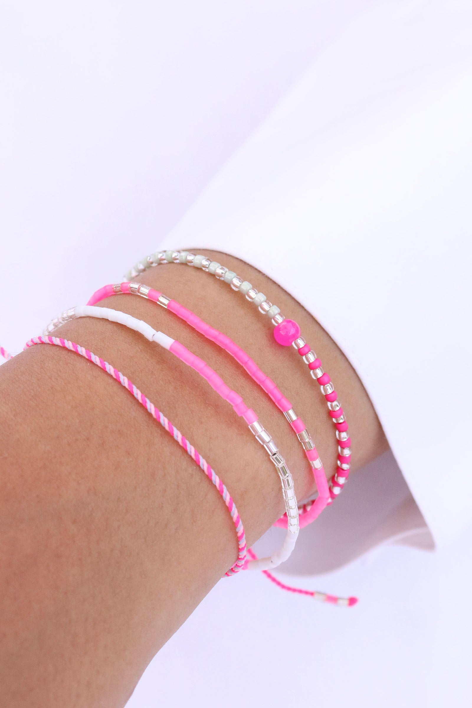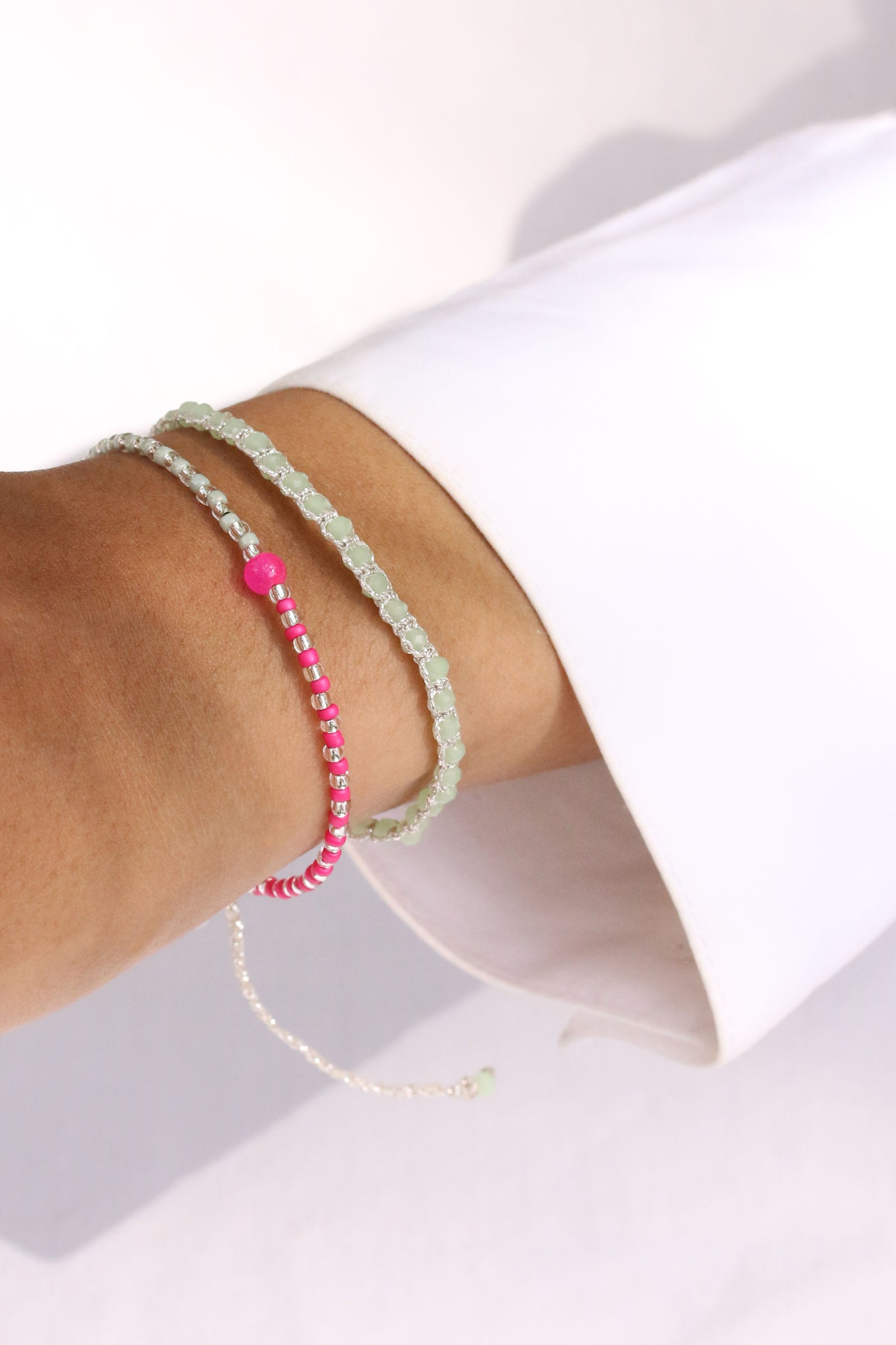 Zwei Farben geben den Ton an bei unserem Armband-Mix Lucca: Flamingo Pink und Mint Green. Mittelpunkt der Piazza-Serie ist eine pinkfarbene 4 mm Glaskugel. Abwechselnd gesetzte Silberperlen sorgen für ein elegantes Finish.