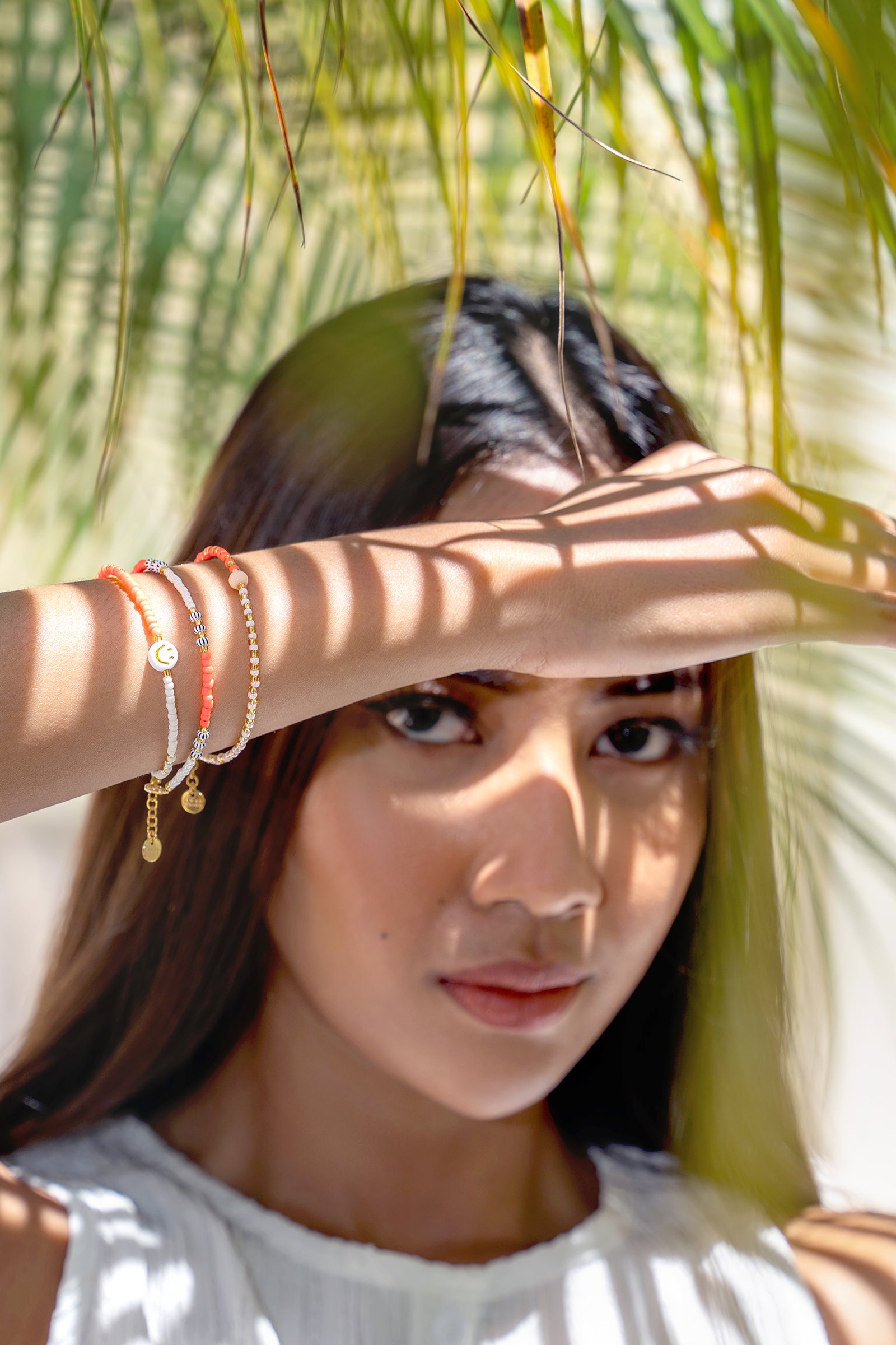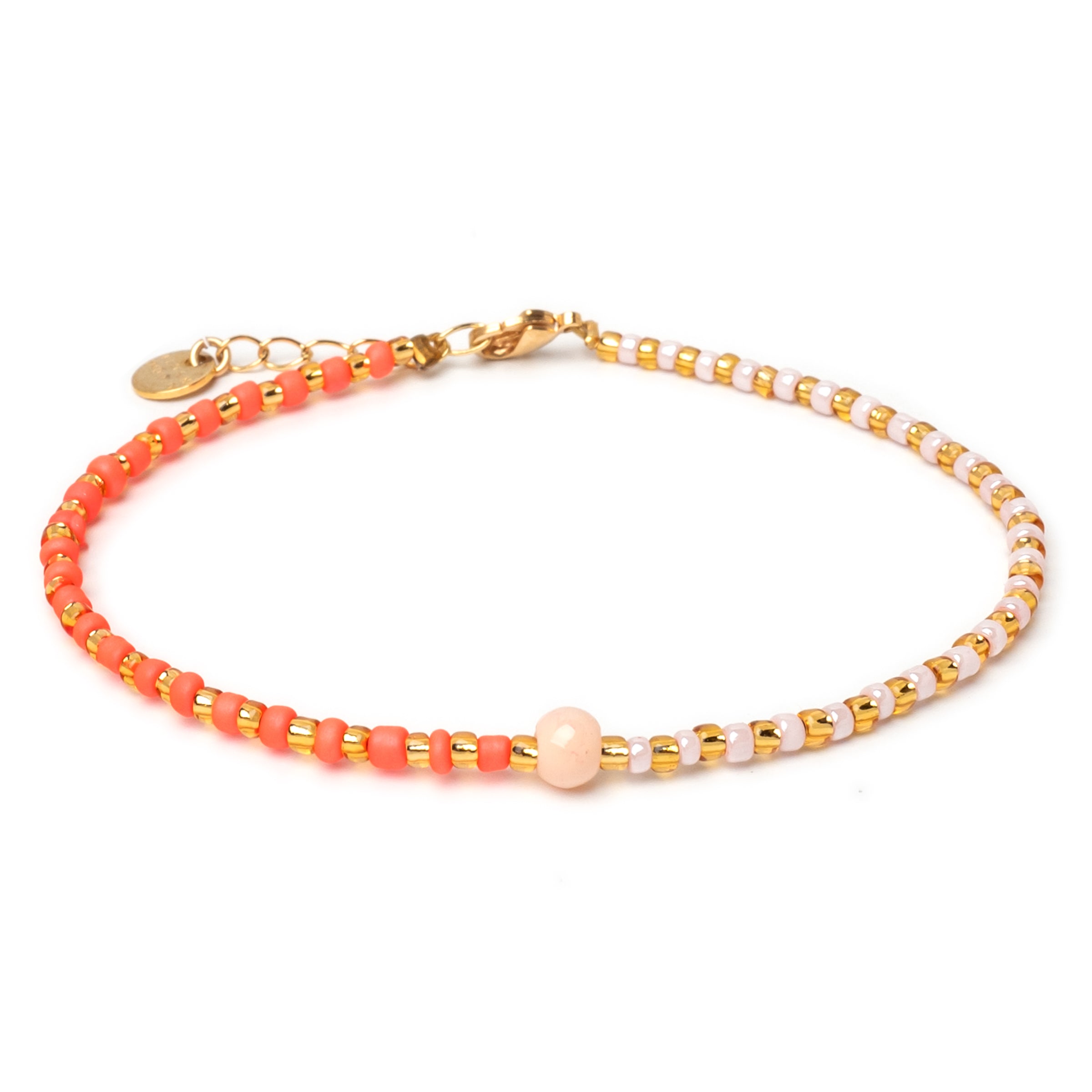 Unsere Lieblingsfarben geben den Ton an bei unserem Armband-Mix Mallorca: Neon Coral und Glossy Ivory. Mittelpunkt der Piazza-Serie ist eine beige 4 mm Glaskugel. Abwechselnd gesetzte Goldperlen sorgen für ein elegantes Finish.