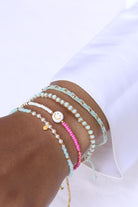 Das Armband misst ca. 24 cm hat einen verstellbaren Knoten-Verschluss für ein einfaches An- und Ausziehen. Es ist auch in den Farben Farben Neon Coral und Neon Pink erhältlich. Es handelt sich um synthetische Perlen und einen 3 mm großen Coin aus 18k vergoldetem Messing.