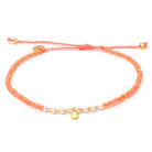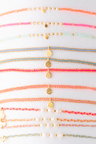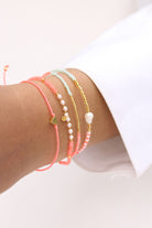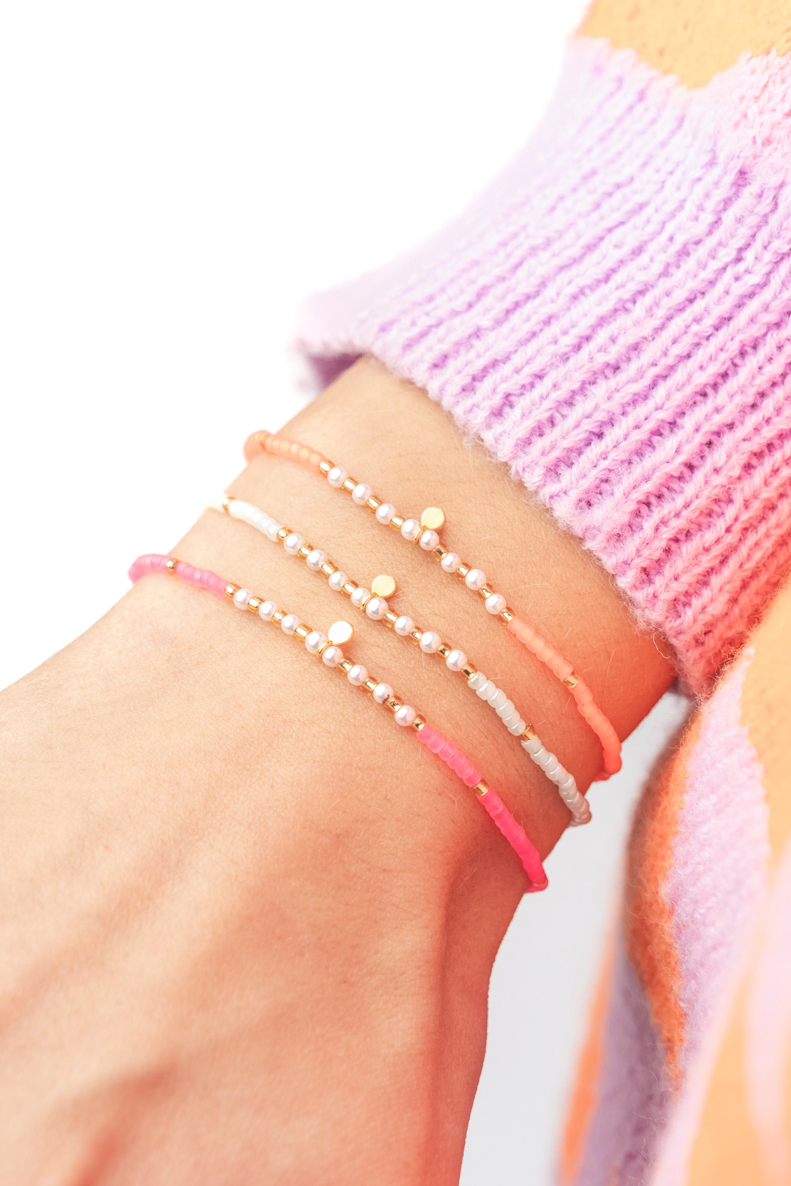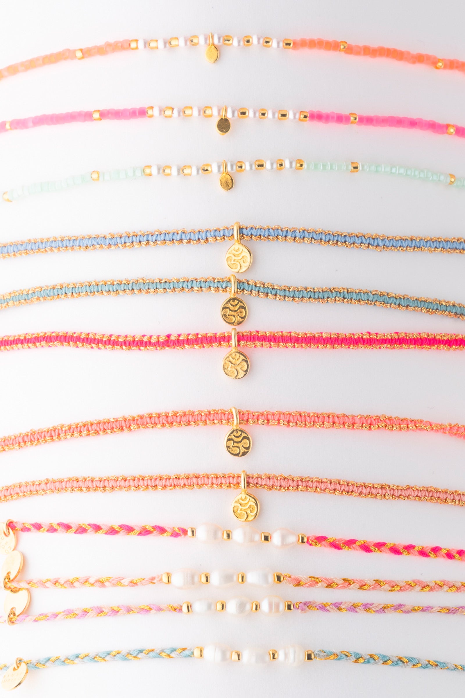 Das Armband misst ca. 24 cm hat einen verstellbaren Knoten-Verschluss für ein einfaches An- und Ausziehen. Es ist auch in den Farben Farben Fresh Mint und Neon Pink erhältlich. Es handelt sich um synthetische Perlen und einen 3 mm großen Coin aus 18k vergoldetem Messing.