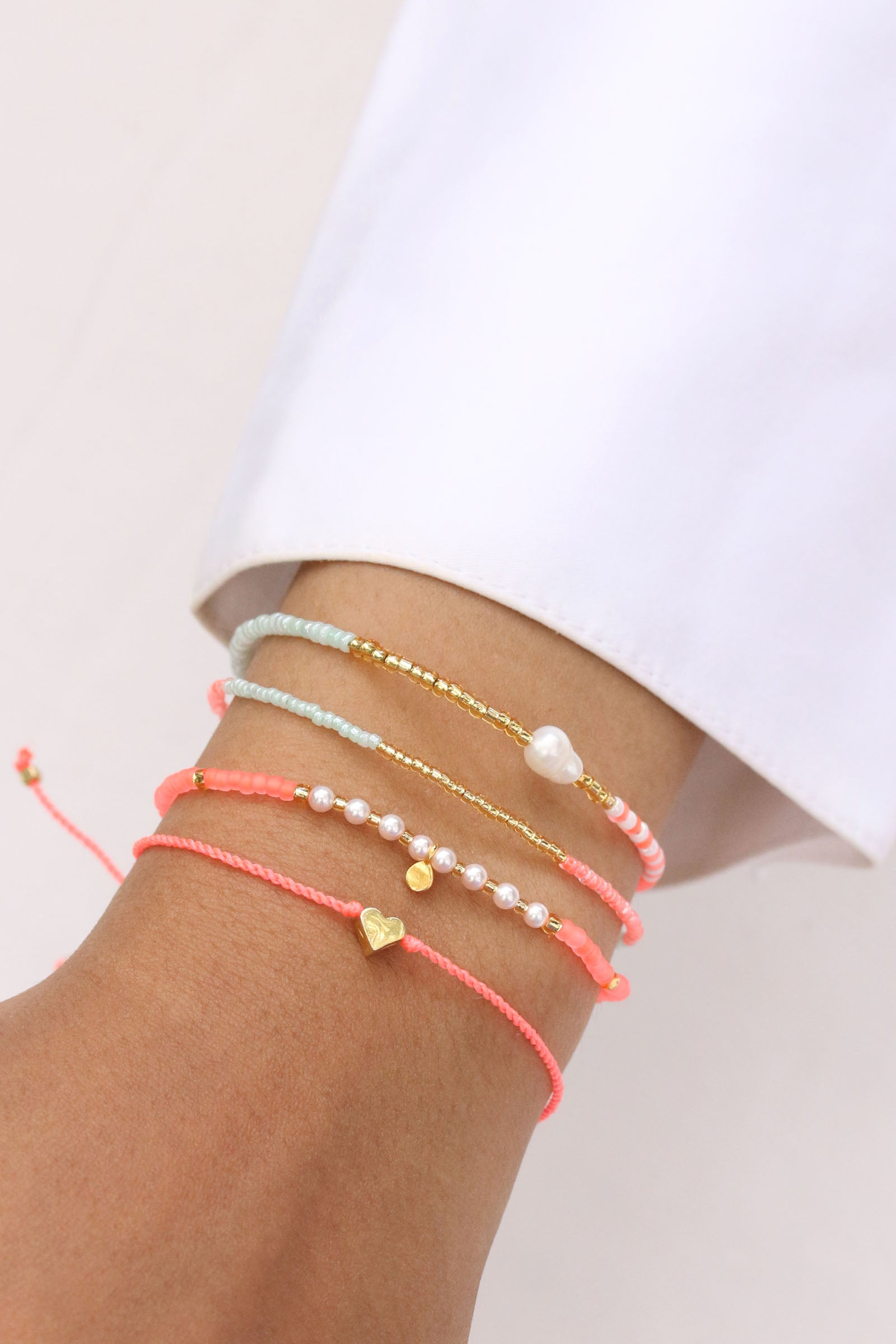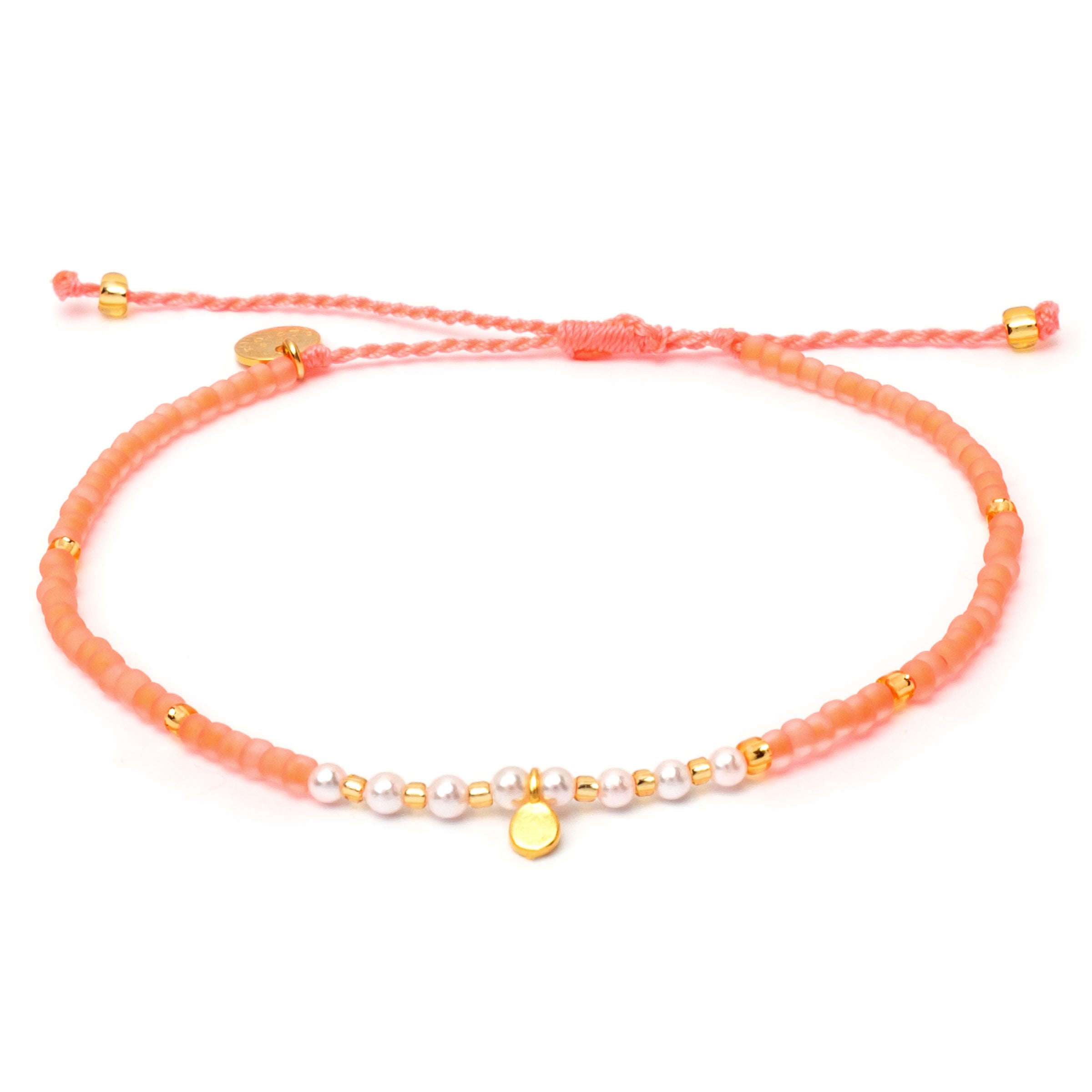 Unser goldenes Pura-Armband in Neon Coral wird dein liebster Urlaubsbegleiter werden. Perlen in Frosted Coral und acht synthetische Süßwasserperlen reihen sich elegant um dein Handgelenk. Strahlender Mittelpunkt ist ein vergoldetes Coin-Plättchen.