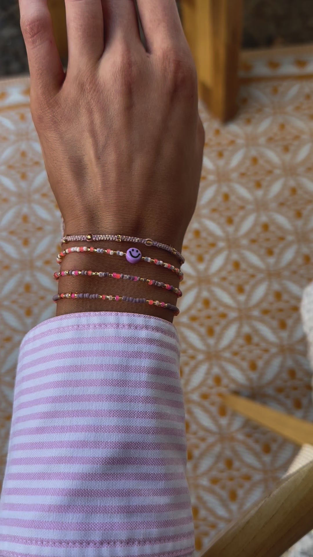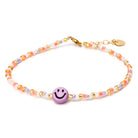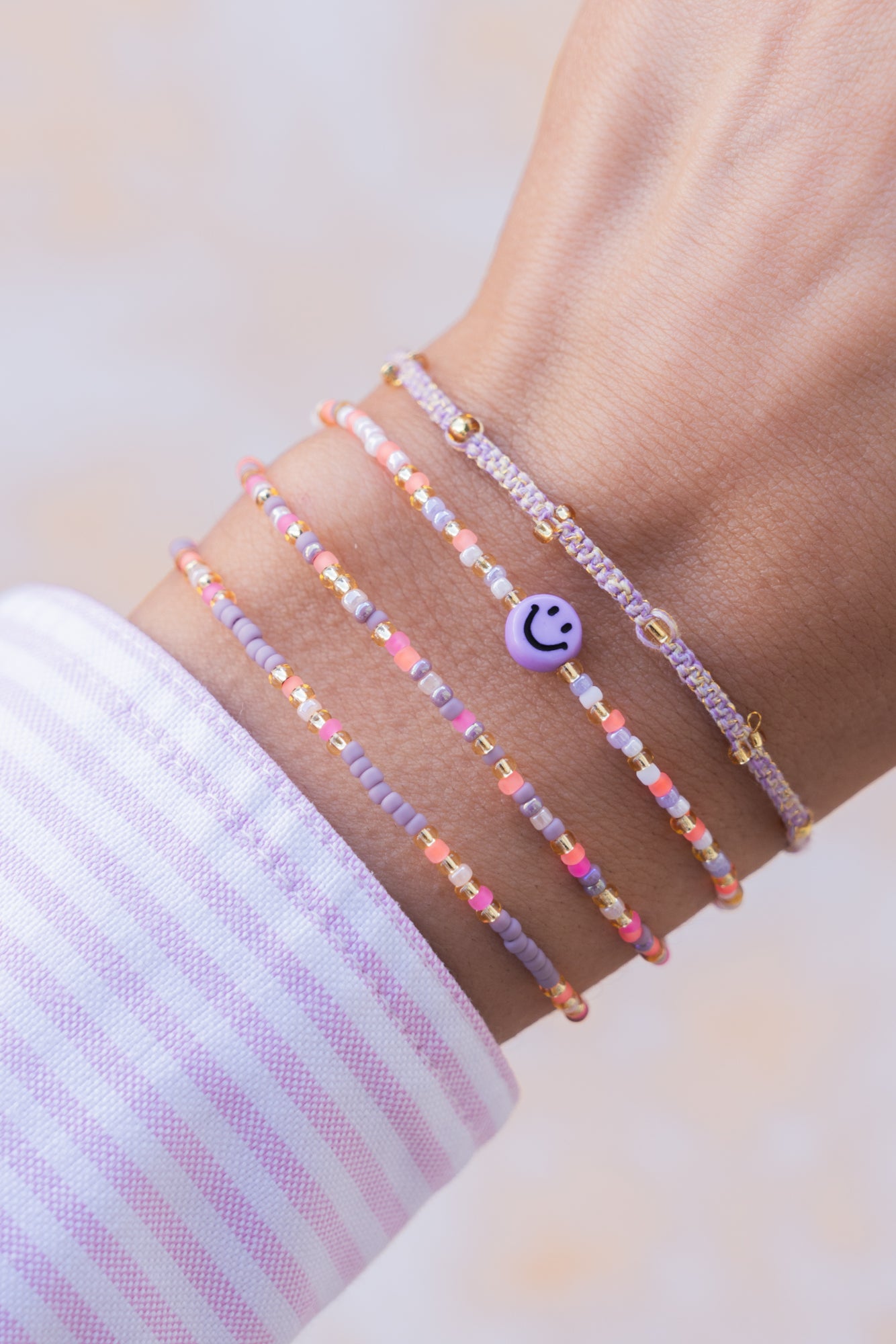 Das Bändchen Smile, it's your Birthday in Violett ist der bunte Zuckerguss auf deiner Geburtstagstorte. Matte und glänzende Glasperlen in Rosa, Weiß, Ivory, Lila und Neon Coral in den schönsten Bonbon-Farben versüßen dein Handgelenk und wechseln sich mit goldenen Perlen ab. In der Mitte grinst dich eine lilafarbene Smiley-Perle an.