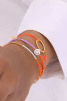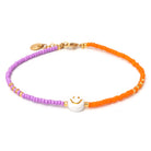 Das Bändchen Smile, it's your Birthday 4 ist der zweifarbige Zuckerguss auf deiner Geburtstagstorte. Die eine Hälfte des Armbands besteht aus fliederfarbenen Glasperlen, die andere Hälfte strahlt in einem intensiven Orange. In der Mitte grinst dich eine Smiley-Perle an. Vereinzelte goldene Perlen setzen elegante Akzente.