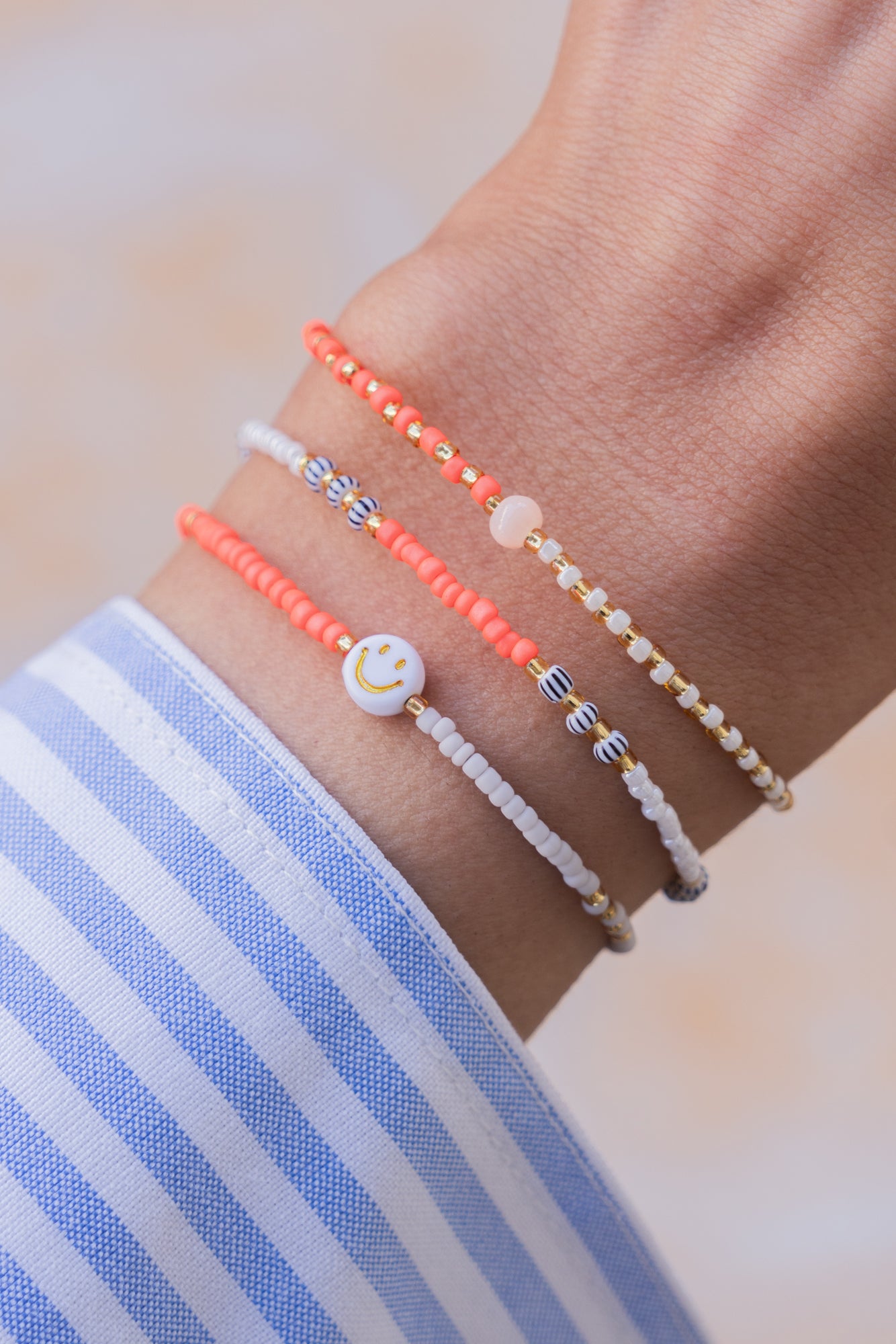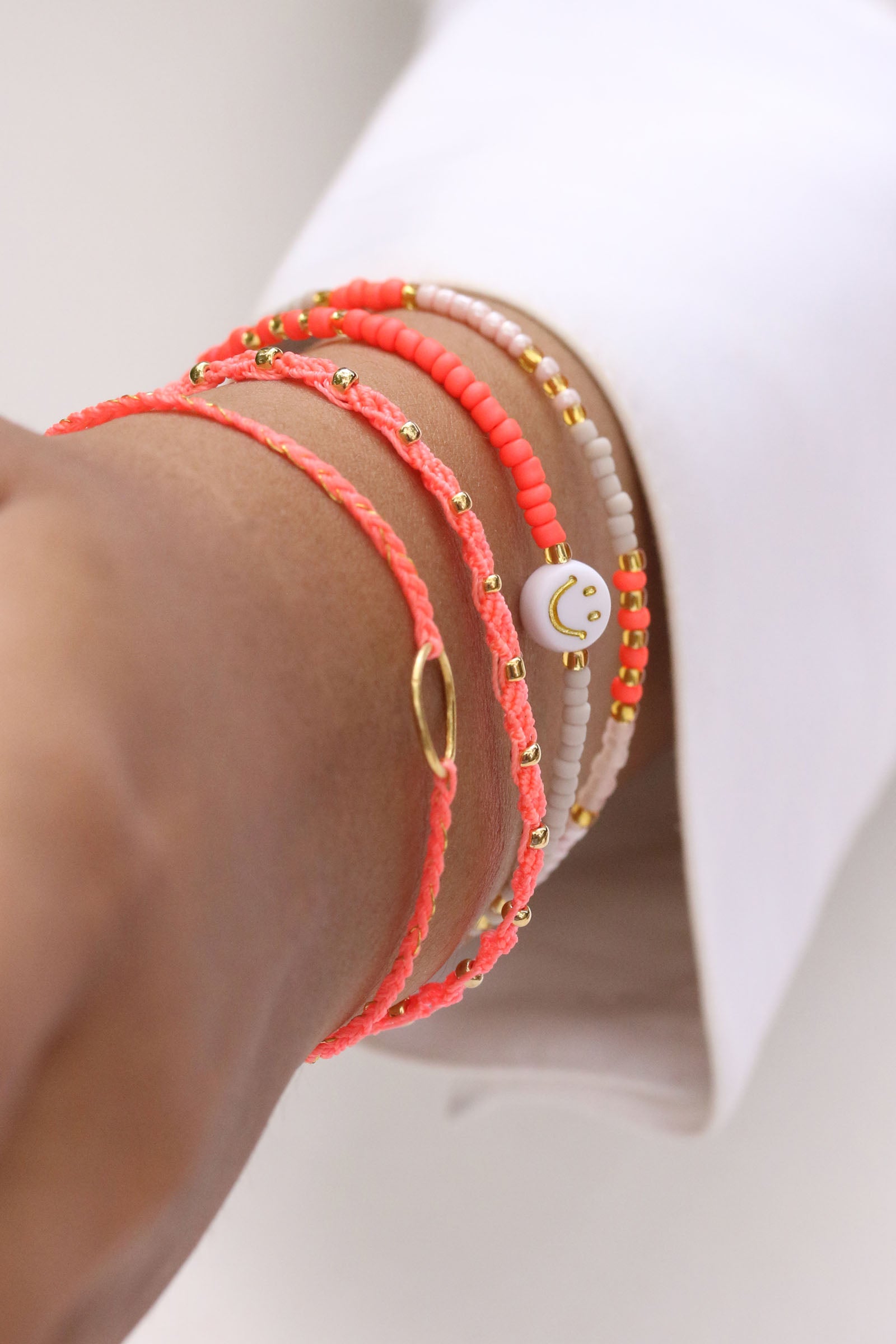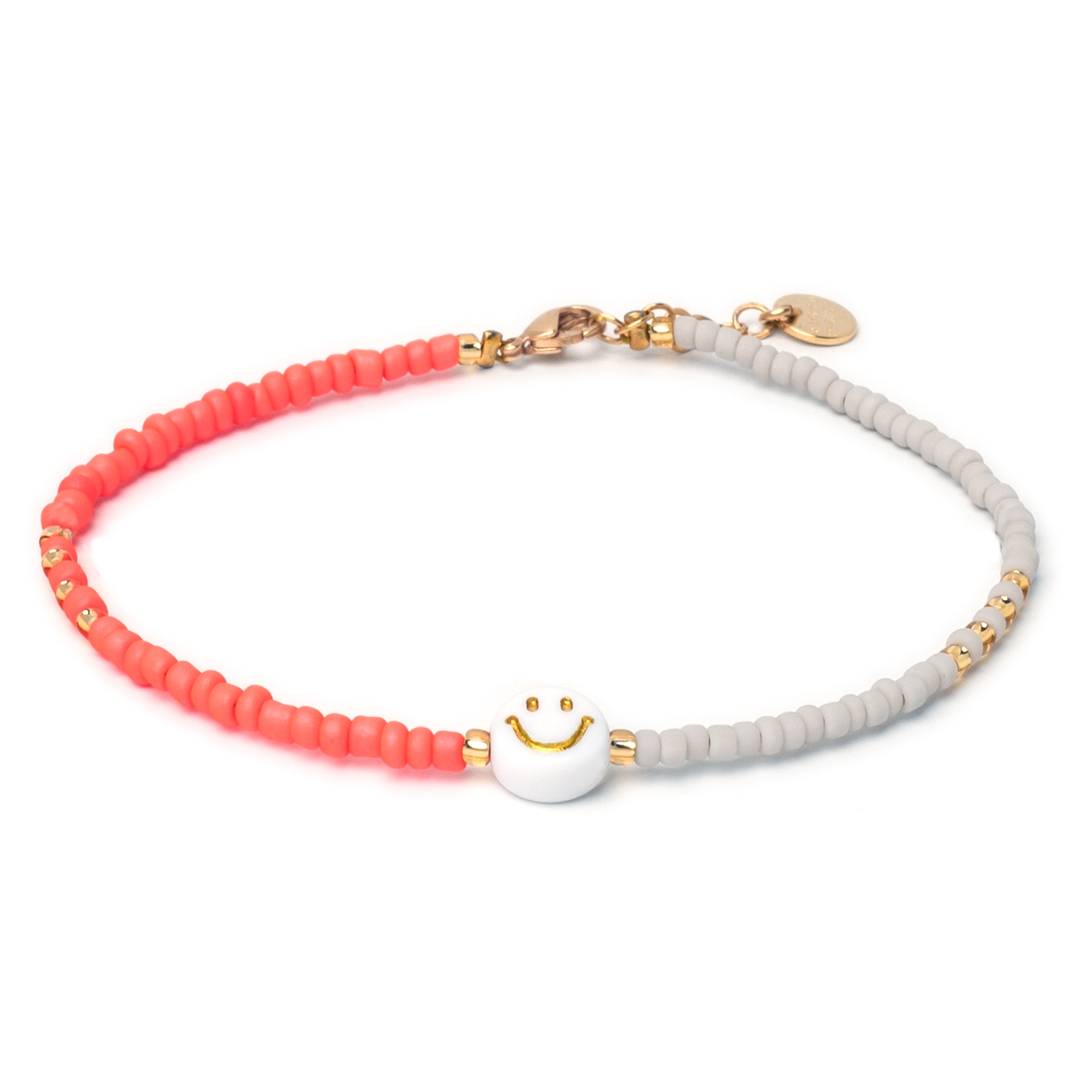 Das Bändchen Smile, it's your Birthday 6 ist der zweifarbige Zuckerguss auf deiner Geburtstagstorte. Die eine Hälfte des Armbands besteht aus matten Glasperlen in Greige (eine betörende Mischung aus Grau und Beige), die andere Hälfte strahlt in einem intensiven matten Neon Coral. In der Mitte grinst dich eine Smiley-Perle an. Vereinzelte goldene Perlen setzen elegante Akzente.