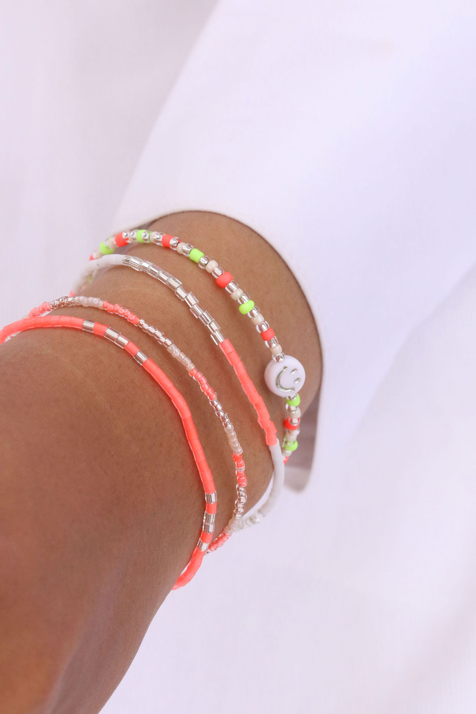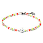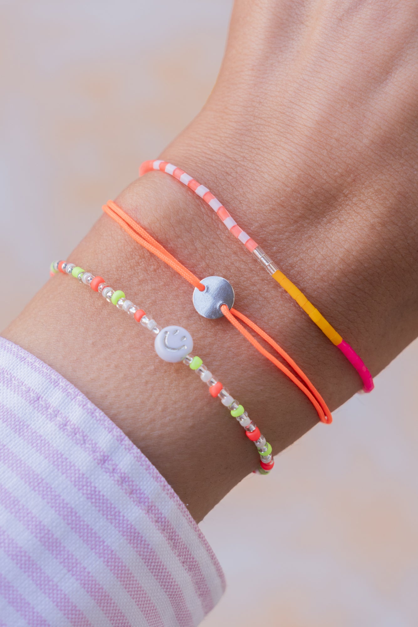 Das silberne Bändchen Smile, it's your Birthday 7 ist der neonfarbene Zuckerguss auf deiner Geburtstagstorte. Matte Glasperlen in Neon Gelb, Neon Coral, Ivory und Silber wechseln sich nacheinander ab. In der Mitte grinst dich eine Smiley-Perle an.