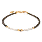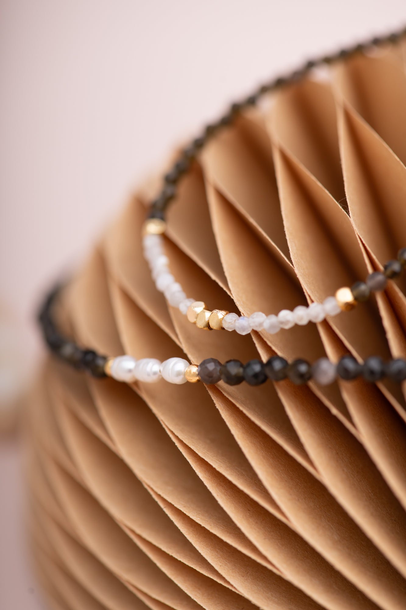 Wir haben Rauchquarz und Mondsteine zu einem besonderen Armband-Mix kombiniert. Vergoldete Metallwürfel sorgen für ein elegantes Finish. Es handelt sich um Natursteine. Diese sind immer einzigartig in ihrer Farbe und können vom Foto abweichen.