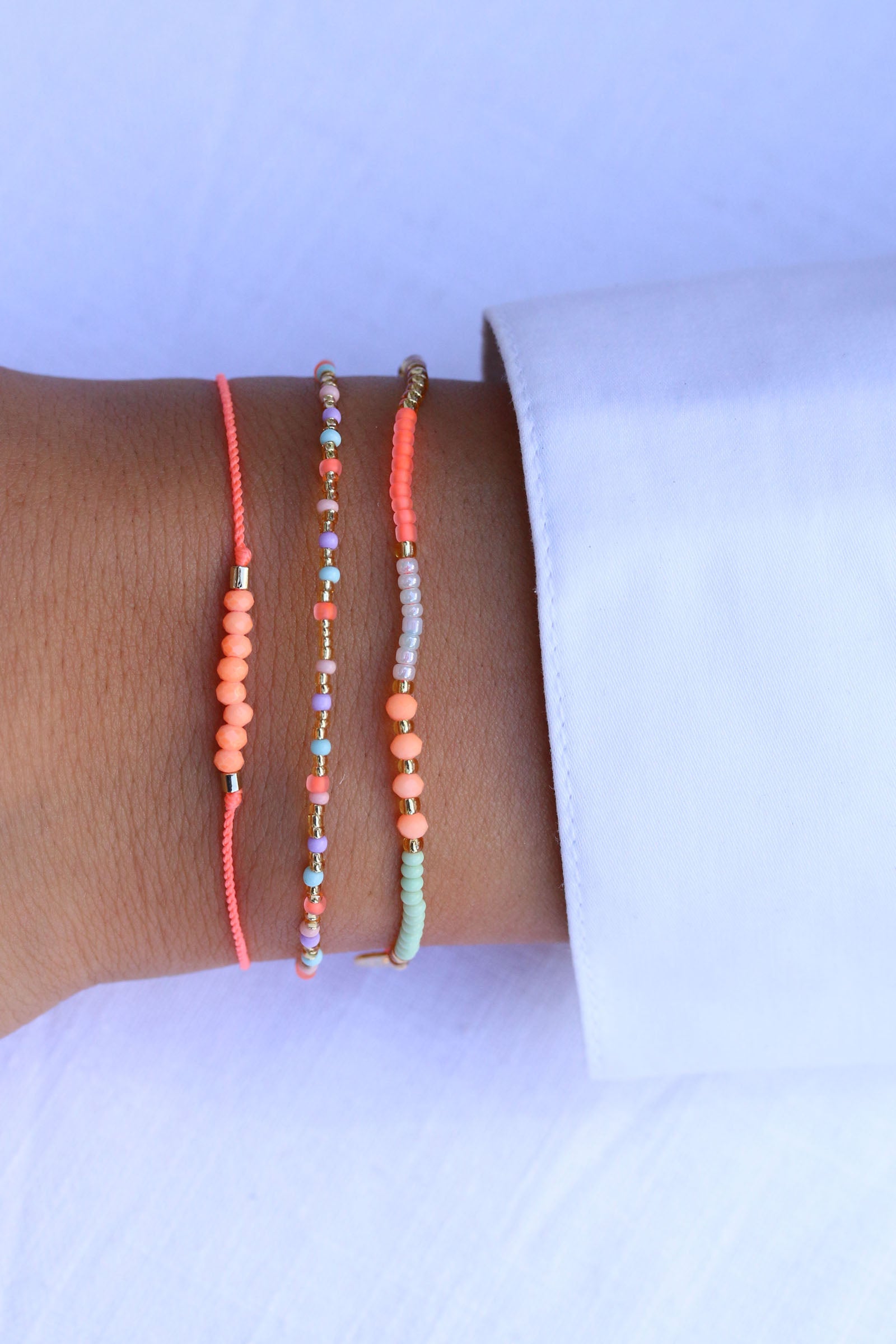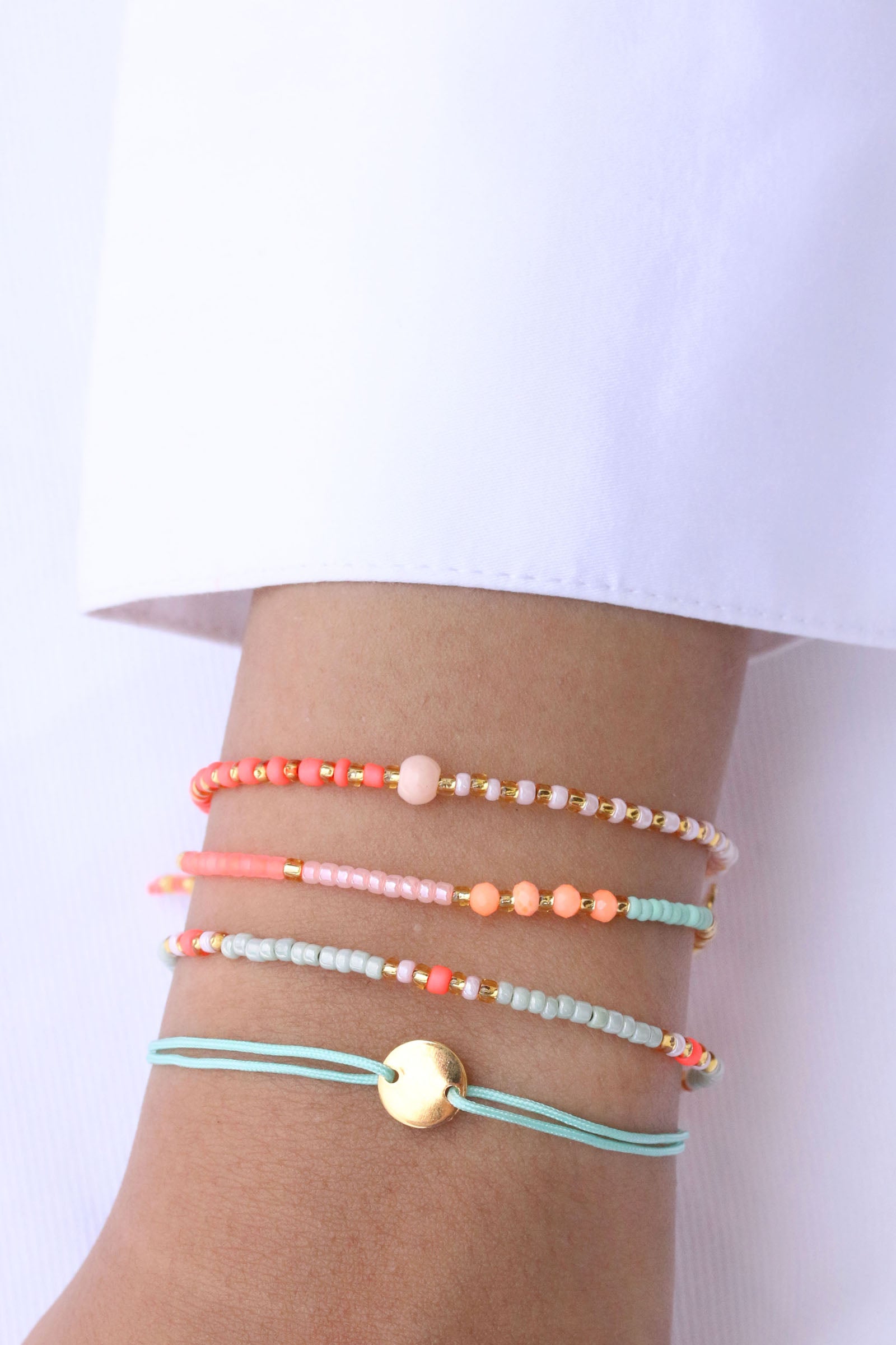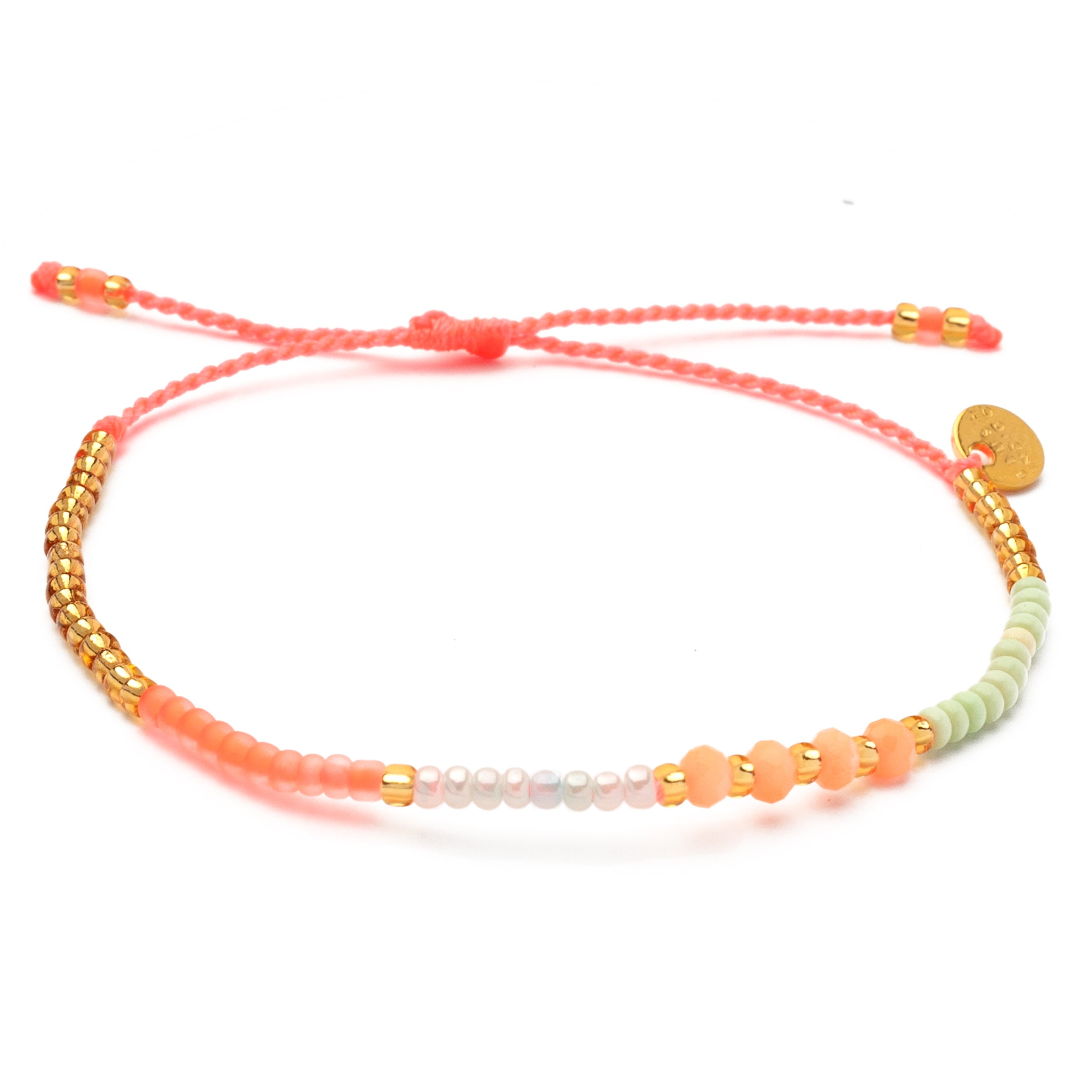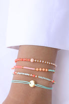 Das Armband Fleurette aus unserer Sweet-String-Serie wurde mit Sorgfalt und Liebe zum Detail handgefertigt. Matte Perlen in den Farben Neon Coral, Ivory und Mintgrün reihen sich aneinander, goldene Perlen und vier matte Kristallperlen in Neon Coral verleihen dem Armband einen eleganten Touch.