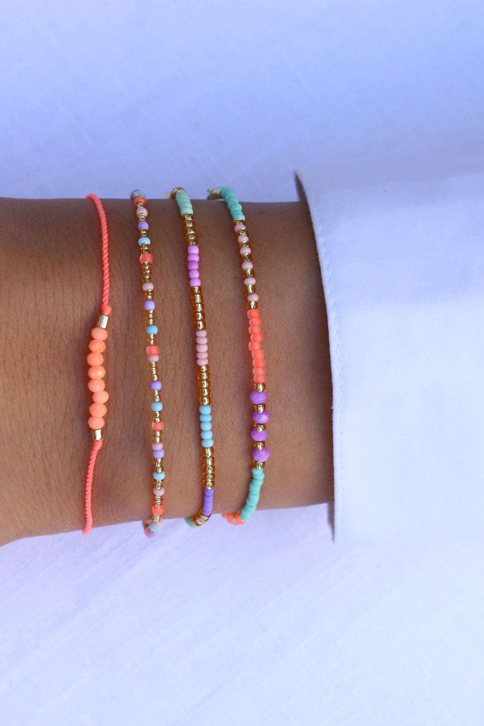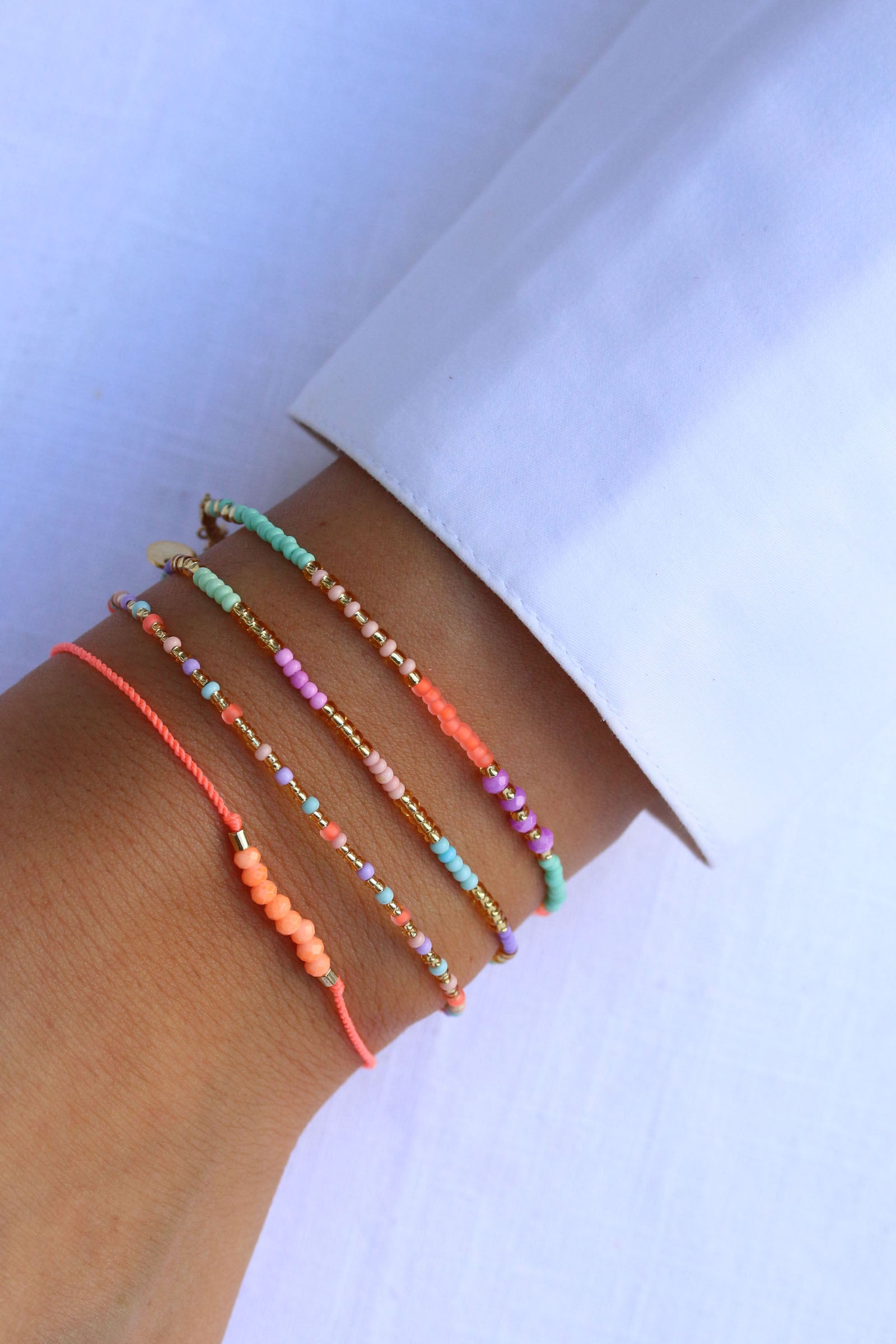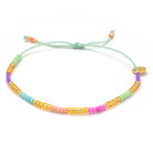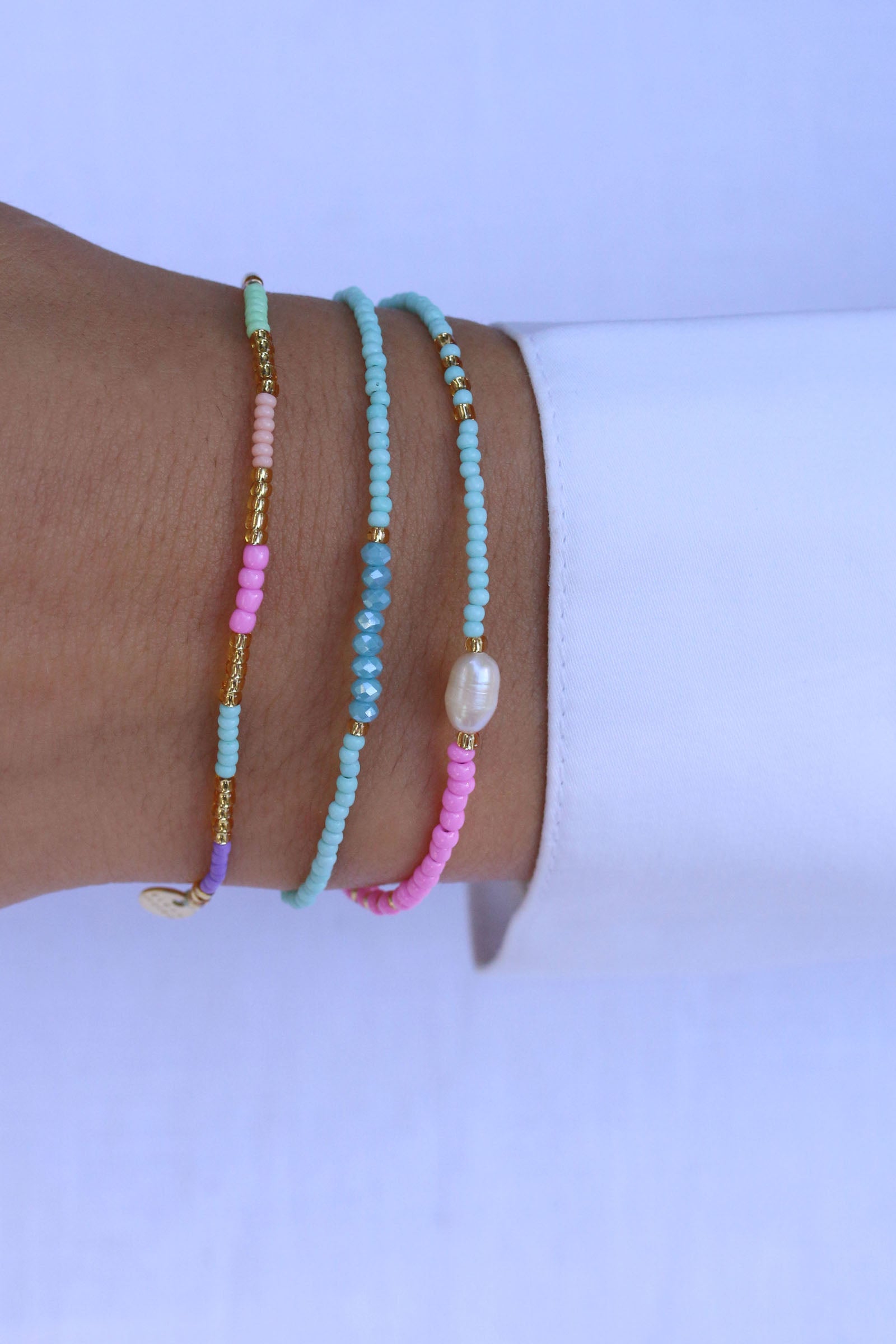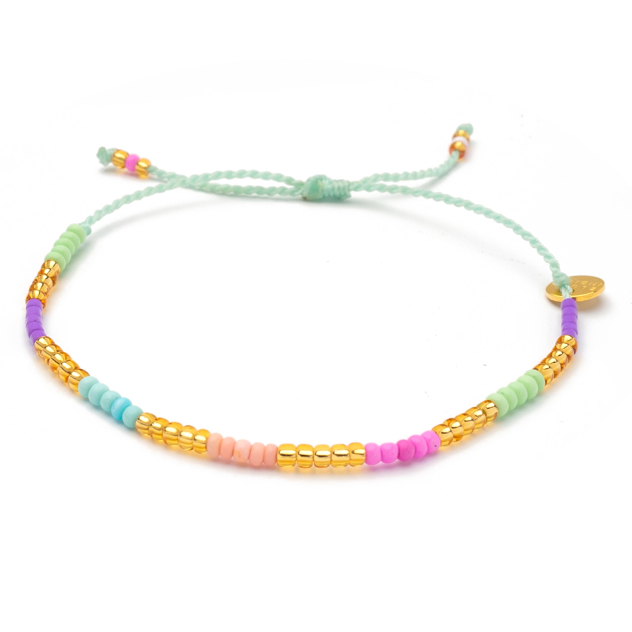 Das Armband Hortencia aus unserer Sweet-String-Serie wurde mit Sorgfalt und Liebe zum Detail handgefertigt. Matte Perlen in den Farben Mintgrün, Violett, Himmelblau und Pink reihen sich aneinander, goldene Perlen verleihen dem Armband einen eleganten Touch.