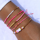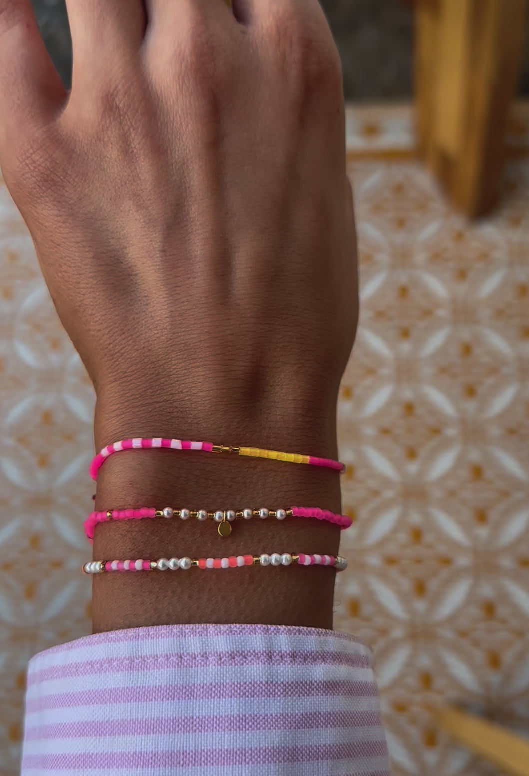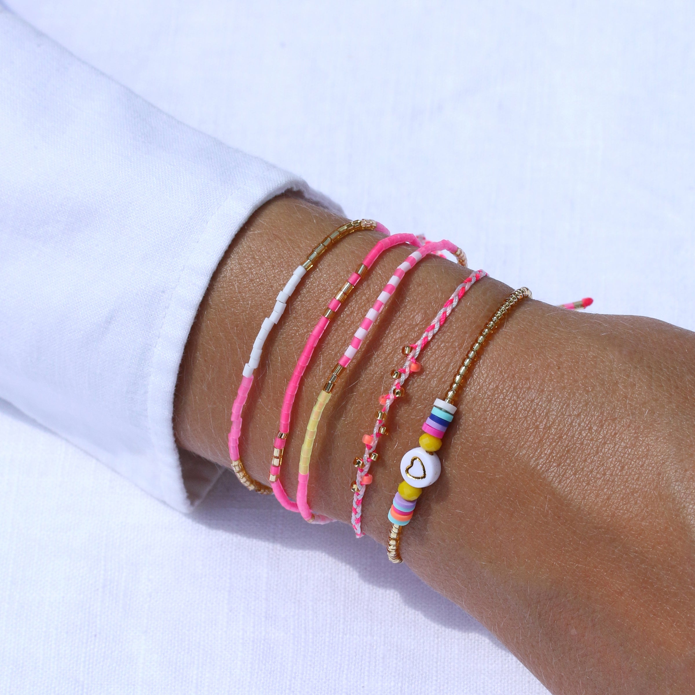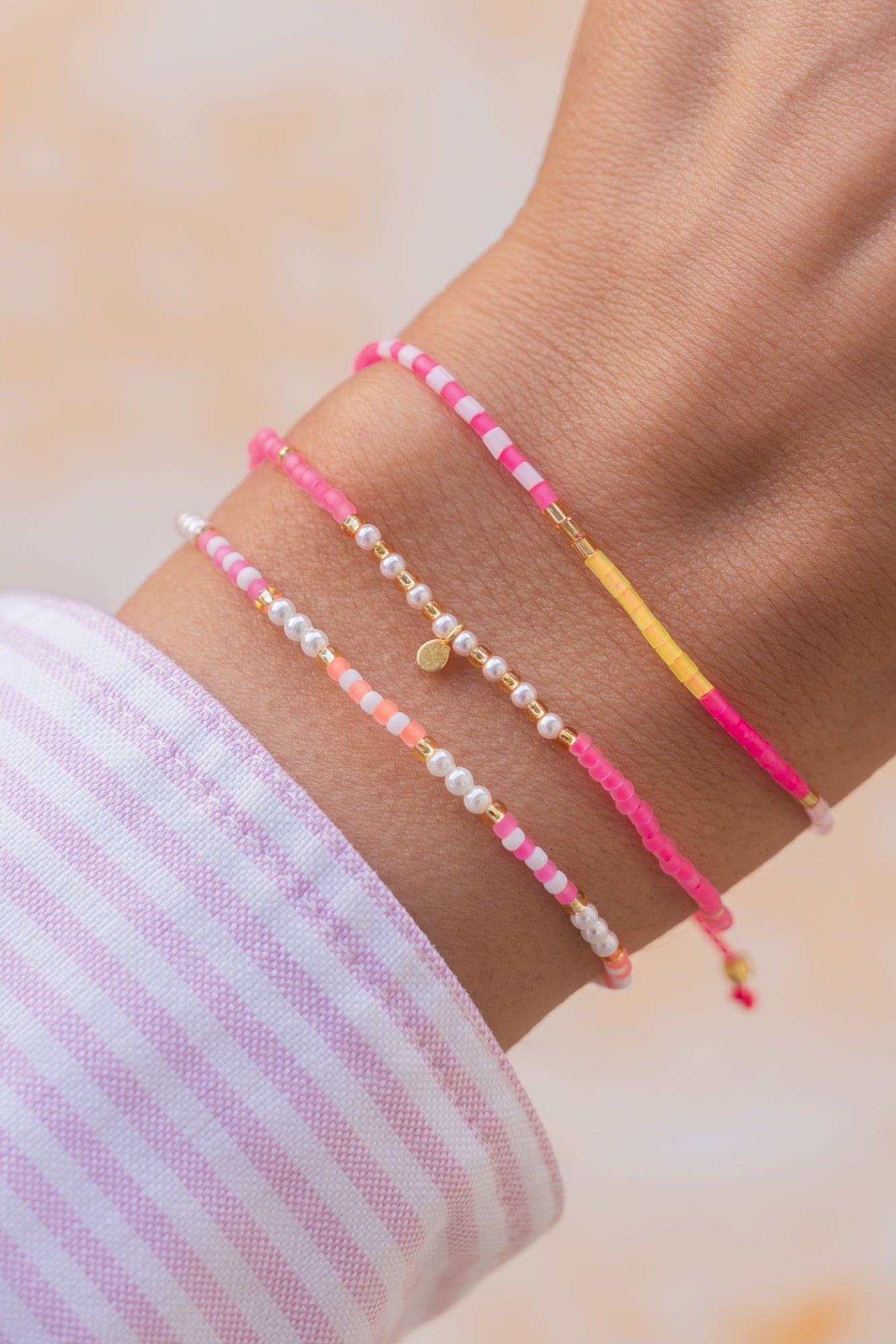 Das goldene Armband Malibu aus unserer Sweet-String-Serie ist ein Farb-Feuerwerk in Neon Pink, Mangogelb, Weiß und Gold. Noch mehr pinke Highlights haben wir im Mix-Set Malibu für dich zusammengestellt.