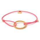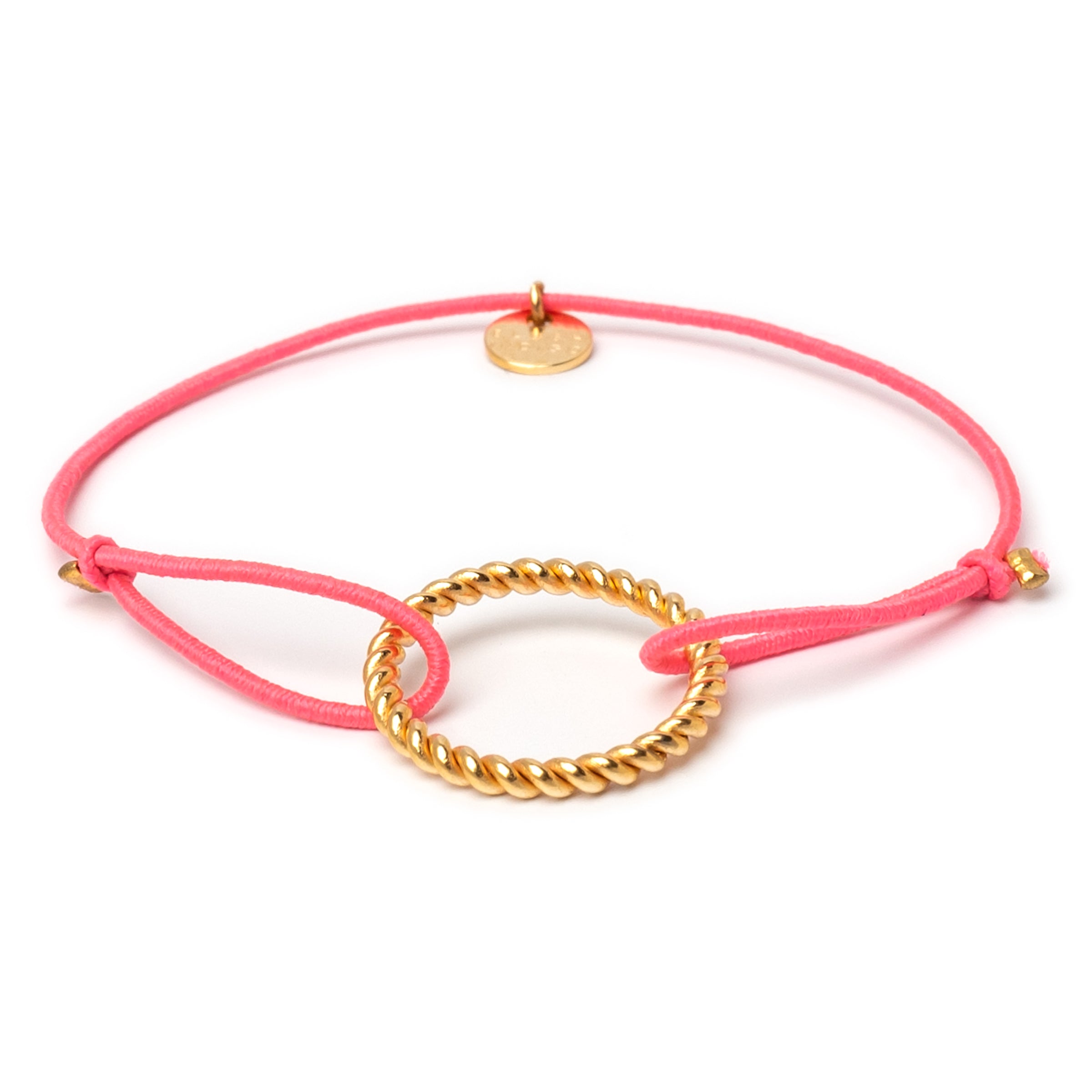 Das Armband Darling Circle hat das Zeug zum Lieblingsstück in deinem Schmuckkästchen. Das elastische Nylon-Band in Watermelon Pink schmiegt sich elegant an dein Handgelenk. Strahlender Mittelpunkt ist der gedrehte kreisförmige Circle-Anhänger aus 24k vergoldetem Edelstahl.