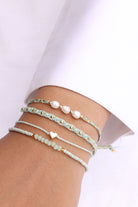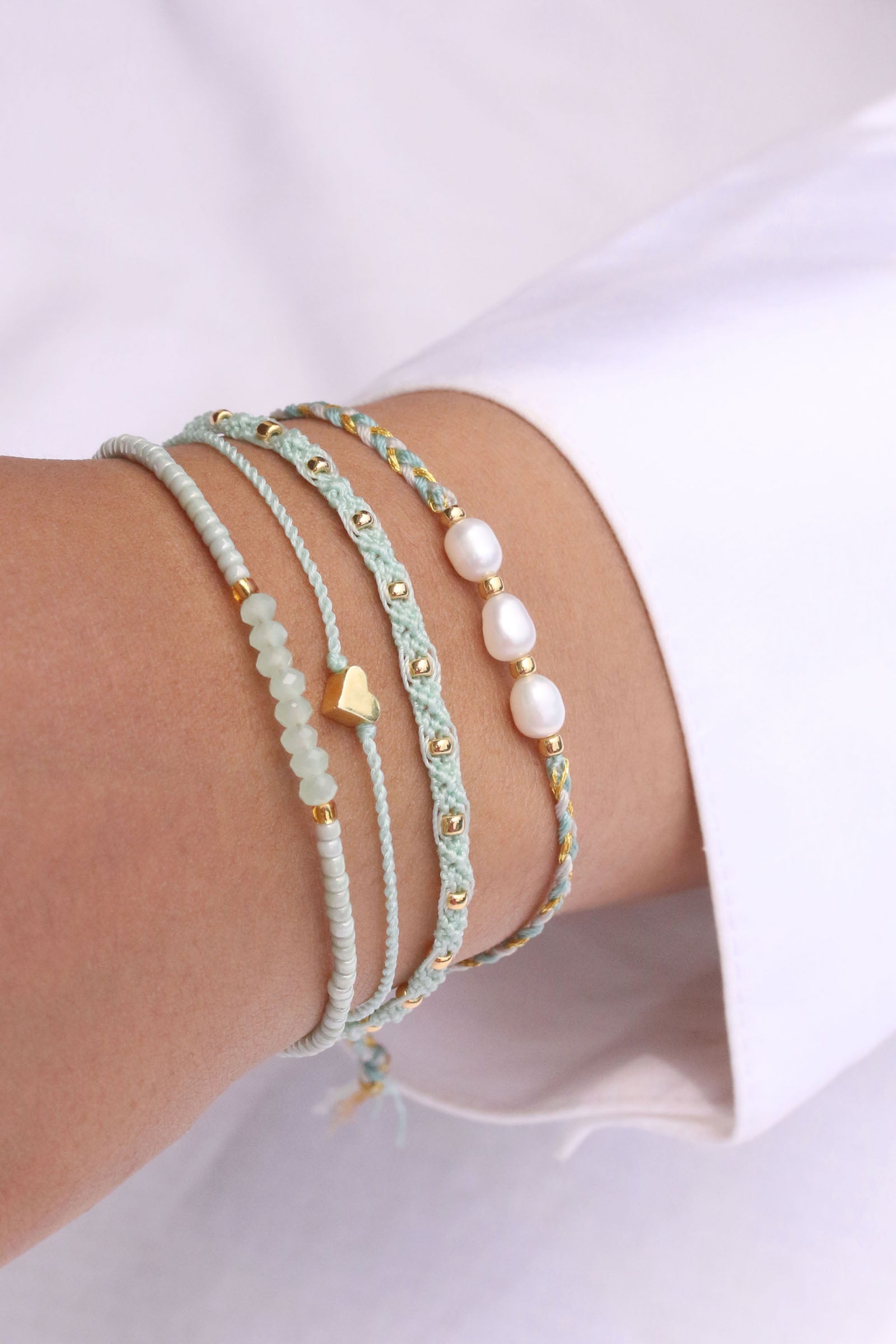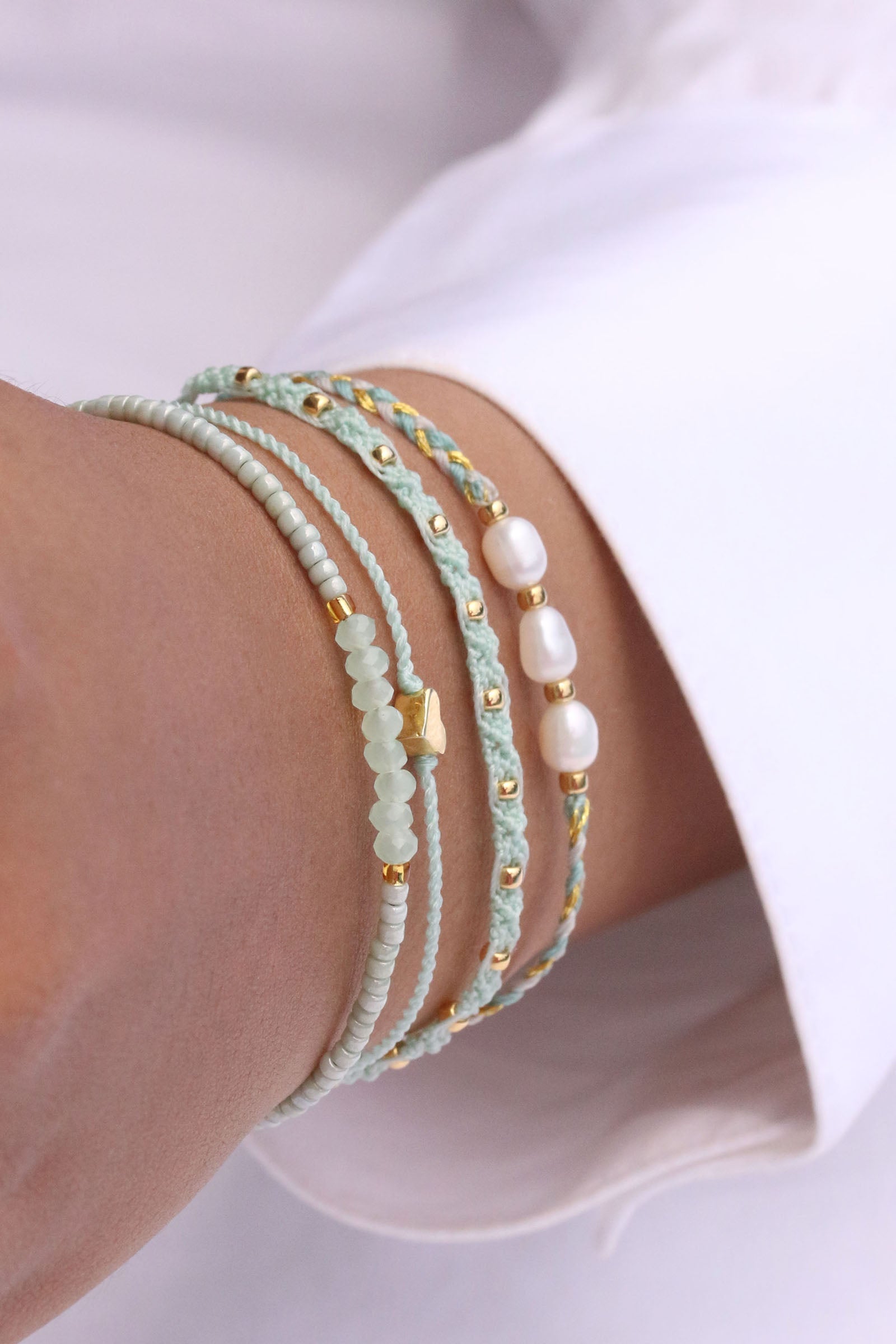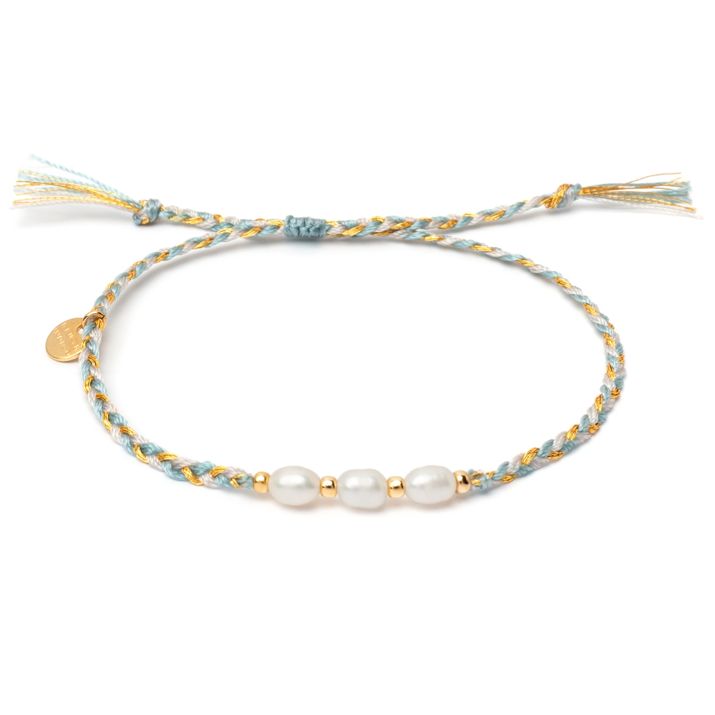 Unser Dolce-Armband ist eine geflochtene Farb-Sinfonie in den Farben Ocean Green, Beige und Gold. Drei mittig aufgefädelte Süßwasserperlen bringen Sommerferien-Stimmung ans Handgelenk.