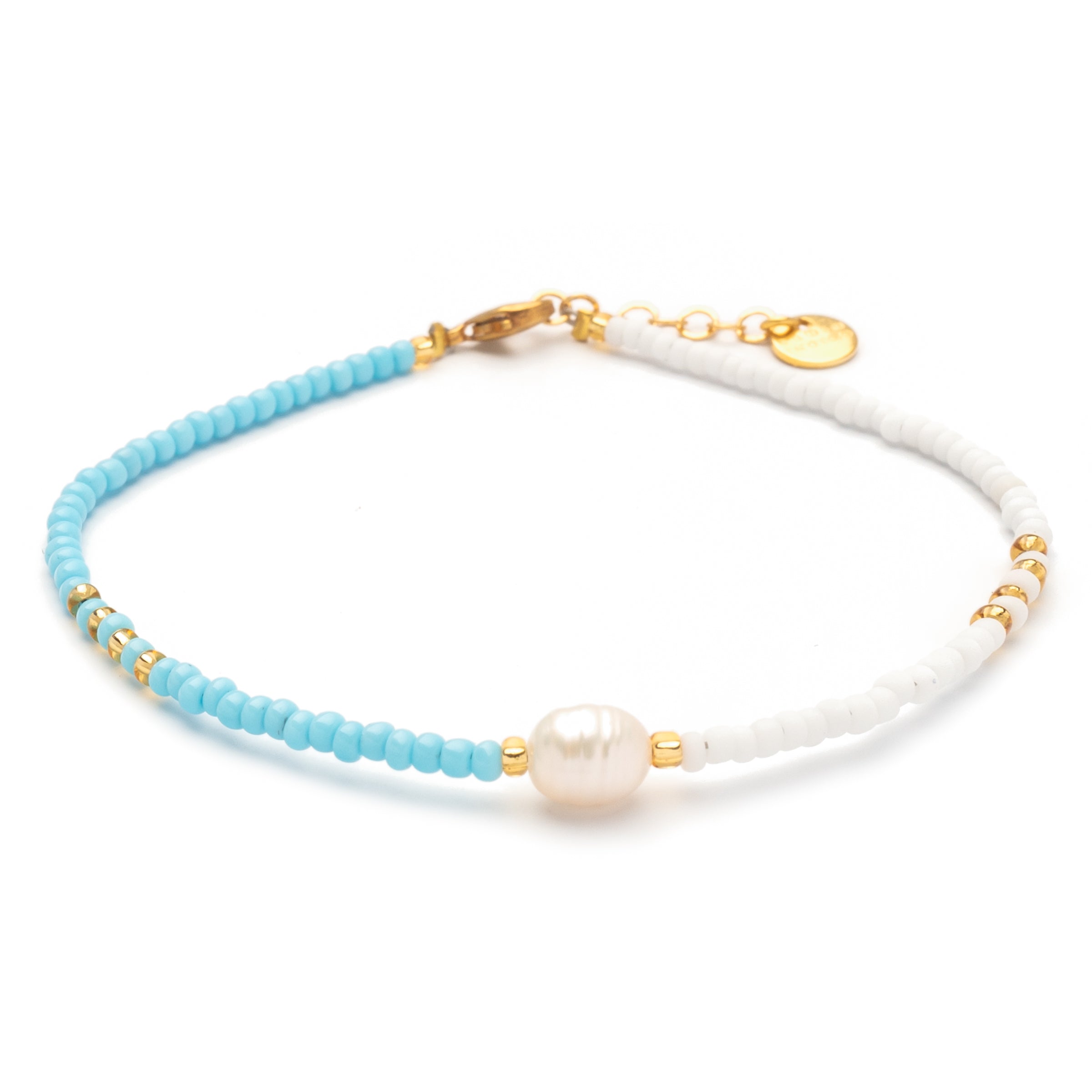 Das Armband Azzurro aus unserer Isola-Serie ist ein zweifarbiger Pastell-Mix im zeitlosen Design: Die eine Hälfte des Armbands besteht aus matten türkisfarbenen Perlen, die andere Hälfte besteht aus matten weißen Perlen. Eine Süßwasserperle ist der strahlende Mittelpunkt, eingerahmt von vereinzelten goldenen Perlen.
