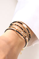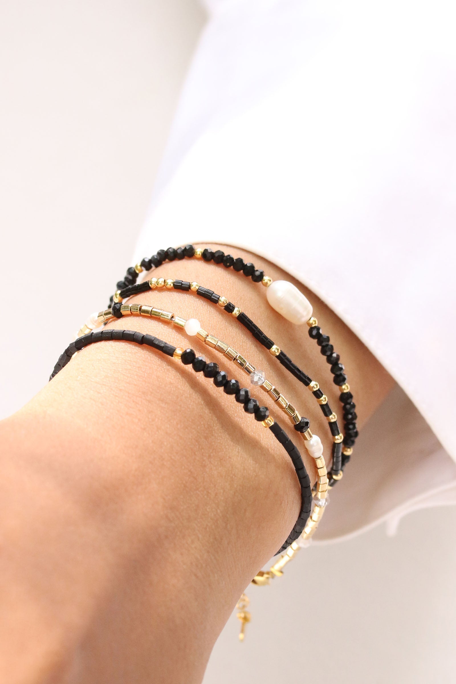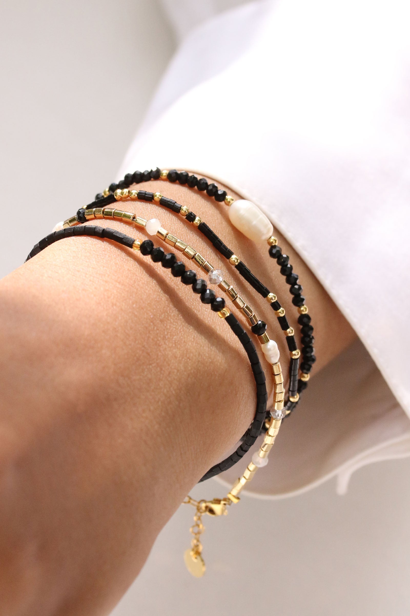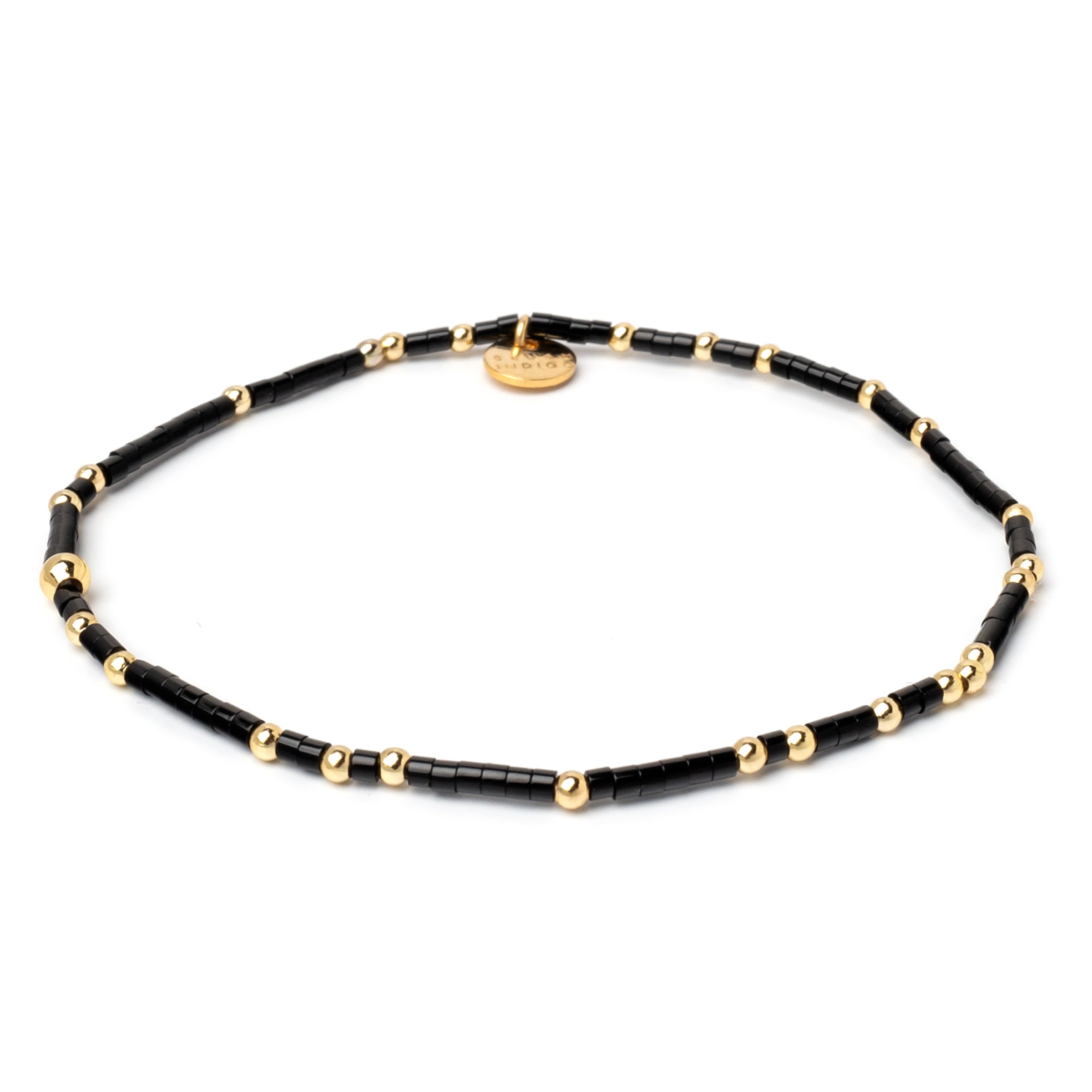 Unser einfarbiges Armband Jelly eignet sich besonders gut zum Mischen mit anderen Armbändchen. In der Farbe Schwarz bringt es Glanz in jeden wilden Armband-Mix aus Mustern oder Neontönen. Goldenen Metallperlen setzen elegante Akzente.