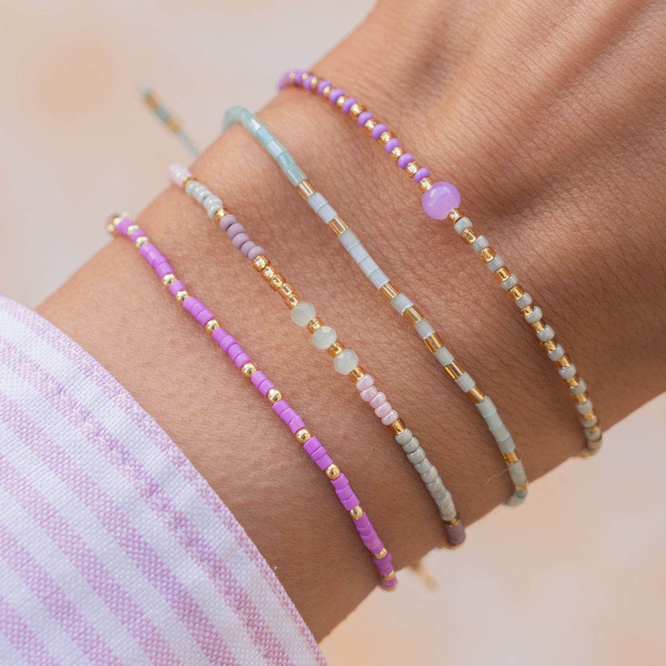 Unsere Lieblingsfarben geben den Ton an bei unserem goldenen Armband-Set Gibraltar: Flieder und Fresh Mint vereinen sich zu einer frühlingsfrischen Sinfonie am Handgelenk.