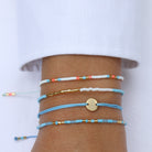 Das Armband-Quartett Sand Tropez aus unseren Serien Sweet String, Darling Disc und Amalfi zaubert die Farben der Côte d’Azur an unser Handgelenk. Mattweiße und türkisblaue Perlen und Bändchen geben den Ton an. Für zusätzliche Farbtupfer sorgen Perlen in Frosted Coral und Gold.