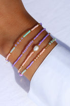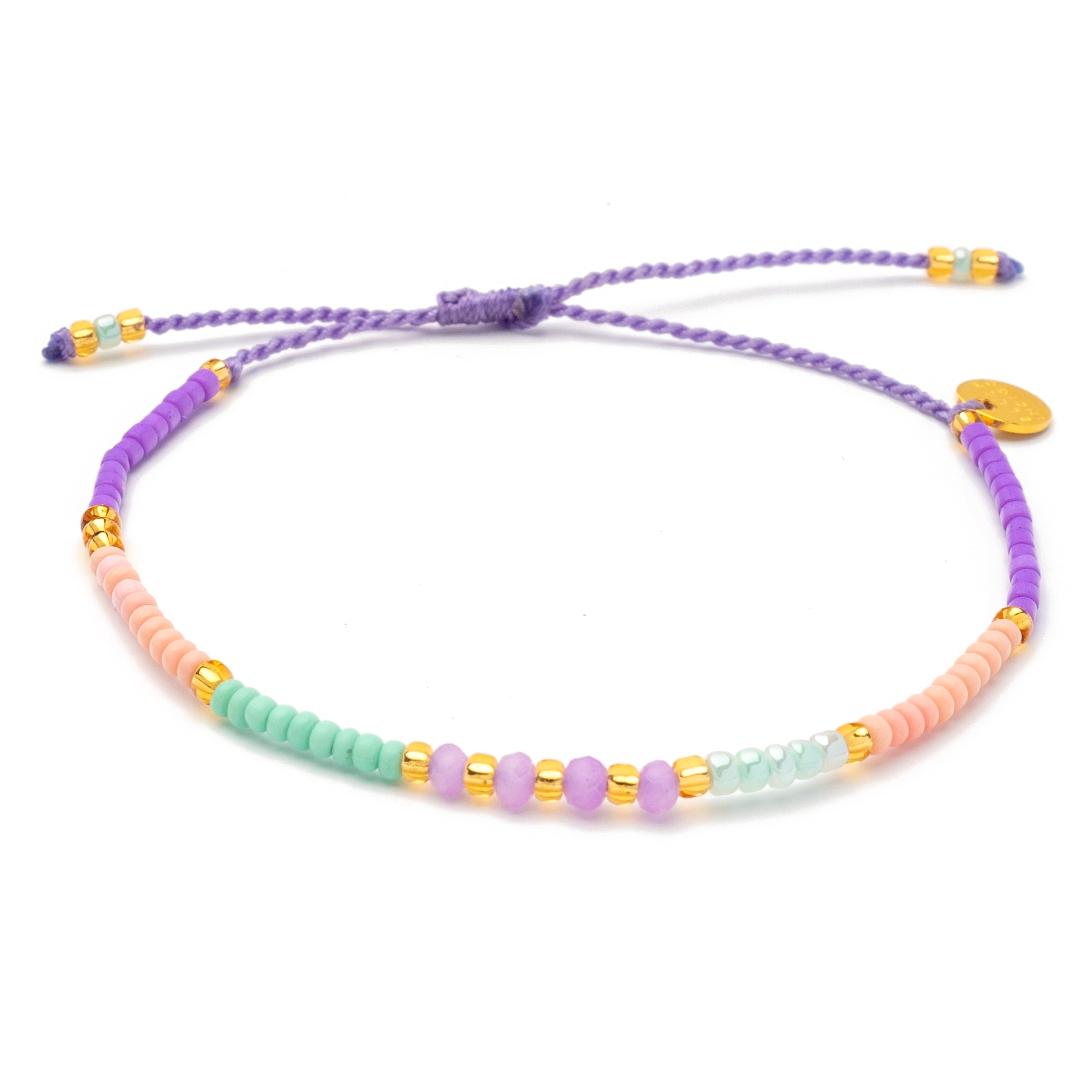 Das Armband Dahlia aus unserer Sweet-String-Serie wurde mit Sorgfalt und Liebe zum Detail handgefertigt. Matte Perlen in Flieder, Blush und Mintgrün reihen sich aneinander, goldene Perlen und vier matte violette Kristallperlen verleihen dem Armband einen eleganten Touch.