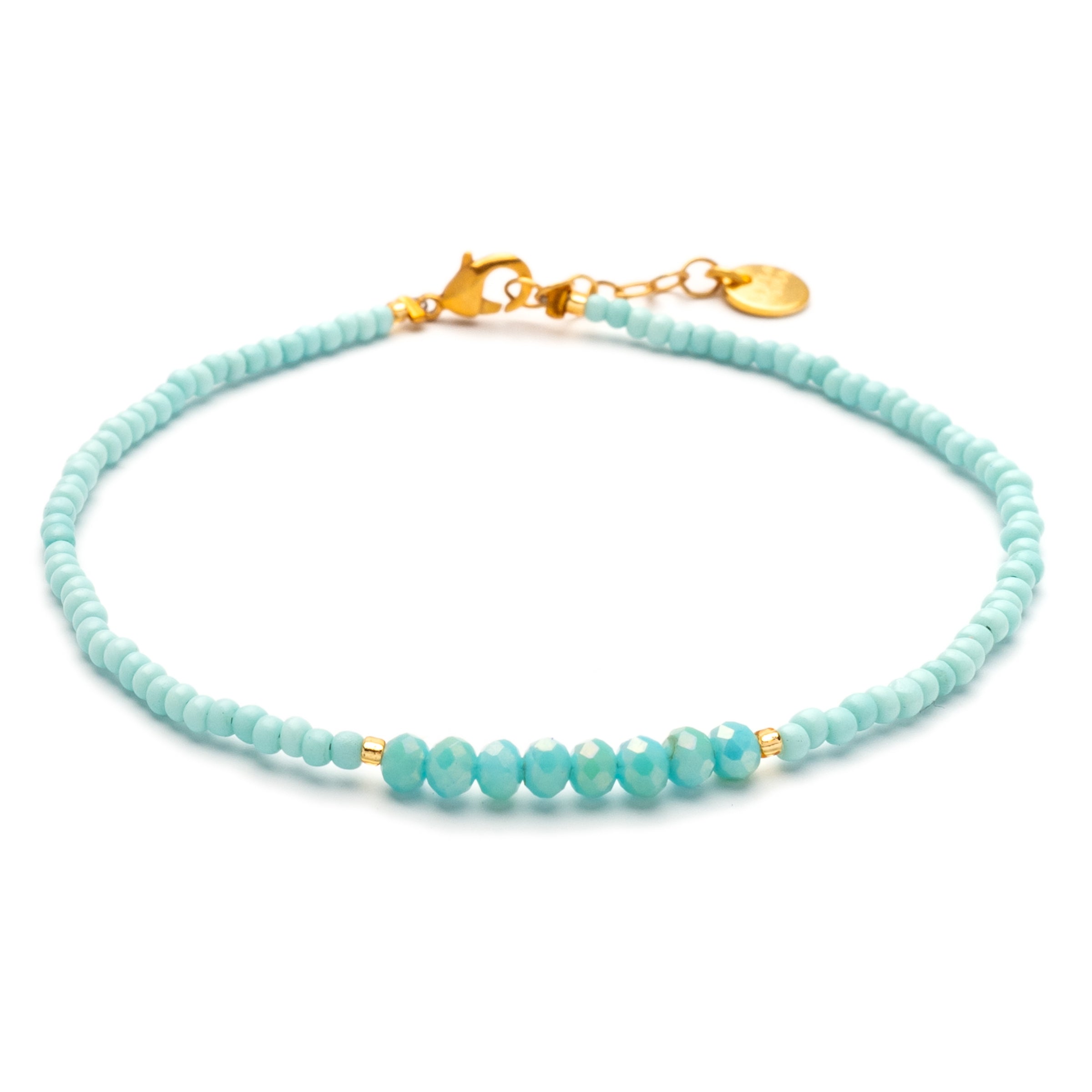 Acht facettierte Kristallperlen bilden den krönenden Mittelpunkt unserer monochromen Tiara-Serie. Das Modell Frosted Sky kombiniert hellblaue Roccaille-Perlen mit funkelnden Kristallperlen.
