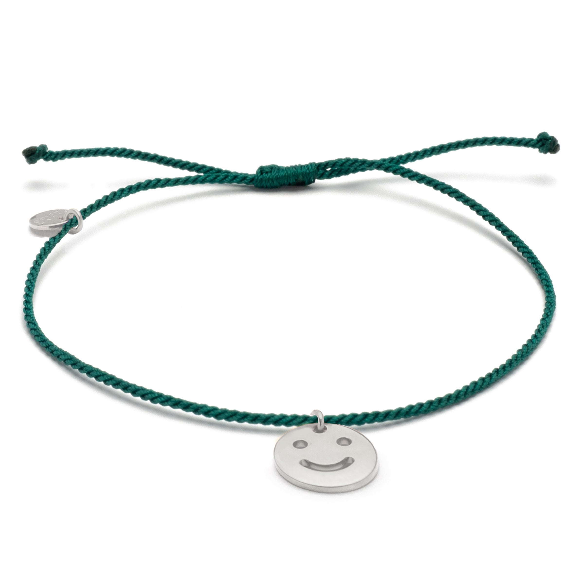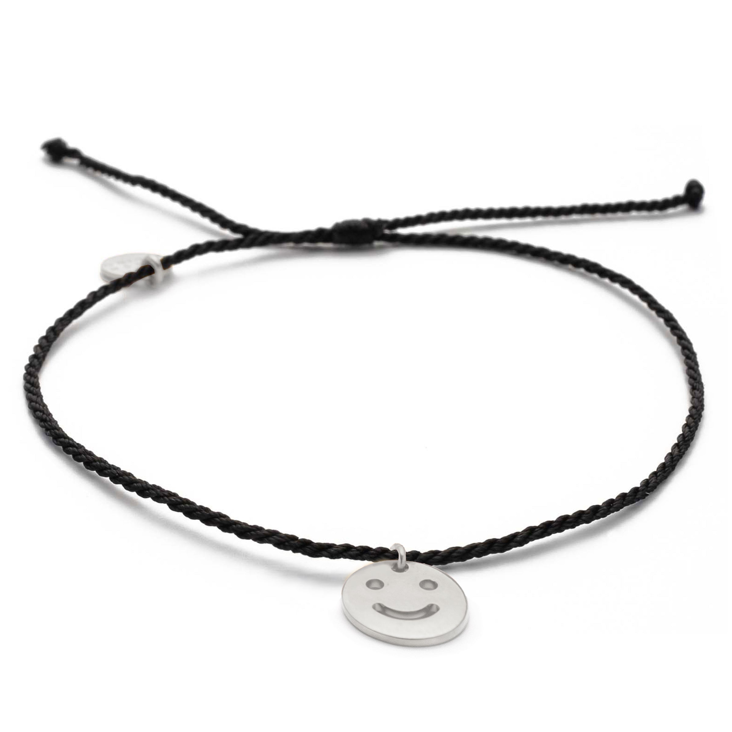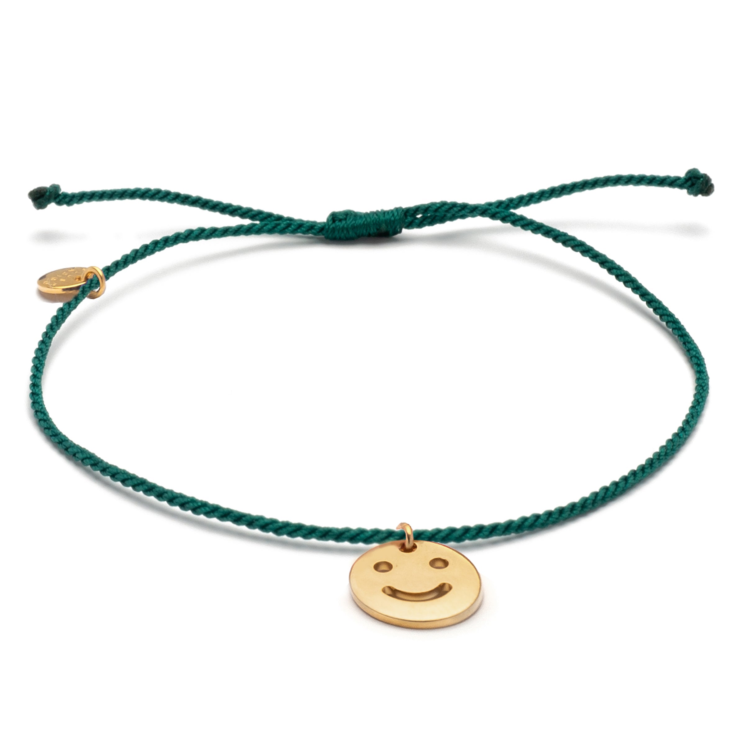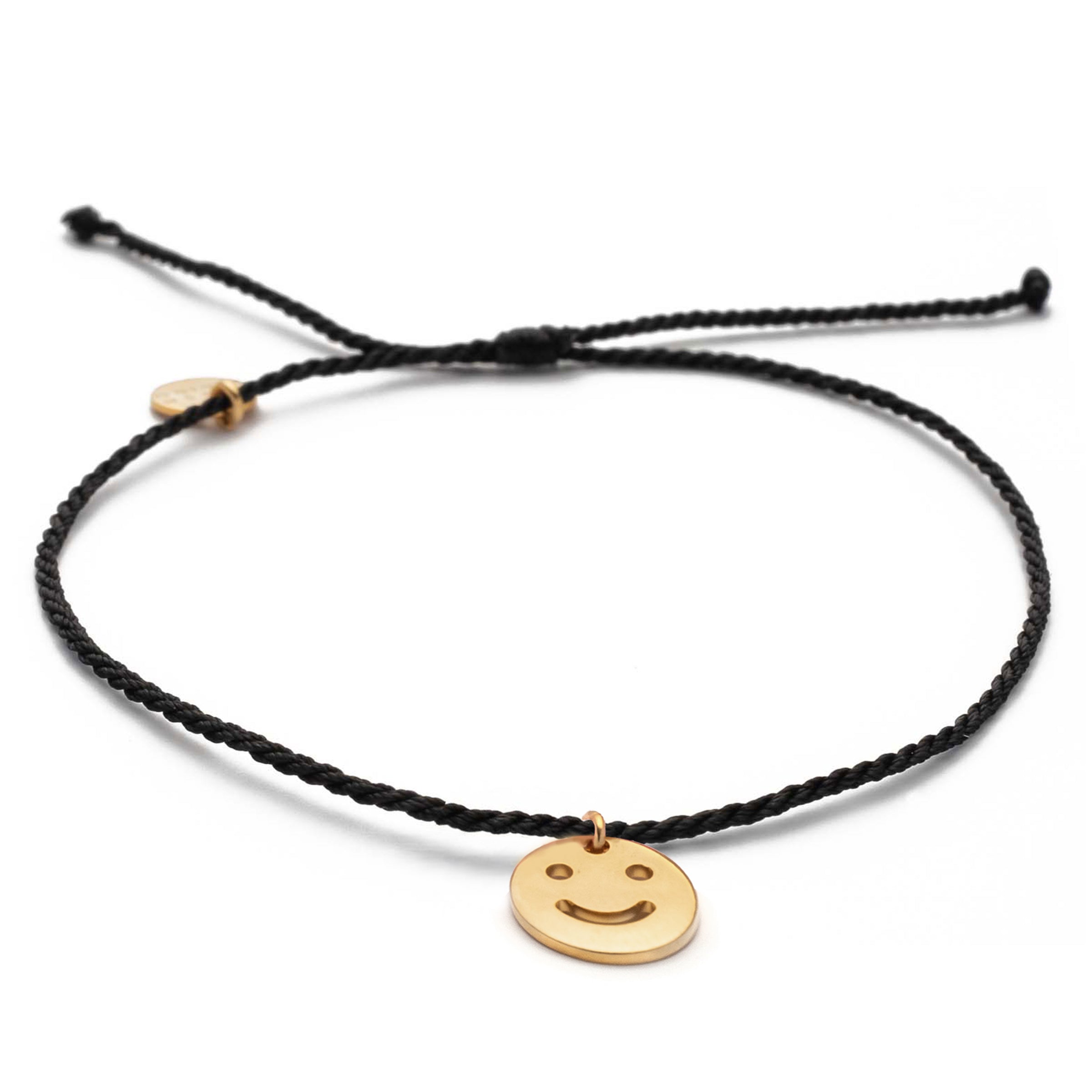 Der kreisrunde 10 mm Smiley-Anhänger ist in Gold und Silber erhältlich. Das Bändchen kann durch einen Knotenverschluss in der Größe verstellt werden. Alle verwendeten Metallteile sind aus 24k vergoldeten Messing und stammen aus Deutschland und Italien.