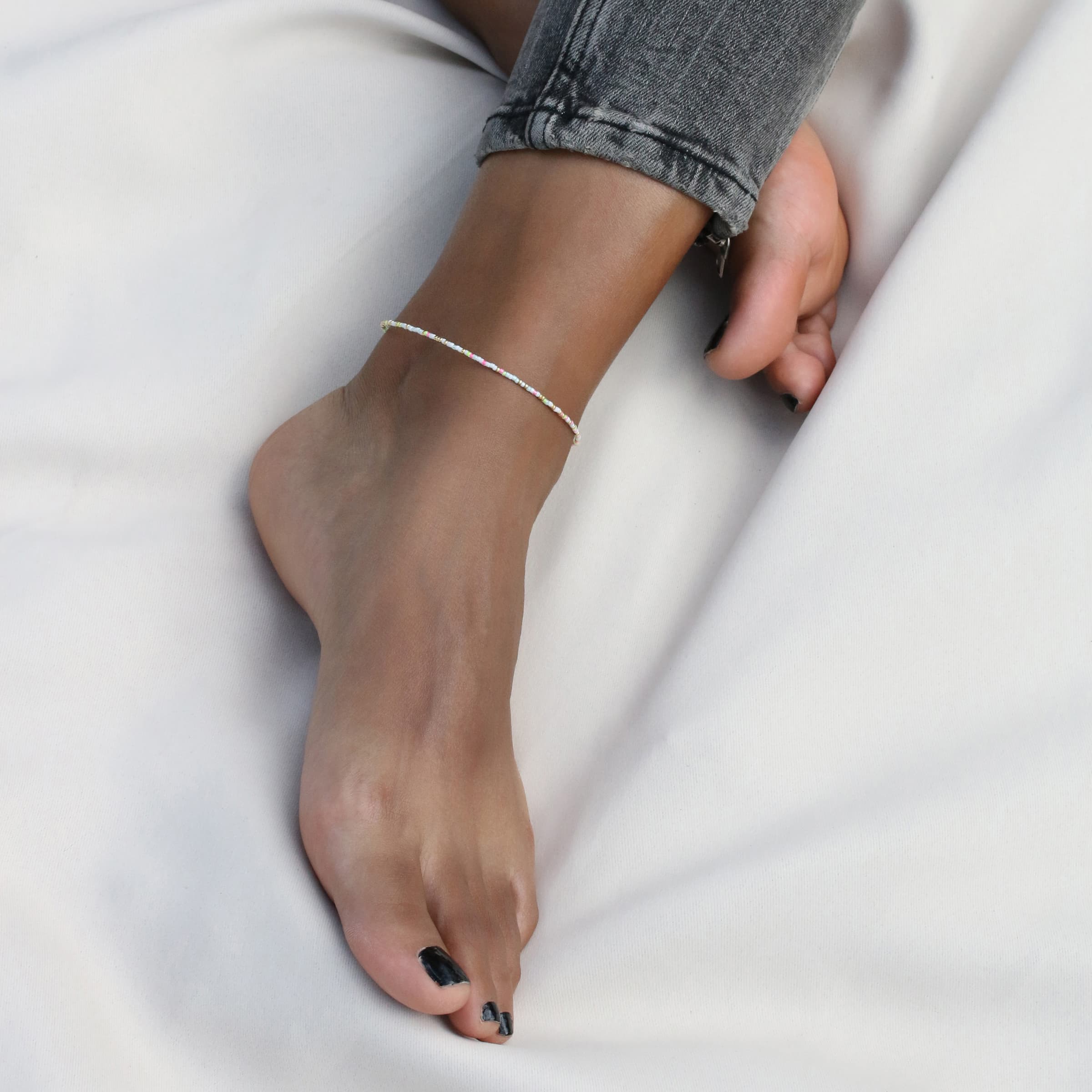 Die Anklet-Season starts now! Beim goldenen Fußkettchen im Multi Mix 1 haben wir viele bunte Perlen wild durcheinander gemixt. Die Farben Glossy Pink, Neon Gelb, Weiß und Gold stechen optisch hervor. Es eignet sich hervorragend zum Kombinieren mit anderen Anklets.