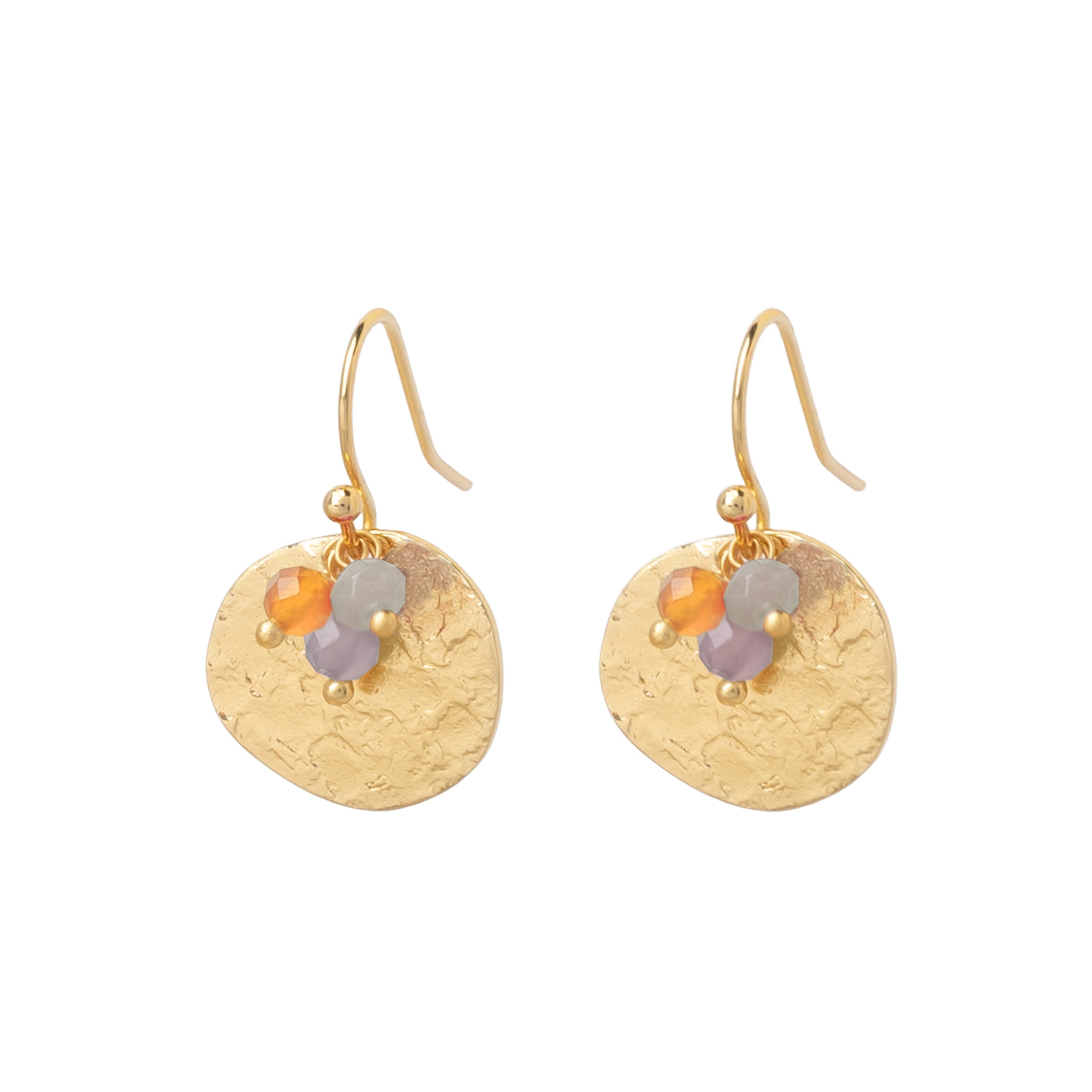 Drei sorgfältig ausgewählte Halbedelsteine verleihen dem Design eine sanfte Farbigkeit in soften Sorbet-Tönen: ein Violet Jade in zartem Fliederton, ein Light Orange Jade in warmem Apricot sowie ein grauer Labradorit mit dezentem Schimmer. Die Kombination aus natürlicher Struktur und fein abgestimmten Farben verleiht den Ohrhängern einen ruhigen, aber dennoch ausdrucksstarken Look.